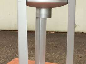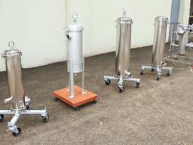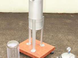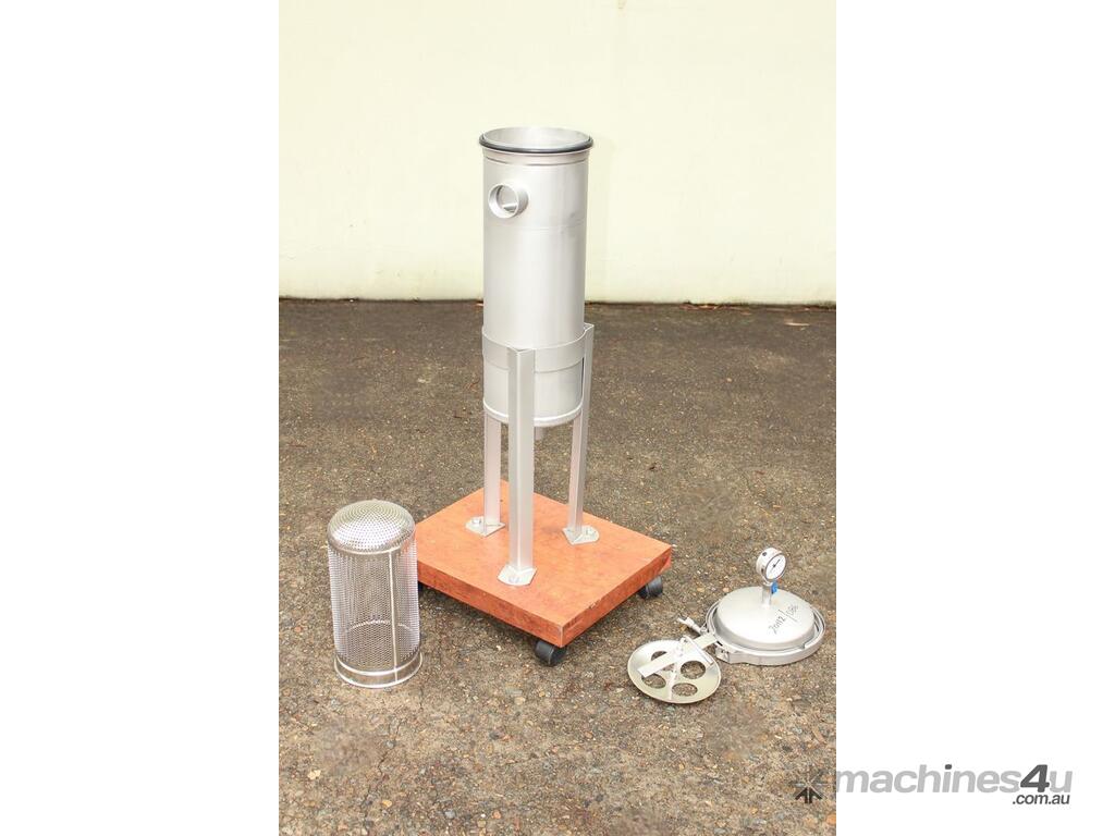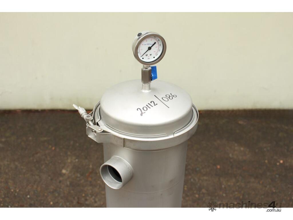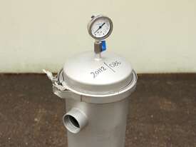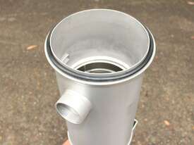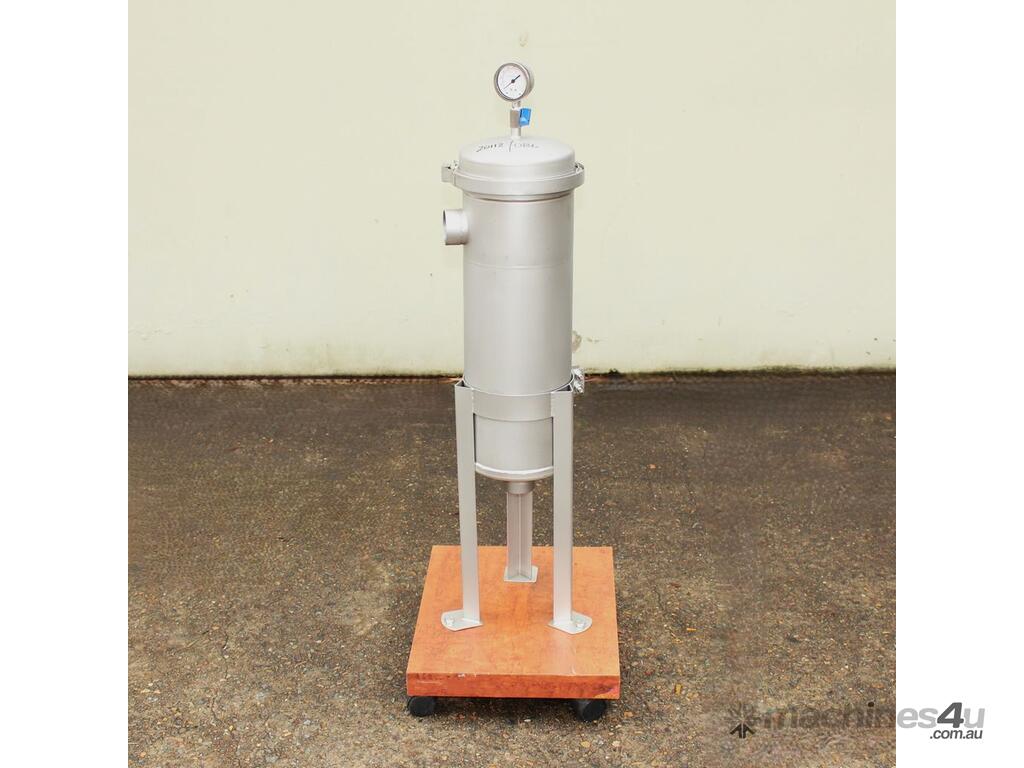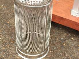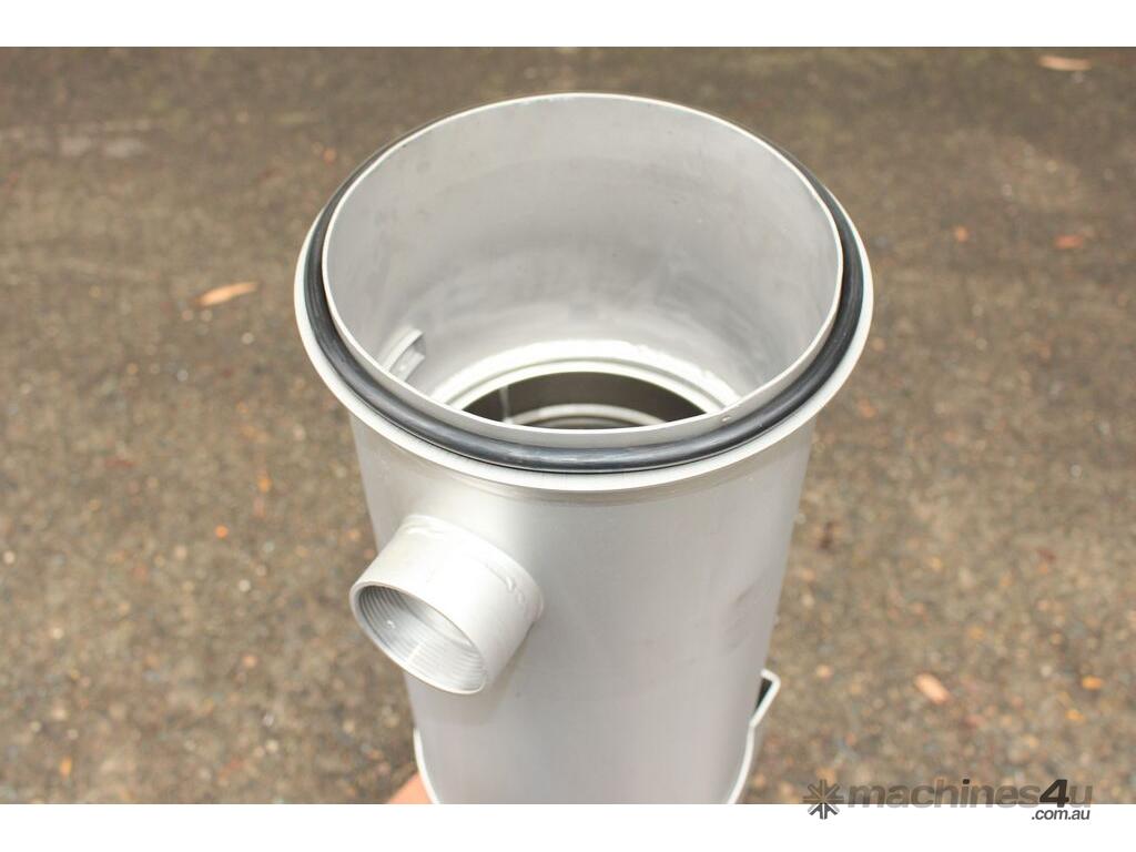 Stainless Steel Inline Filter, internal dimensions: 195mm dia x 530mm deep, 60 mm inlet x 60 mm outlet, mounted over a wooden skates