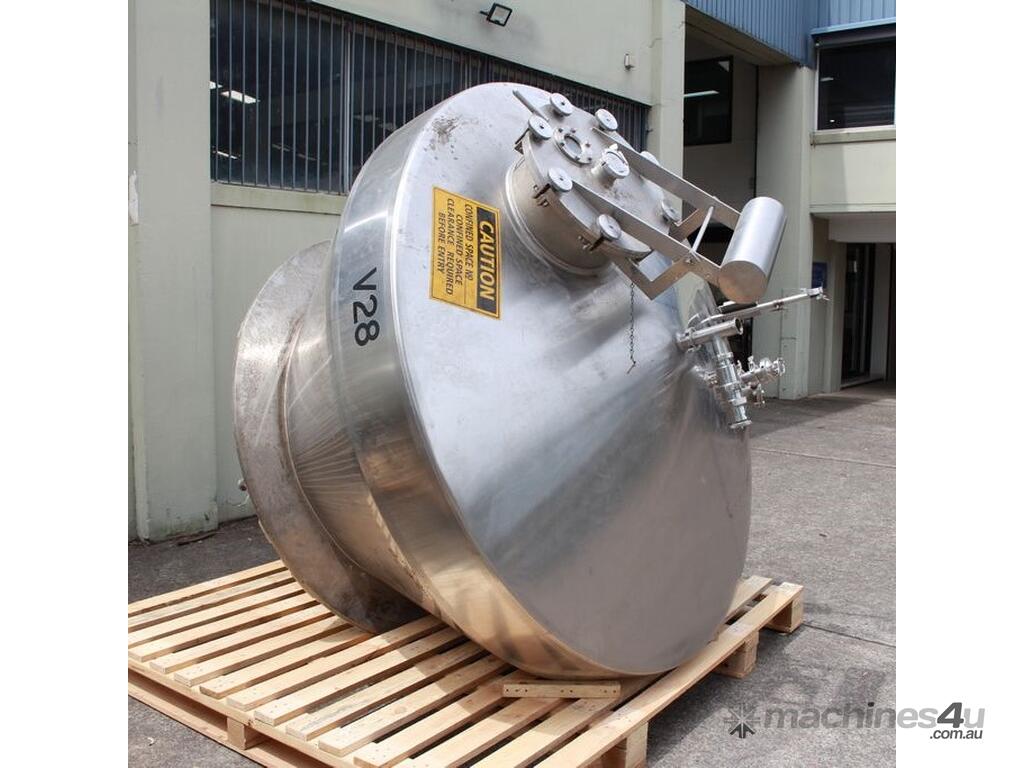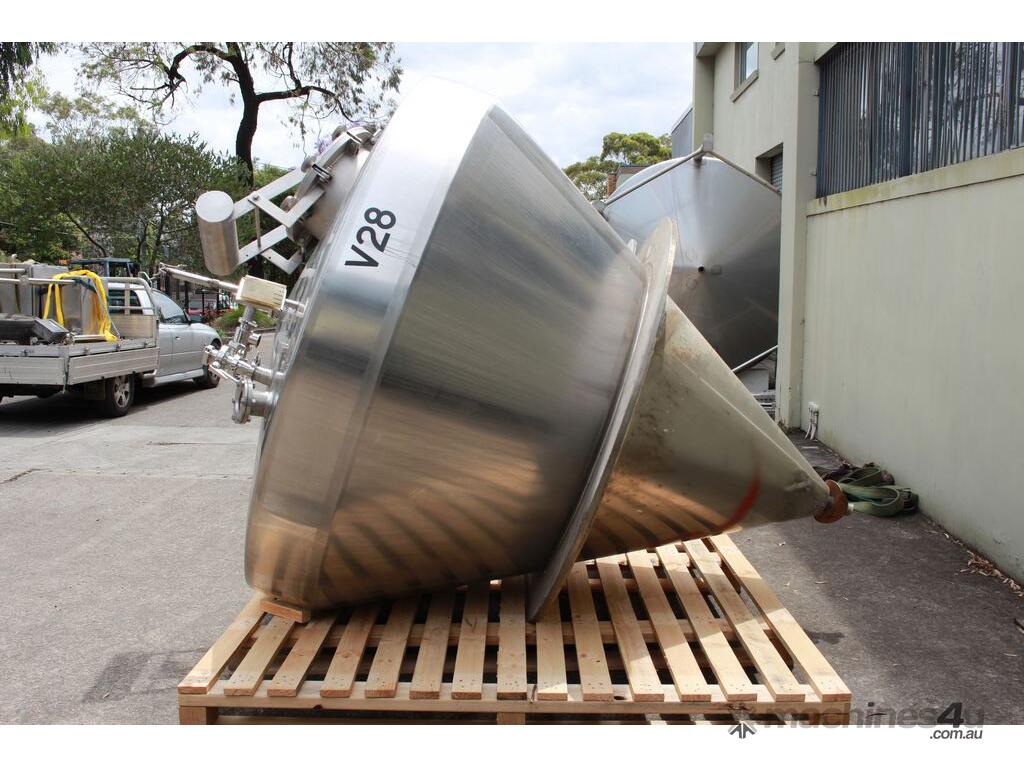 Stainless Steel Insulated Pressure Conical Vessel, "Alfa Laval", approx 2500L capacity, internal dimensions: 2100mm dia x 2160 deep, closed top with 450mm dia manway with hinged lid & inspection glass, fully insulated, test pressure 215Kpa, working pressure 140Kpa, internal dished top seamless to the deep cone with 50mm dia outlet tri clover connection, with floor mounting plate welded at half centre of the cone