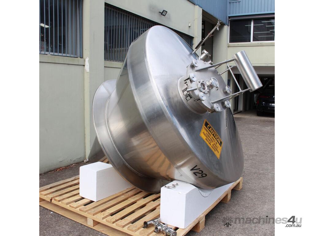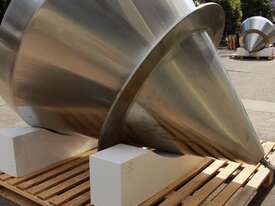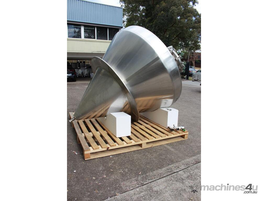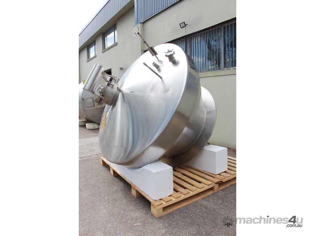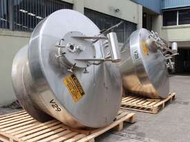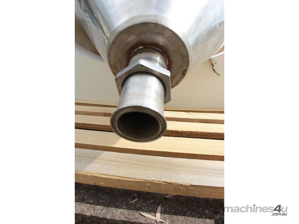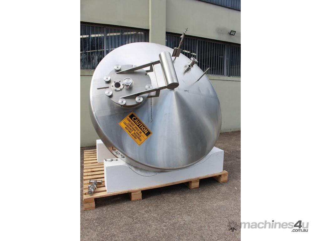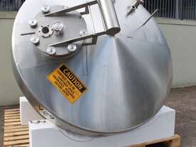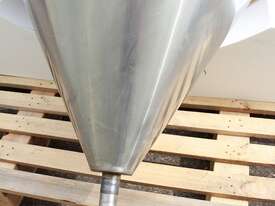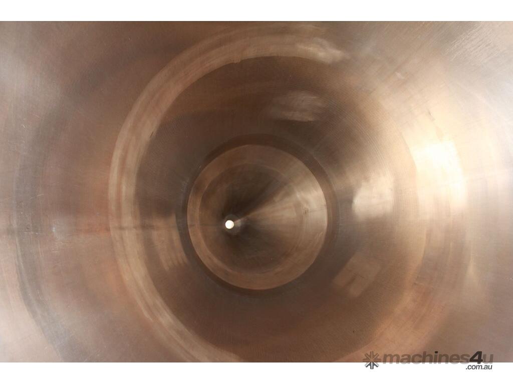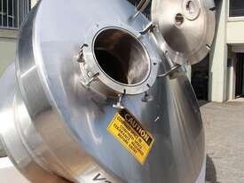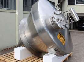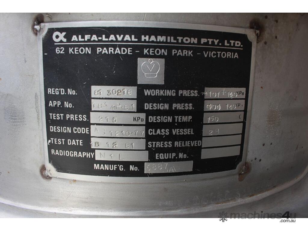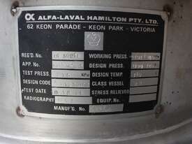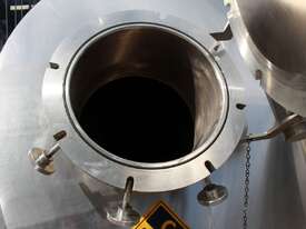 Stainless Steel Insulated Pressure Conical Vessel, "Alfa Laval", approx 2500L capacity, internal dimensions: 2100mm dia x 2160 deep, closed top with 450mm dia manway with hinged lid & inspection glass, fully insulated, test pressure 215Kpa, working pressure 140Kpa, internal dished top seamless to the deep cone with 50mm dia outlet tri clover connection, with floor mounting plate welded at half centre of the cone