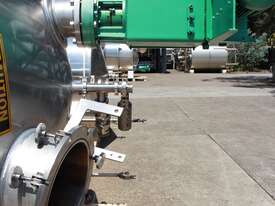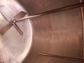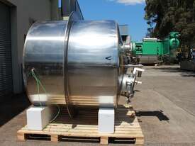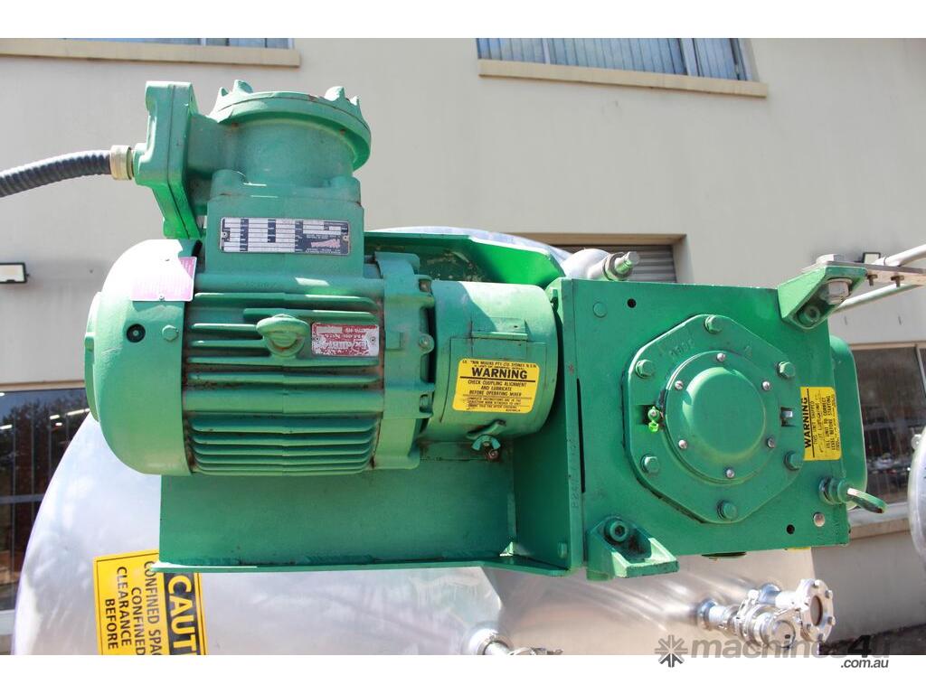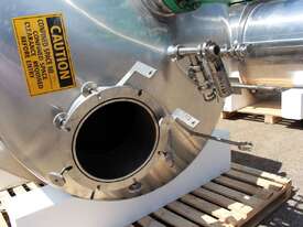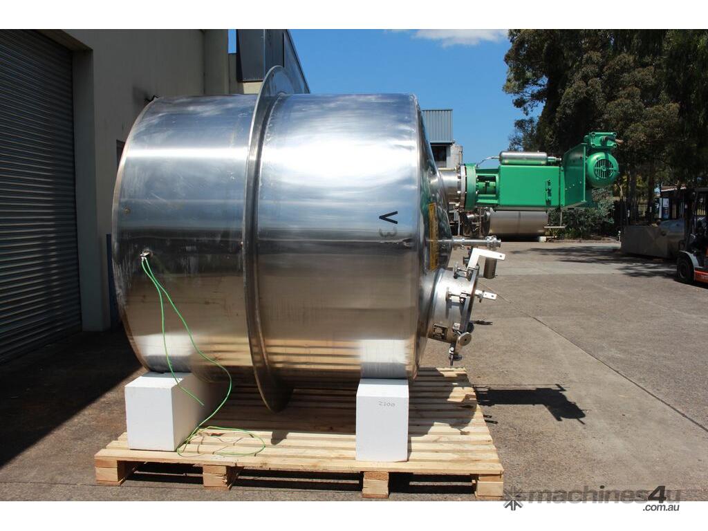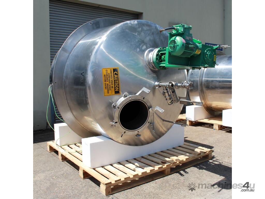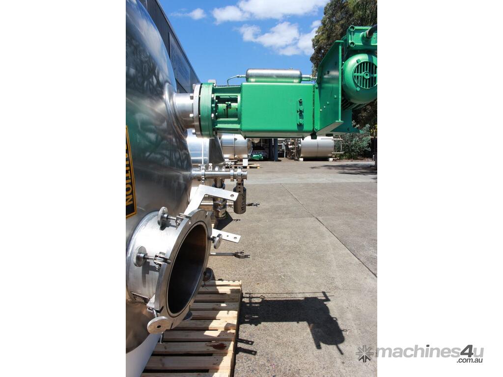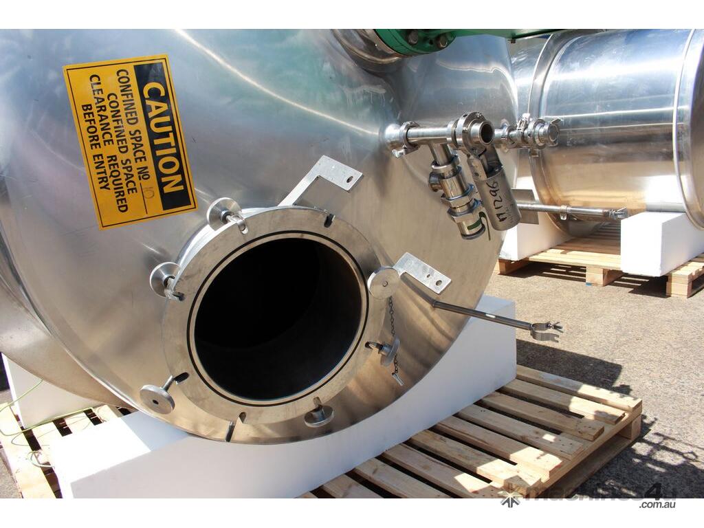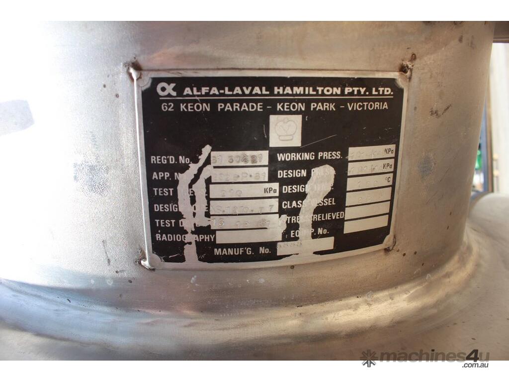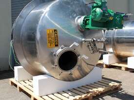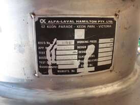 Stainless Steel Insulated Pressure Vacuum Mixing Tank, "Alfa Laval", 5000L capacity, internal dimension: 2000mm dia x 1500mm deep straight wall, dome top with 450mm dia manway with bolted down lid, multiple inlets, and a top entry flame proof mixer driven by a geared 2.2kw motor with 850mm dia turbine type propeller, fully insulated with -101kpa to +140kpa internal pressure and 150DegC design temperature, vessel is fitted with a 190mm wide ring for mezzanine mounting, 200mm deep dome bottom to a 2" tryclover outlet, SS316