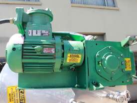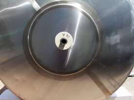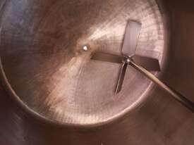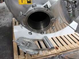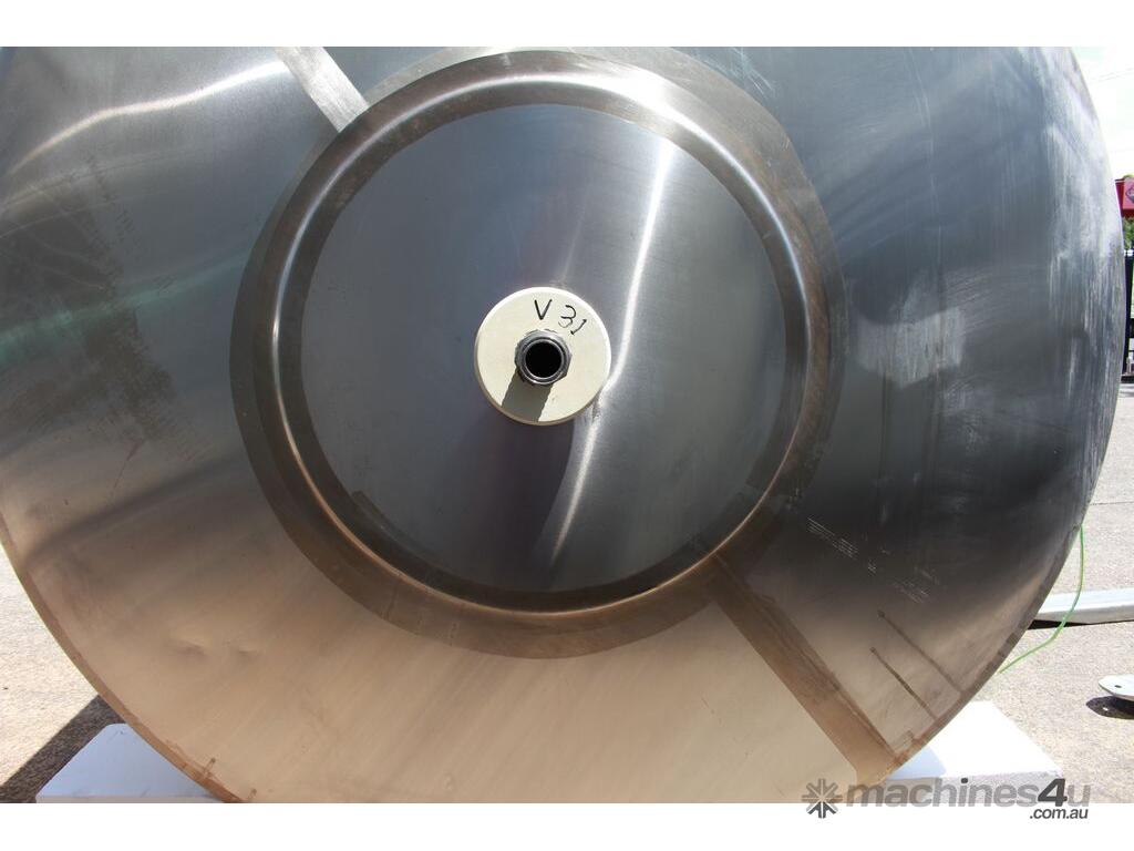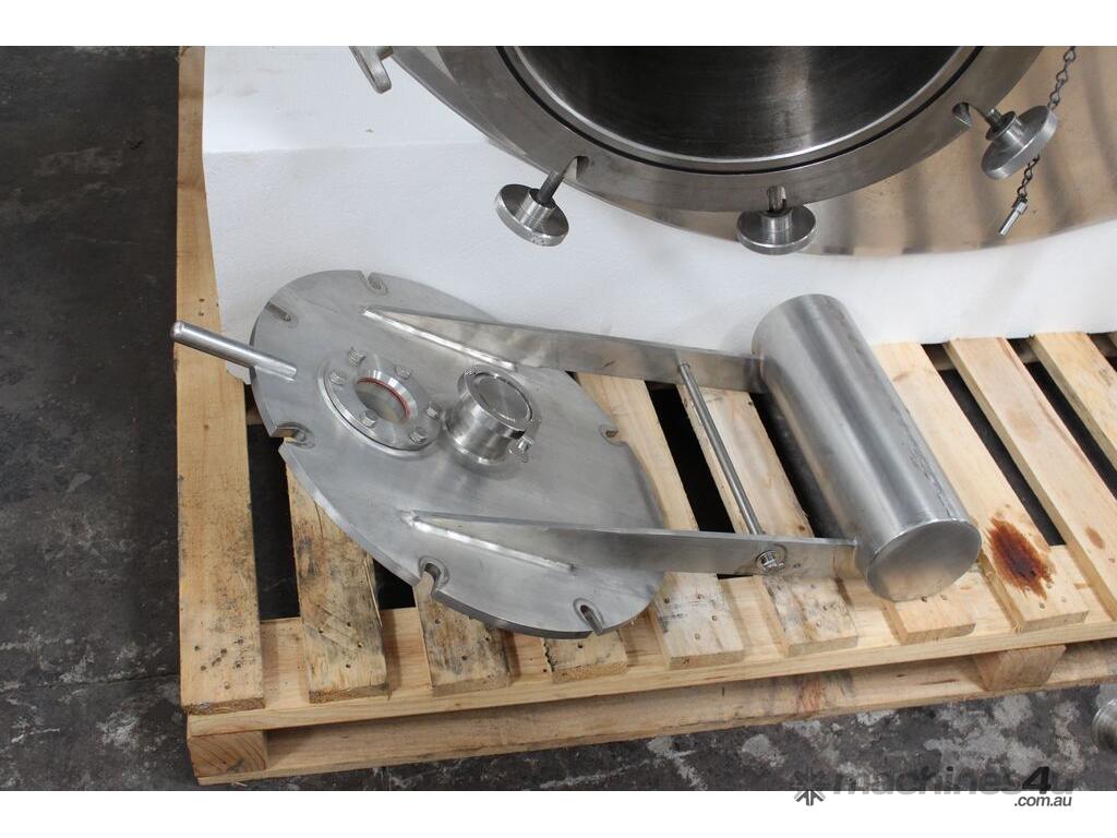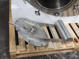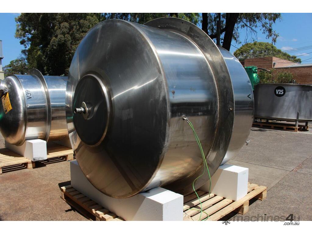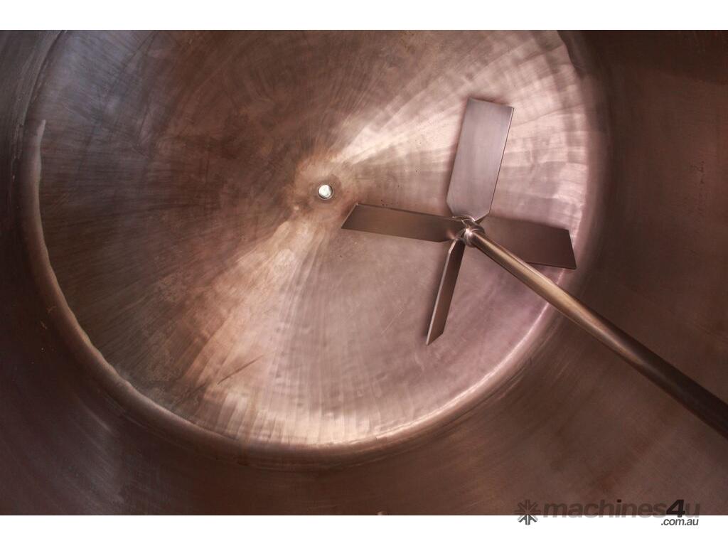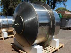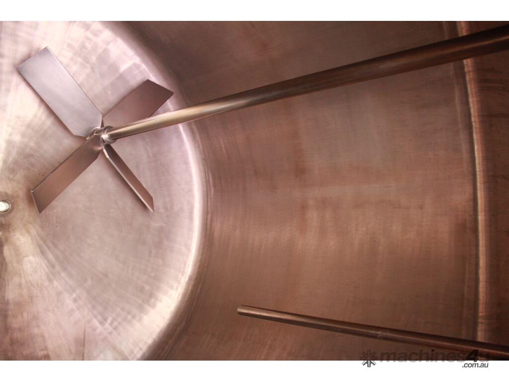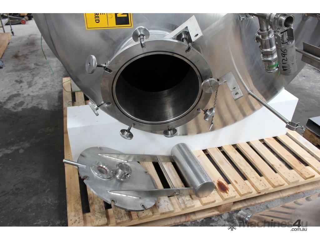 Stainless Steel Insulated Pressure Vacuum Mixing Tank, "Alfa Laval", 5000L capacity, internal dimension: 2000mm dia x 1500mm deep straight wall, dome top with 450mm dia manway with bolted down lid, multiple inlets, and a top entry flame proof mixer driven by a geared 2.2kw motor with 850mm dia turbine type propeller, fully insulated with -101kpa to +140kpa internal pressure and 150DegC design temperature, vessel is fitted with a 190mm wide ring for mezzanine mounting, 200mm deep dome bottom to a 2" tryclover outlet, SS316