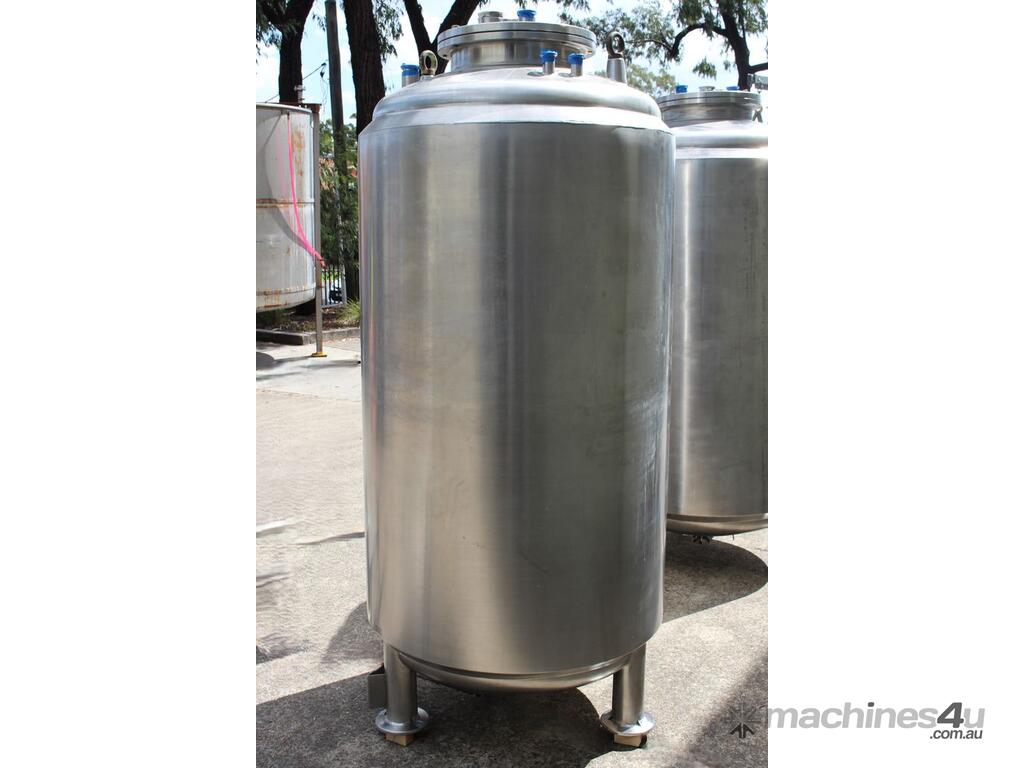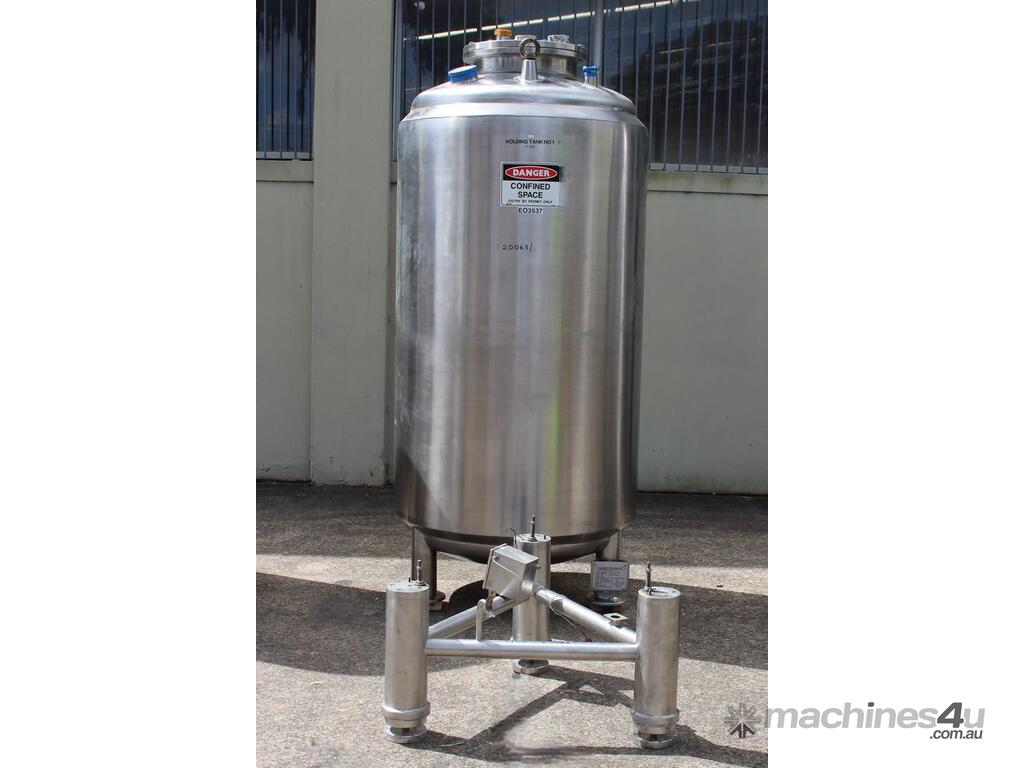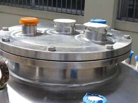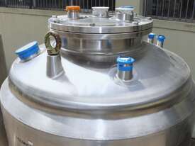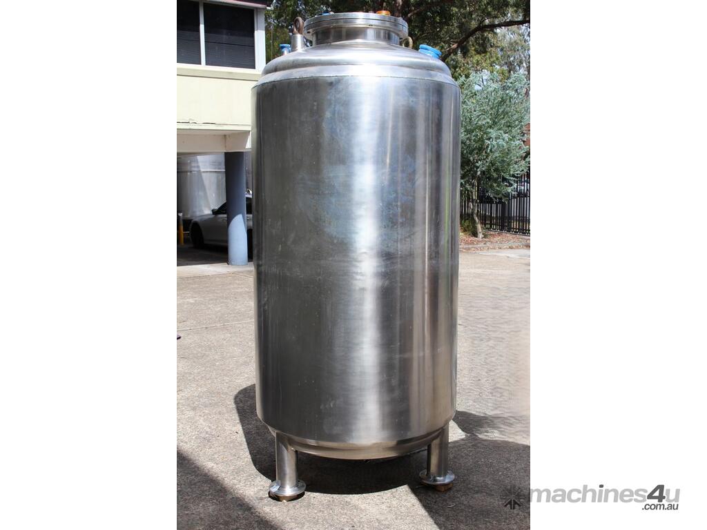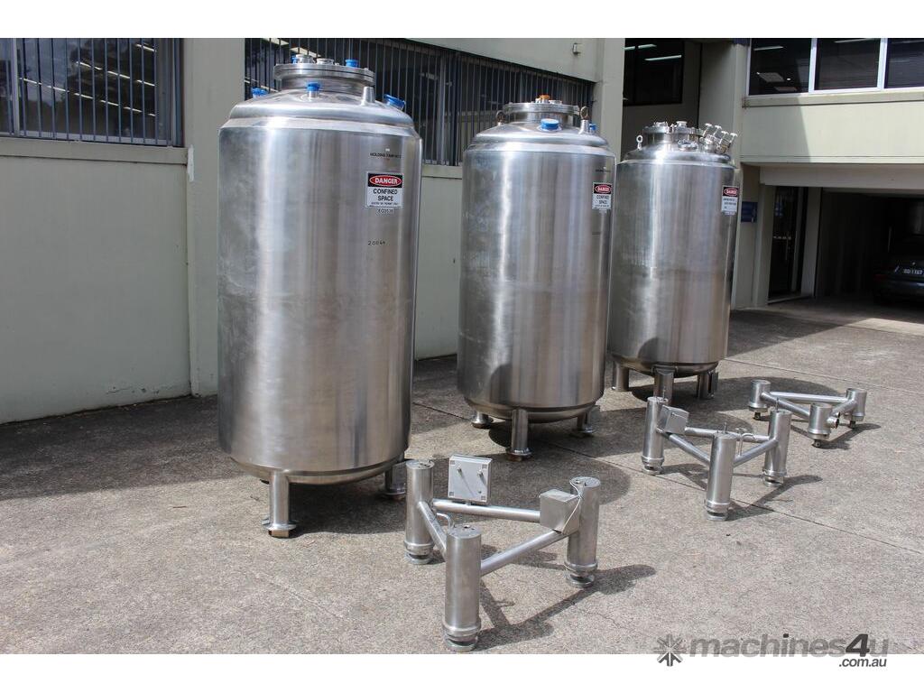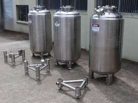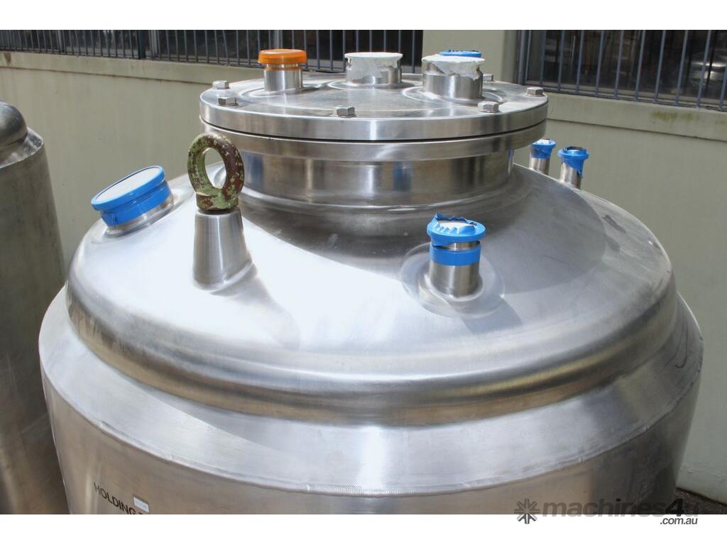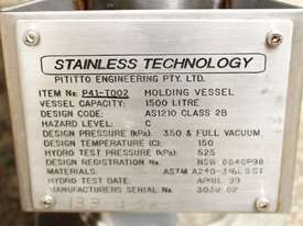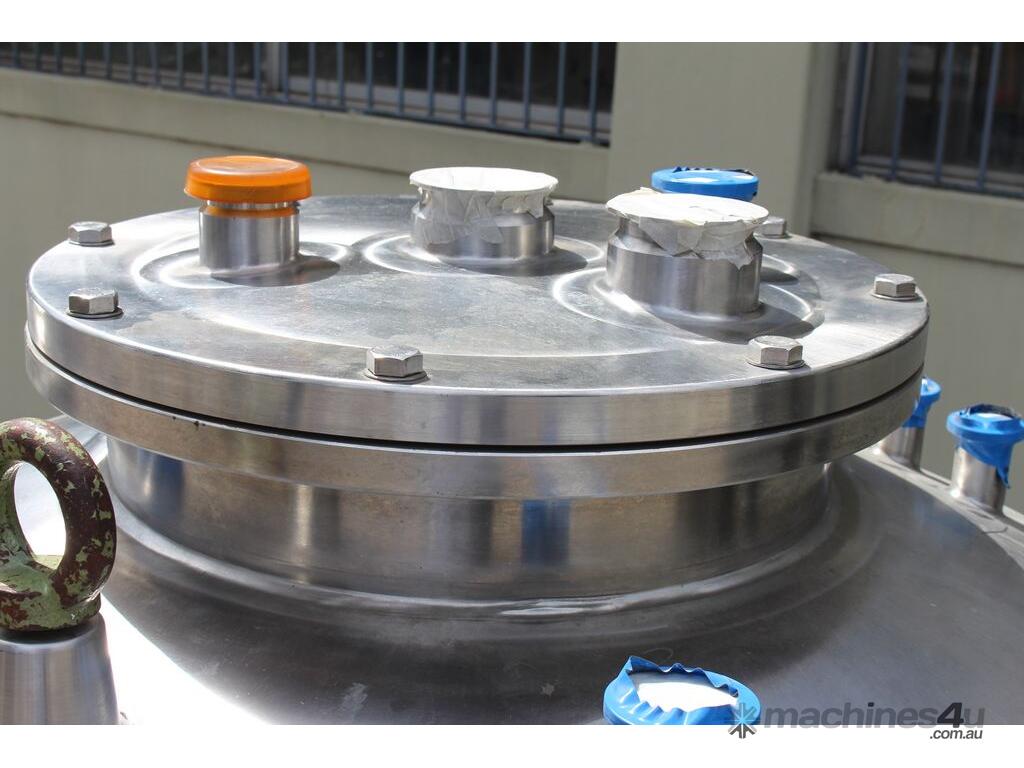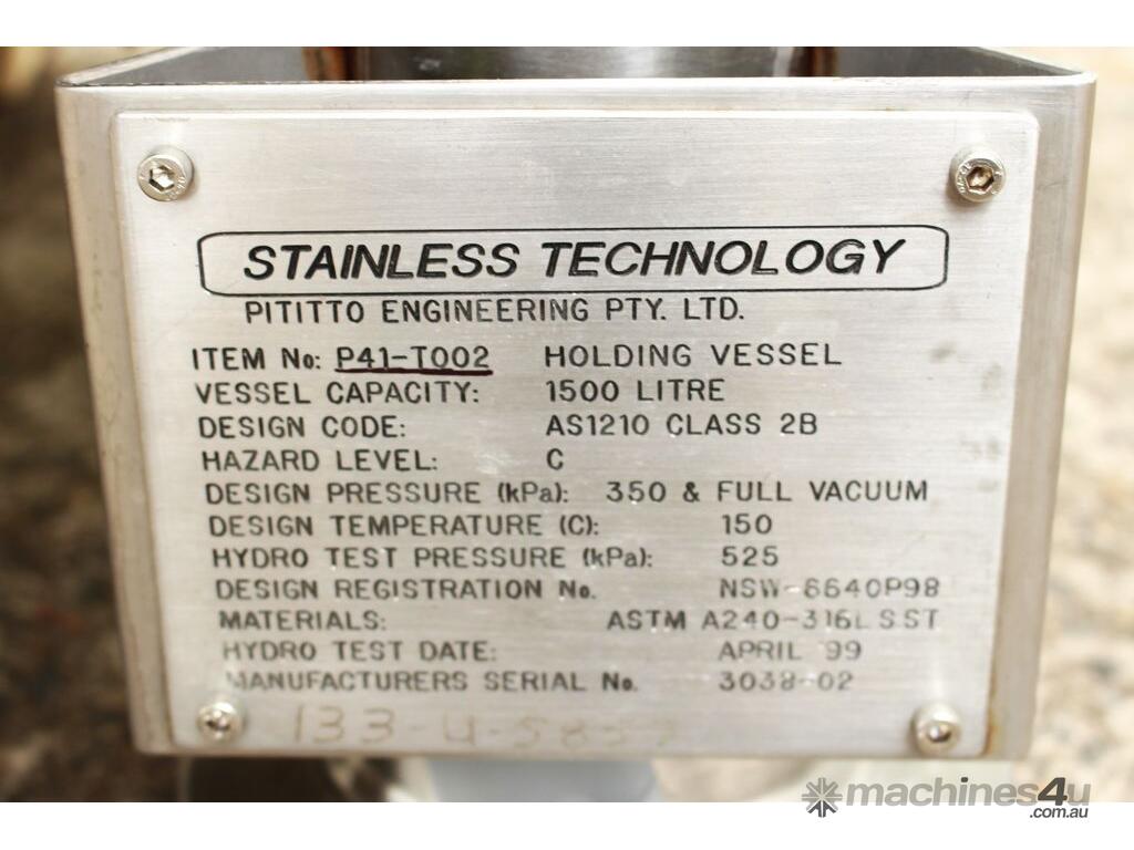 Stainless Steel Insulated Tank, "Pititto Engineering", capacity 1500L, internal dimensions: 1000mm dia x 1740mm deep, max. design pressure: 350Kpa, design temperature: 150 deg C, operation pressure: 250KPa, completely enclosed, dished top, 450mm dia manway with bolted flanged lid, also provided with 100mm sight glass port on top, insulated walls with full stainless steel sheathing, dished bottom with 40mm dia discharge centre outlet valve, 3 x tubular legs frame with load cells, overall height 3080mm