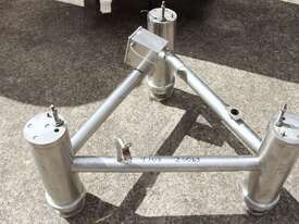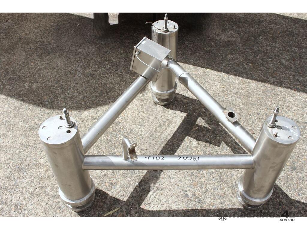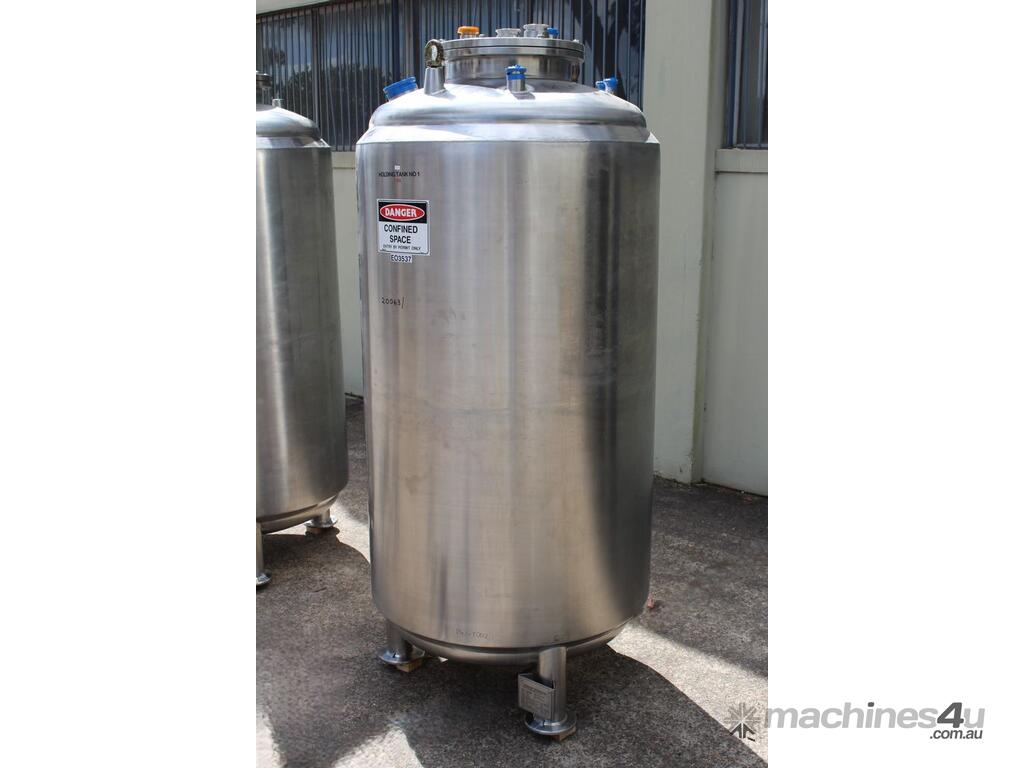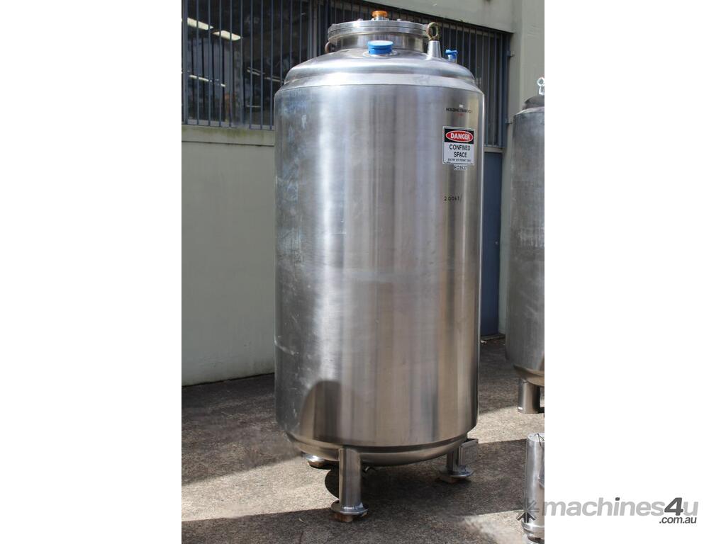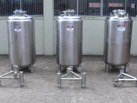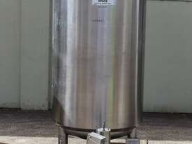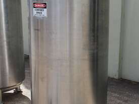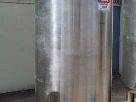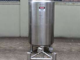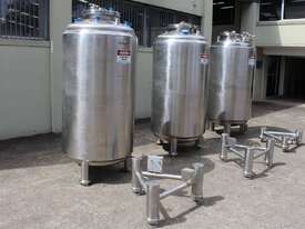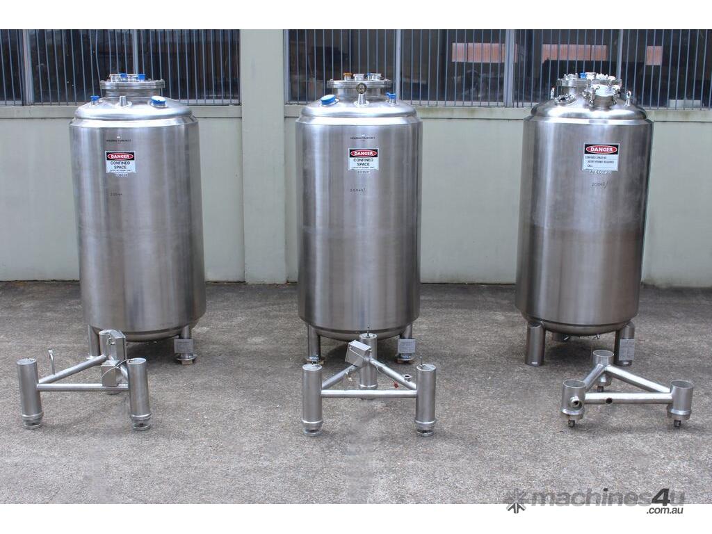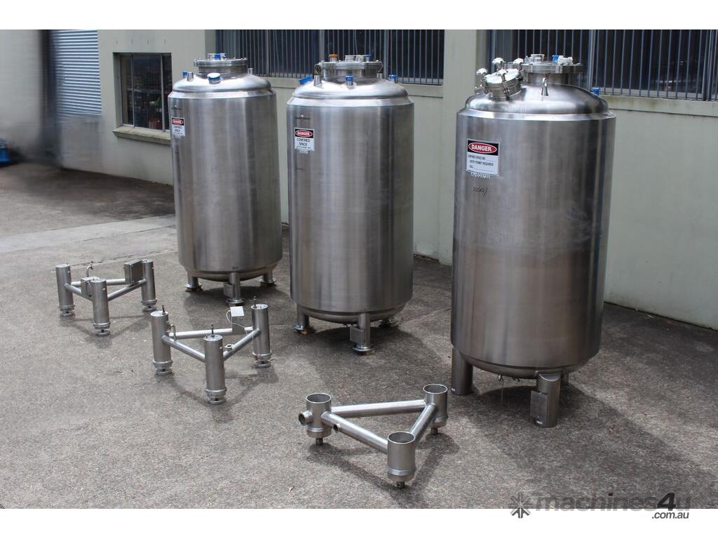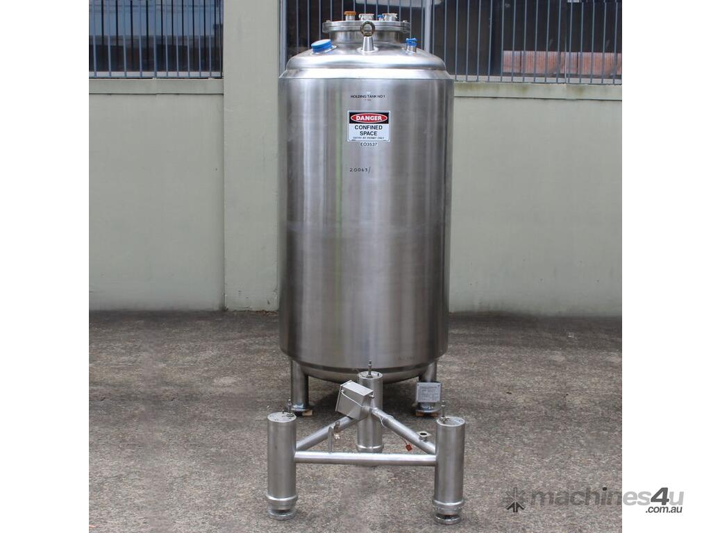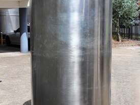 Stainless Steel Insulated Tank, "Pititto Engineering", capacity 1500L, internal dimensions: 1000mm dia x 1740mm deep, max. design pressure: 350Kpa, design temperature: 150 deg C, operation pressure: 250KPa, completely enclosed, dished top, 450mm dia manway with bolted flanged lid, also provided with 100mm sight glass port on top, insulated walls with full stainless steel sheathing, dished bottom with 40mm dia discharge centre outlet valve, 3 x tubular legs frame with load cells, overall height 3080mm