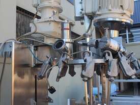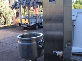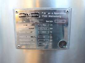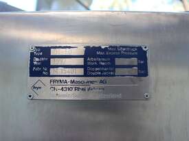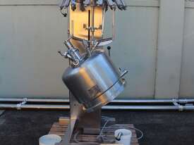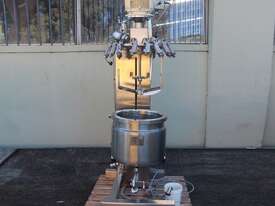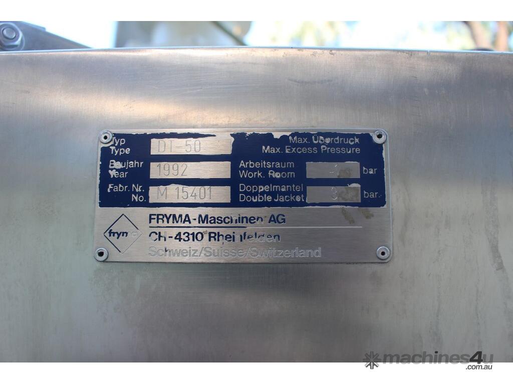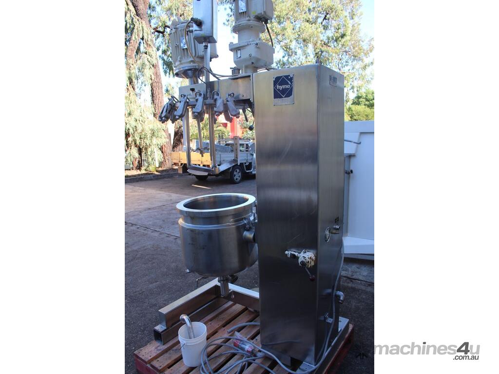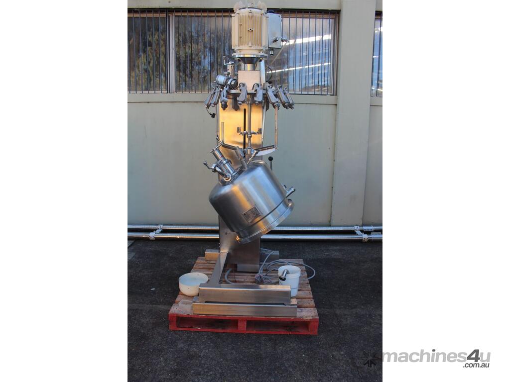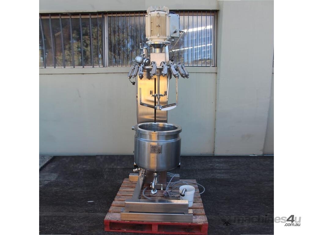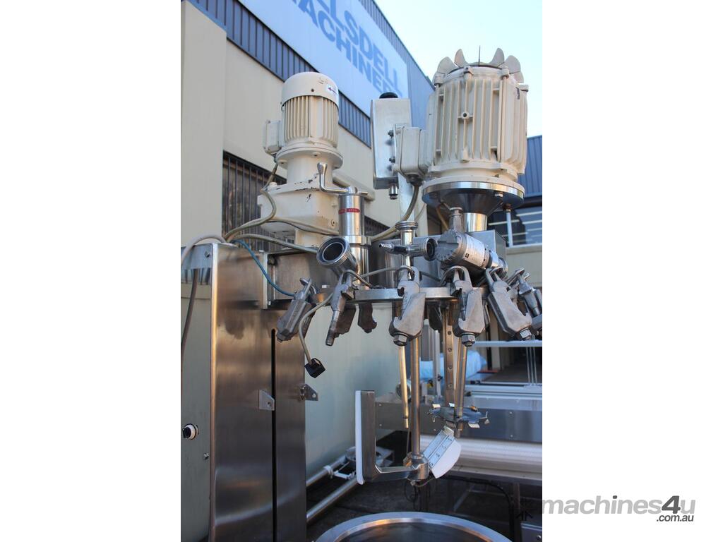 Stainless Steel Jacketed Mixer Vessel, "Fryma" Type DT-50, 50L working capacity, size 450mm dia x 410mm deep, grade 316, jacketed dished bowl with scrapper driven by a 1.1kw geared drive and high shear mixer with 150mm cavitation disc driven by a 7.5kw motor at approx. 2950rpm, manual bowl tilting, Pneumatic lift, internal vacuum with inbuilt vacuum pump, built on a stainless steel frame, three phase