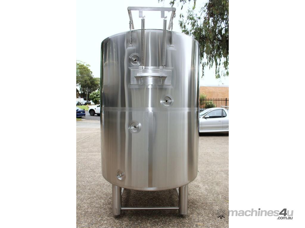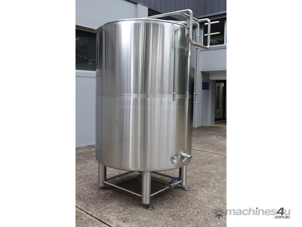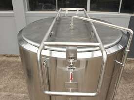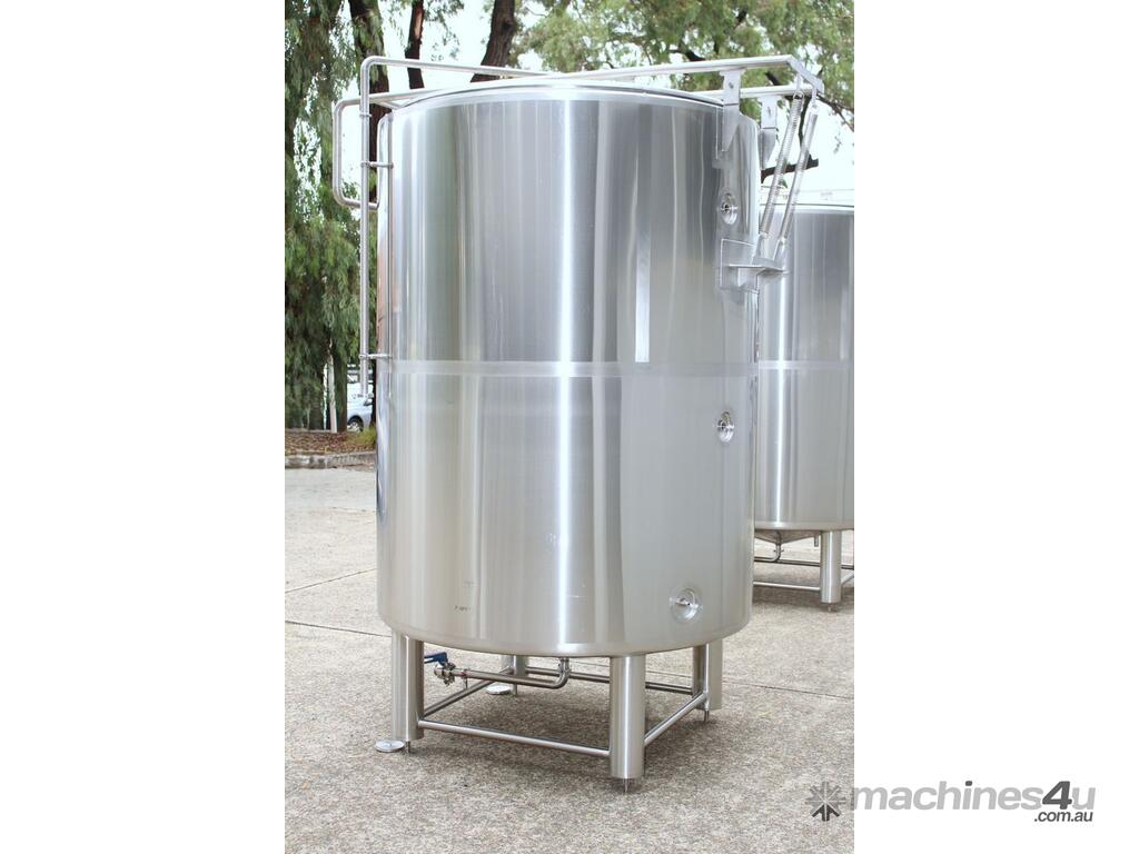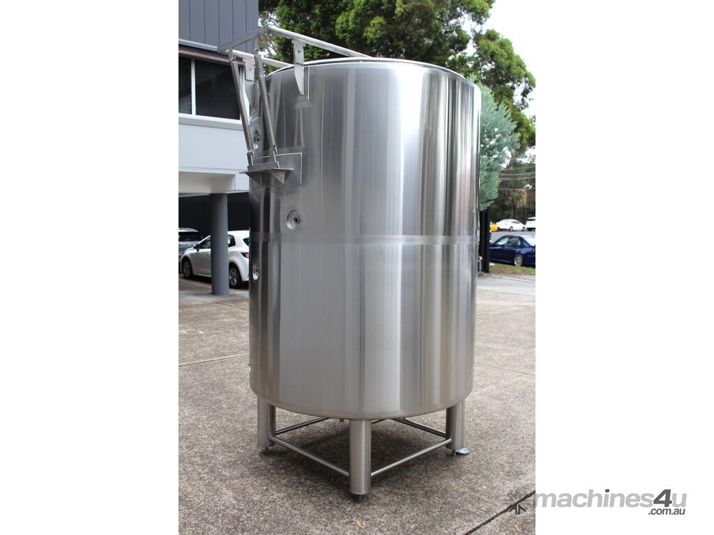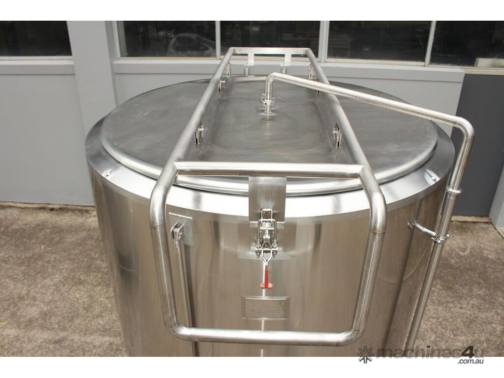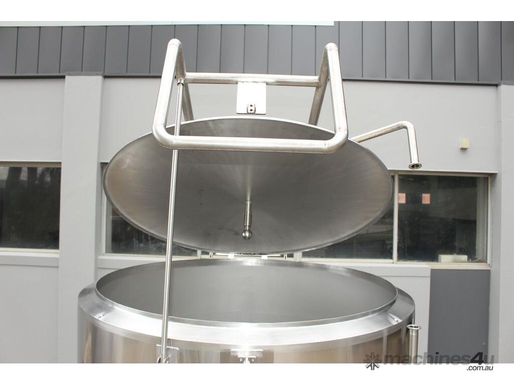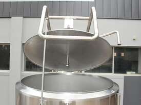Stainless Steel Jacketed Tank, “TIANTAI”, capacity: 2500L, internal dimension: 1400mm Dia x 1950mm deep, open top with hinged and spring supported lid, conical bottom with 35mm centre outlet turned outside with 35mm dia s/s valve at 210mm height, second outlet of 35mm dia provided at wall bottom side, fully jacketed and insulated from bottom and walls, provided with spray washer ball, 4 tubular legs, overall dimensions: 2000mm long x 1600mm wide x 2750mm high