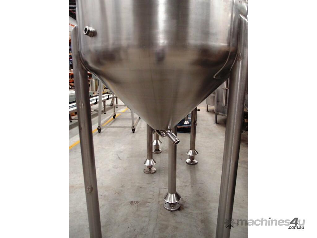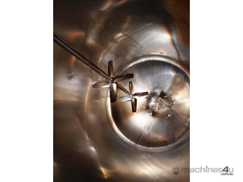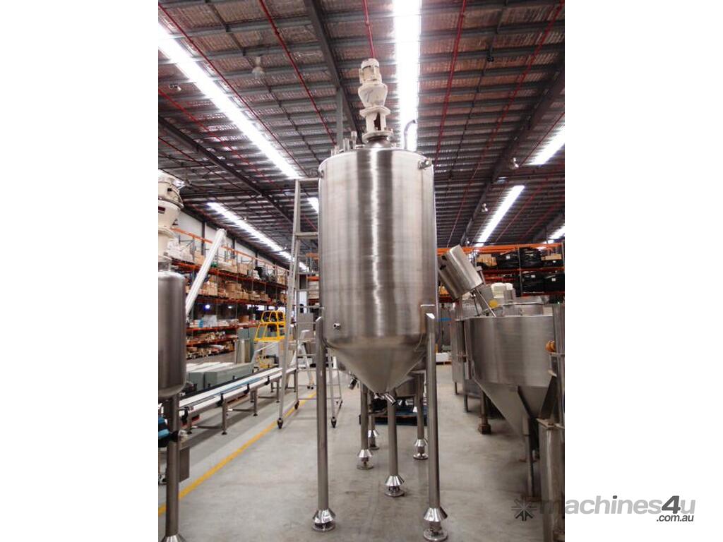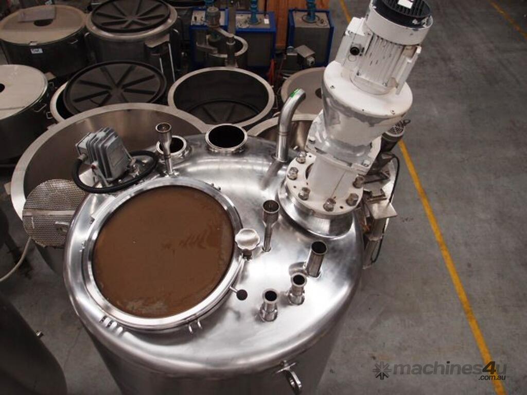 Vessel has dished top with hinged manway. Glass inspection port with lid. Top offset electric geared agitator (0.55kw, 415V). Conical bottom with 50mm dia center discharge. The vessel is internally polished and is of a pharmaceutical standard.