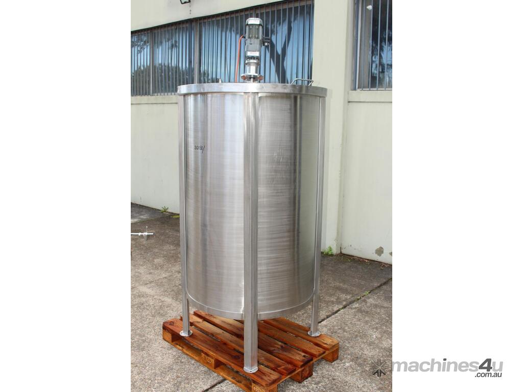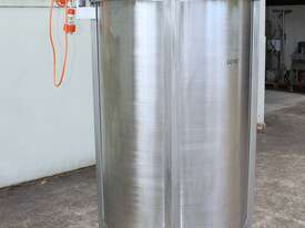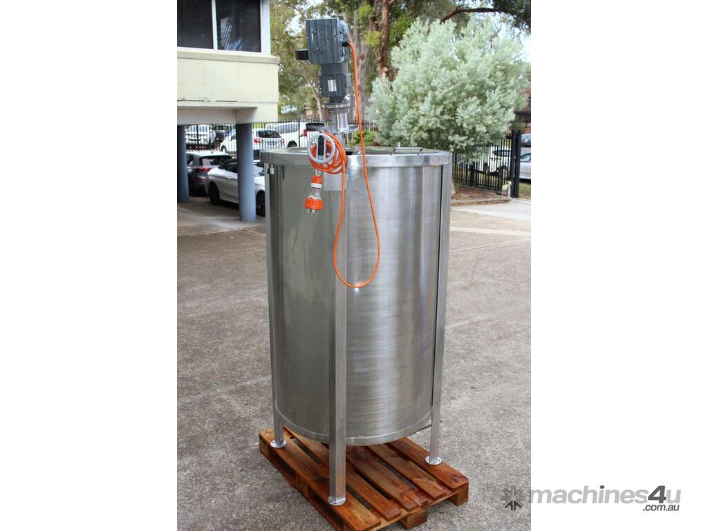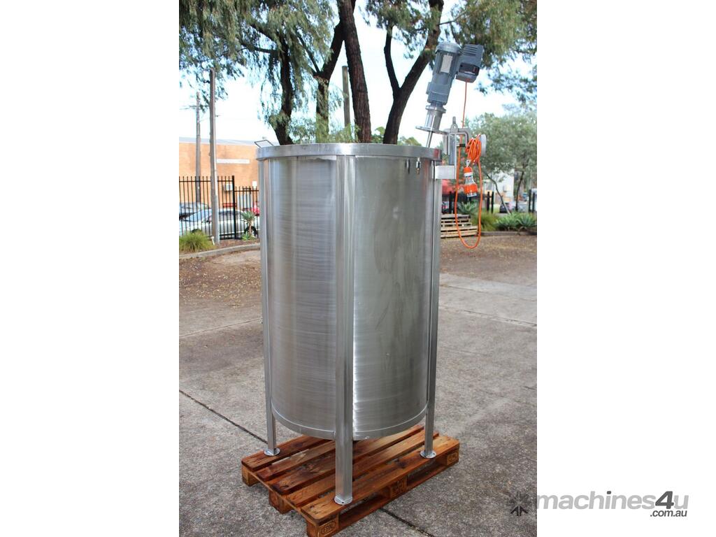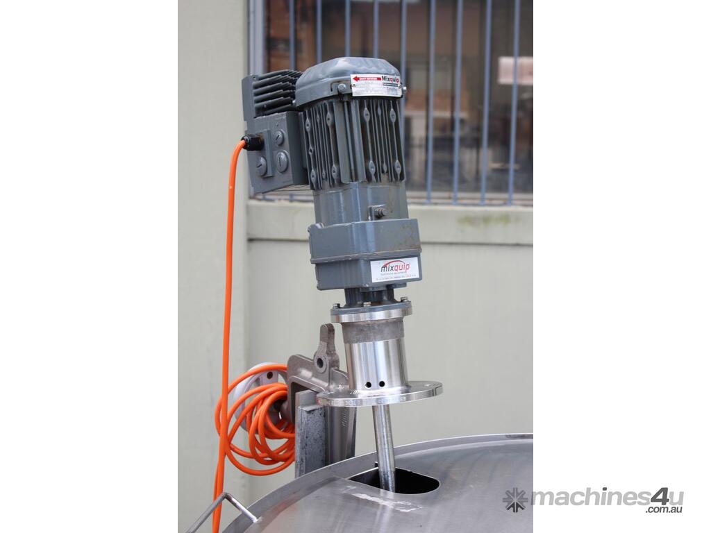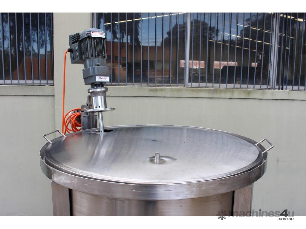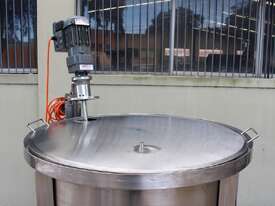Stainless Steel Mixing Tank, capacity 1000L, internal dimensions: 950mm dia x 1500mm deep, open top with lid, “Mixquip” portable mixer with 2 x props, driven by 3 phase 0.55kw variable speed geared motor, conical bottom with 50mm dia centre outlet, tank overall height: 1880mm with approx. 300mm legs, overall height including mixer 2500mm
