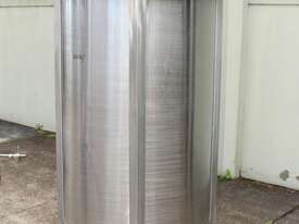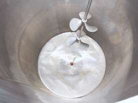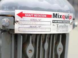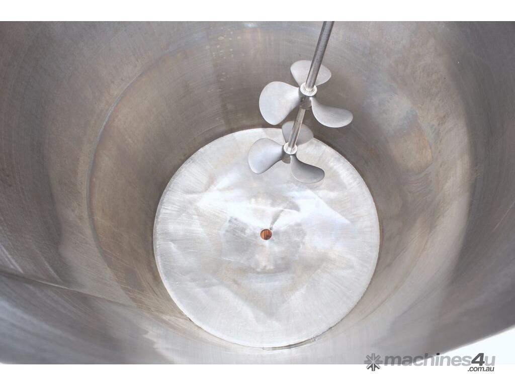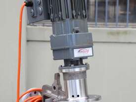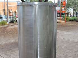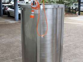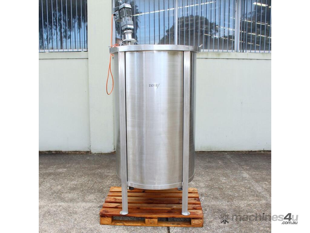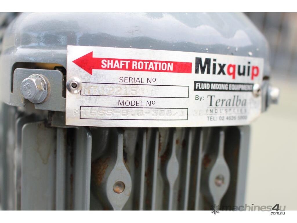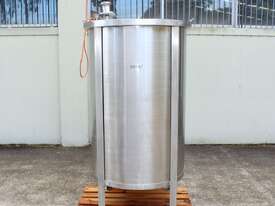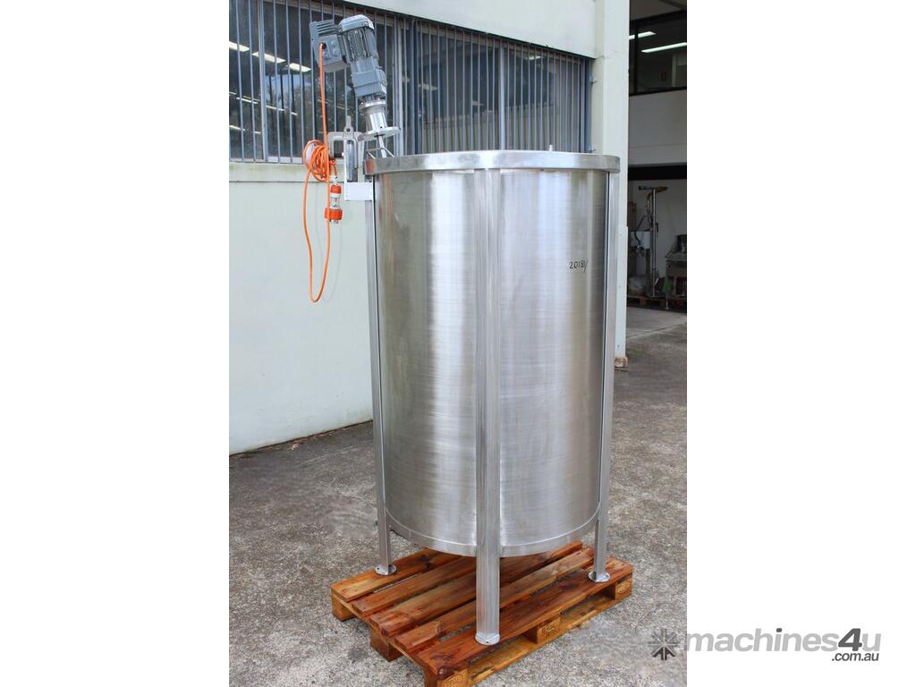 Stainless Steel Mixing Tank, capacity 1000L, internal dimensions: 950mm dia x 1500mm deep, open top with lid, “Mixquip” portable mixer with 2 x props, driven by 3 phase 0.55kw variable speed geared motor, conical bottom with 50mm dia centre outlet, tank overall height: 1880mm with approx. 300mm legs, overall height including mixer 2500mm