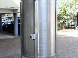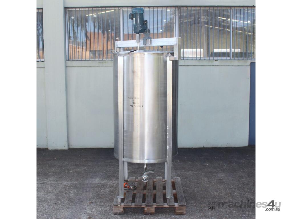 Stainless Steel Mixing Tank, 1000L capacity, internal dimensions: 950mm dia x 1500mm deep, open top with lid, provided with stainless steel welded bridge and 3 phase 0.75kw portable slow speed mixer, stainless steel shaft with 2 x 300mm dia prop, conical bottom with 50mm dia centre outlet turn to the side with stainless steel valve, overall height 2700mm
