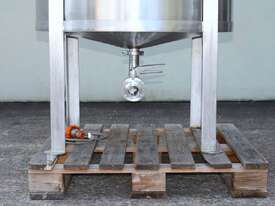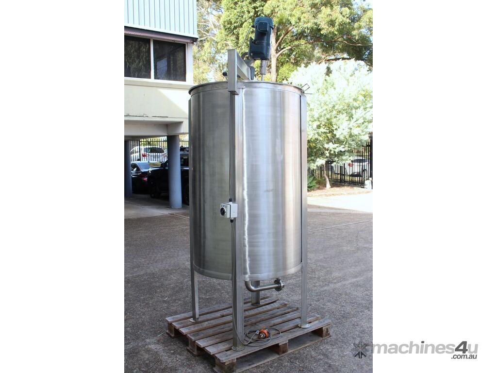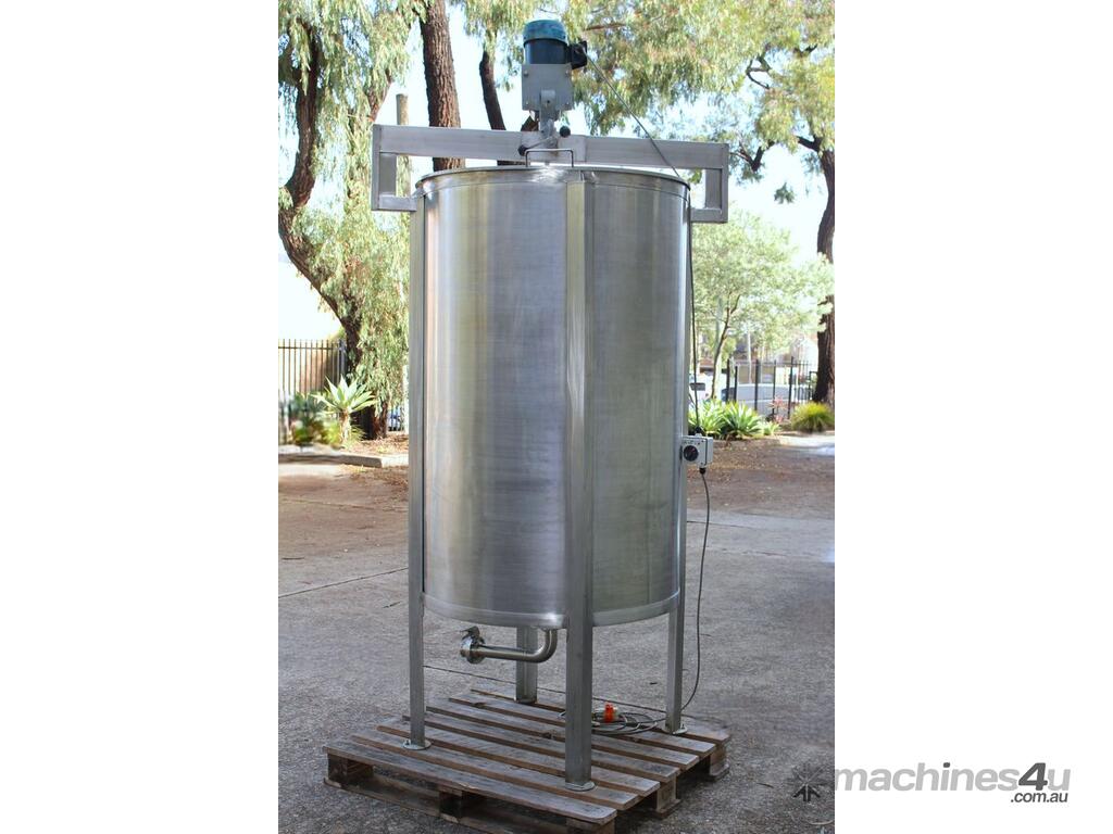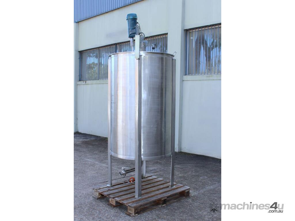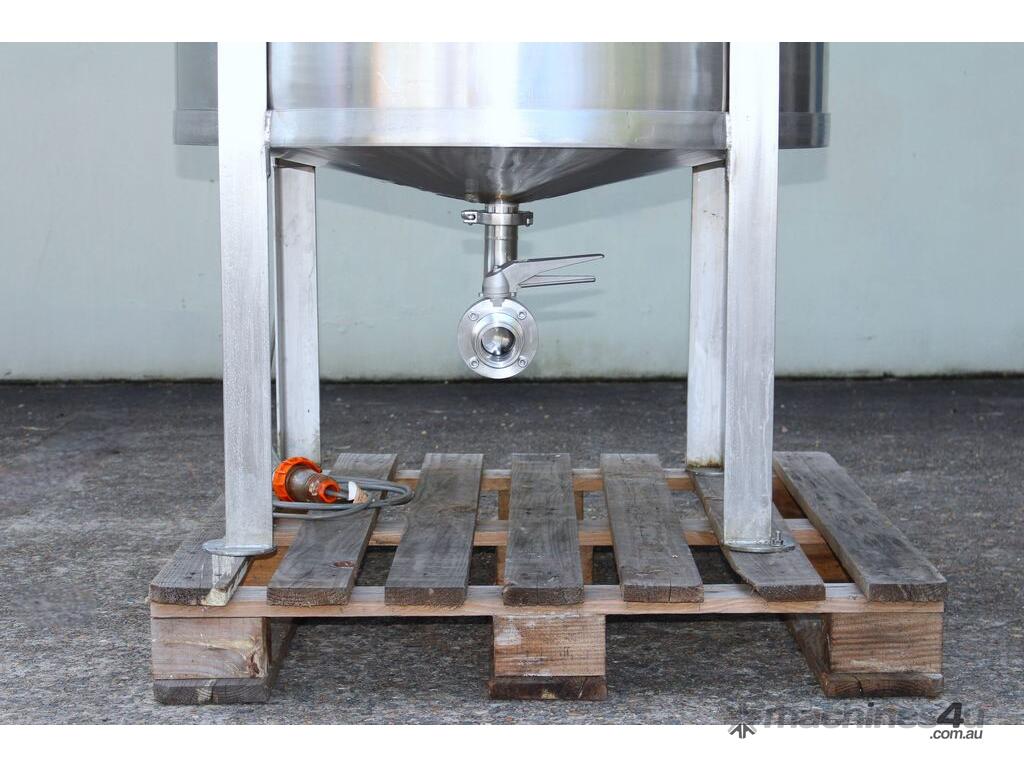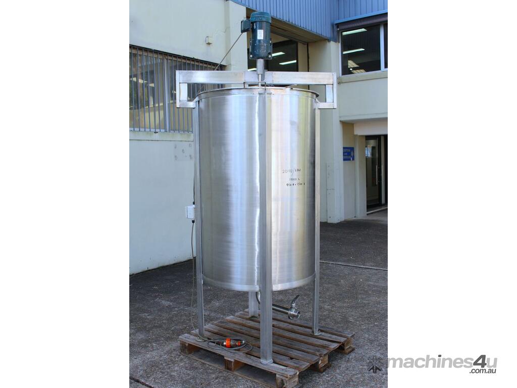 Stainless Steel Mixing Tank, 1000L capacity, internal dimensions: 950mm dia x 1500mm deep, open top with lid, provided with stainless steel welded bridge and 3 phase 0.75kw portable slow speed mixer, stainless steel shaft with 2 x 300mm dia prop, conical bottom with 50mm dia centre outlet turn to the side with stainless steel valve, tank overall height: 2050mm with approx. 500mm legs overall height including mixer 2700mm