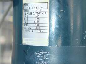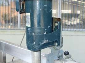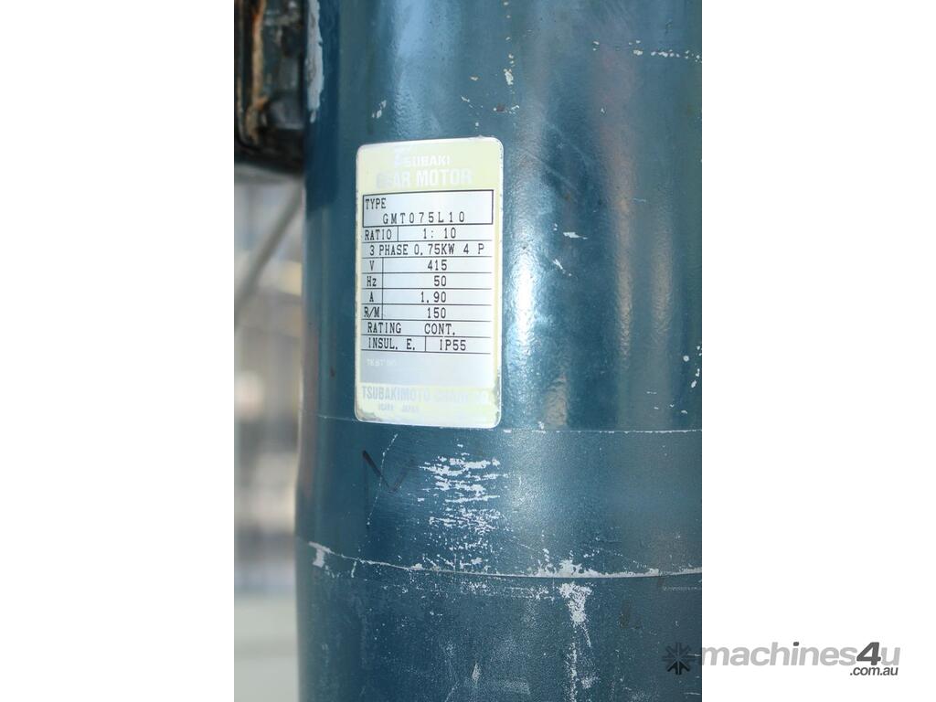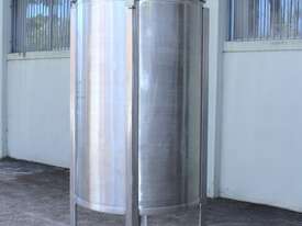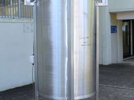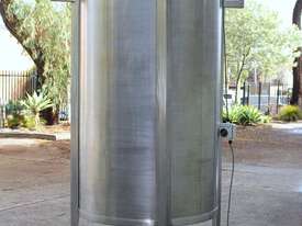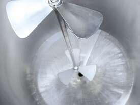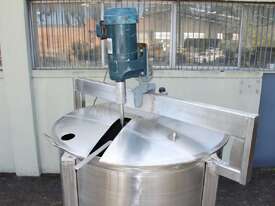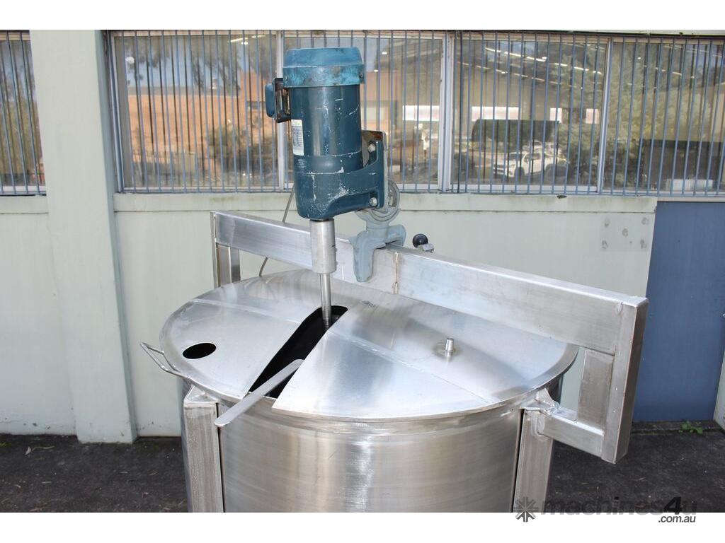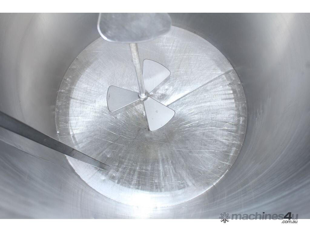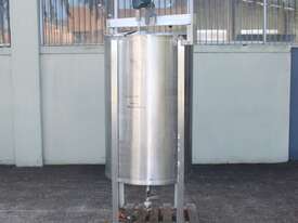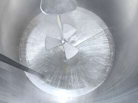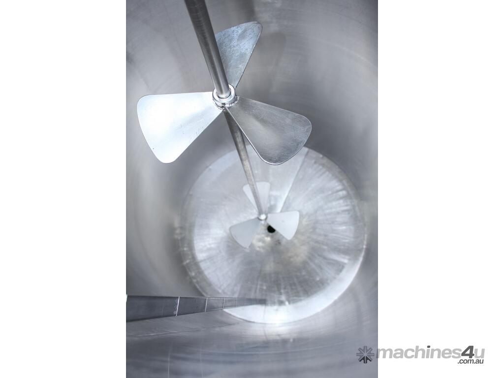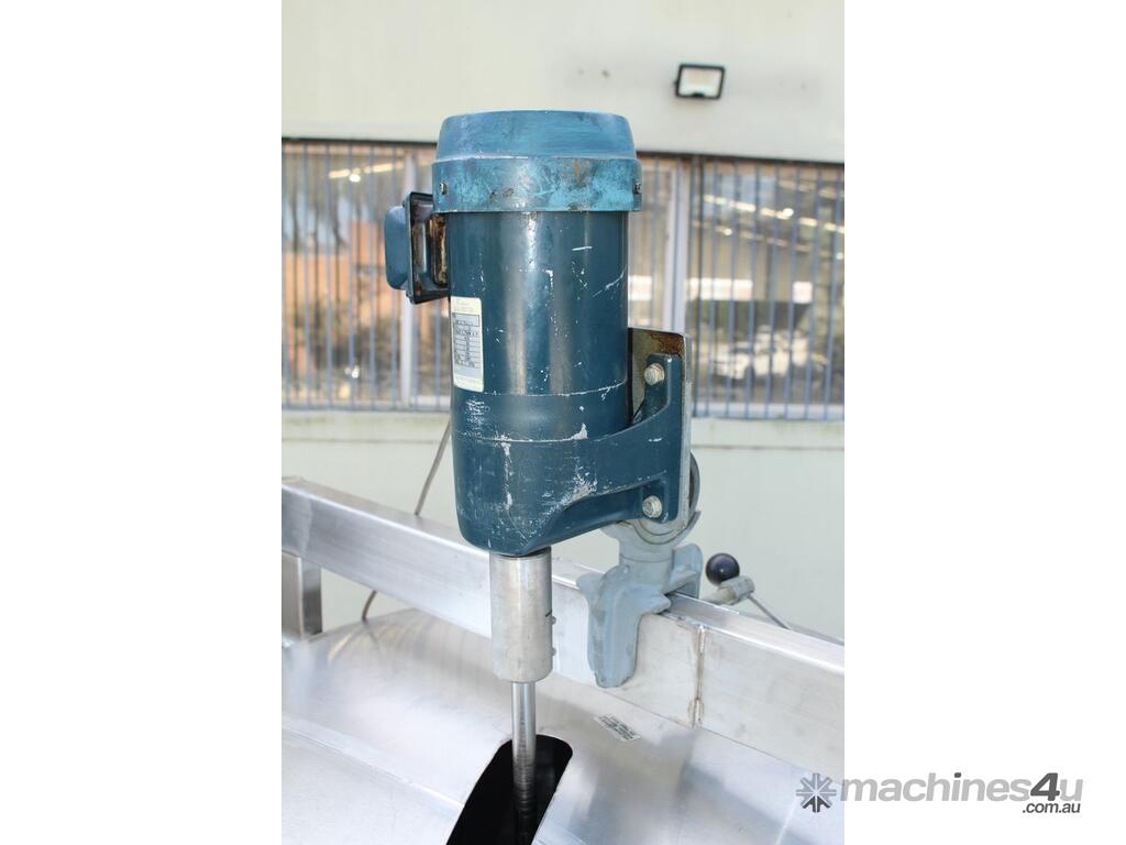 Stainless Steel Mixing Tank, 1000L capacity, internal dimensions: 950mm dia x 1500mm deep, open top with lid, provided with stainless steel welded bridge and 3 phase 0.75kw portable slow speed mixer, stainless steel shaft with 2 x 300mm dia prop, conical bottom with 50mm dia centre outlet turn to the side with stainless steel valve, tank overall height: 2050mm with approx. 500mm legs overall height including mixer 2700mm