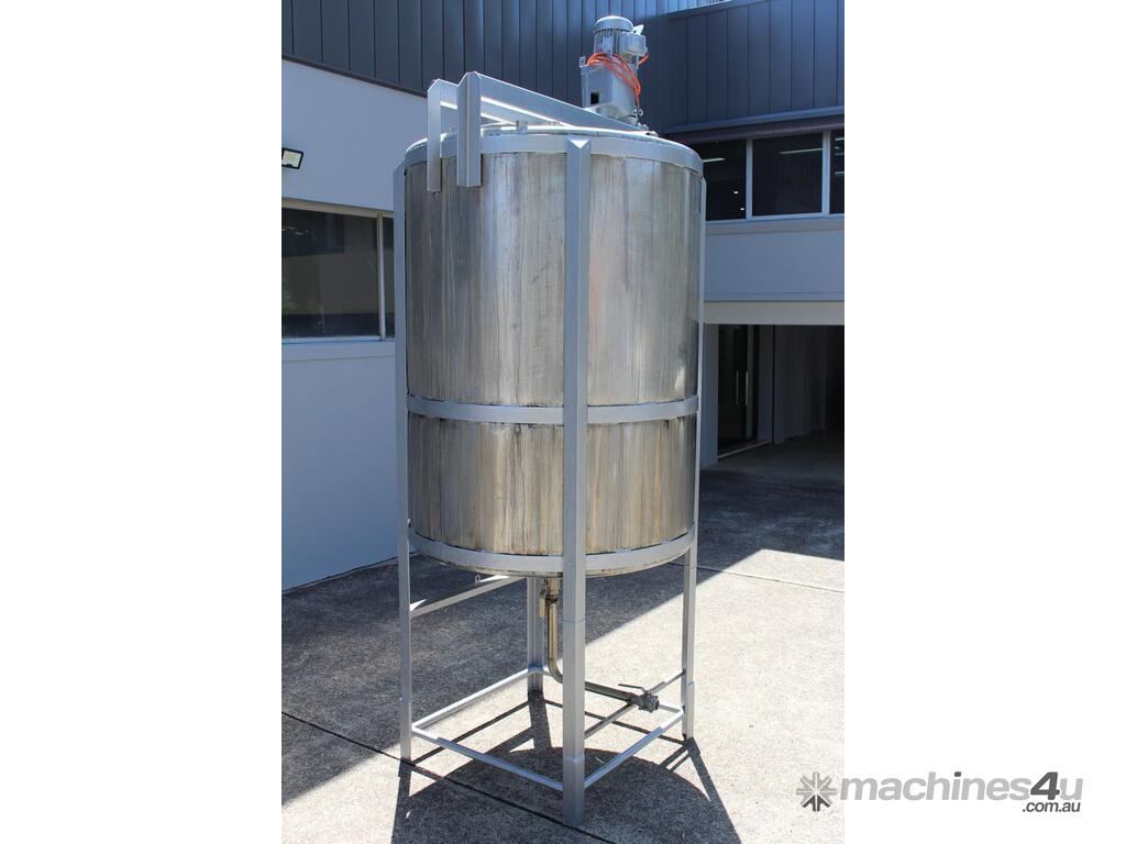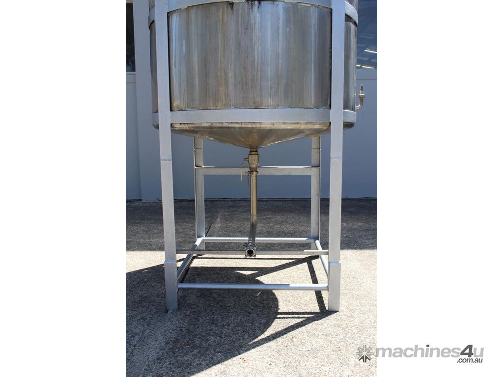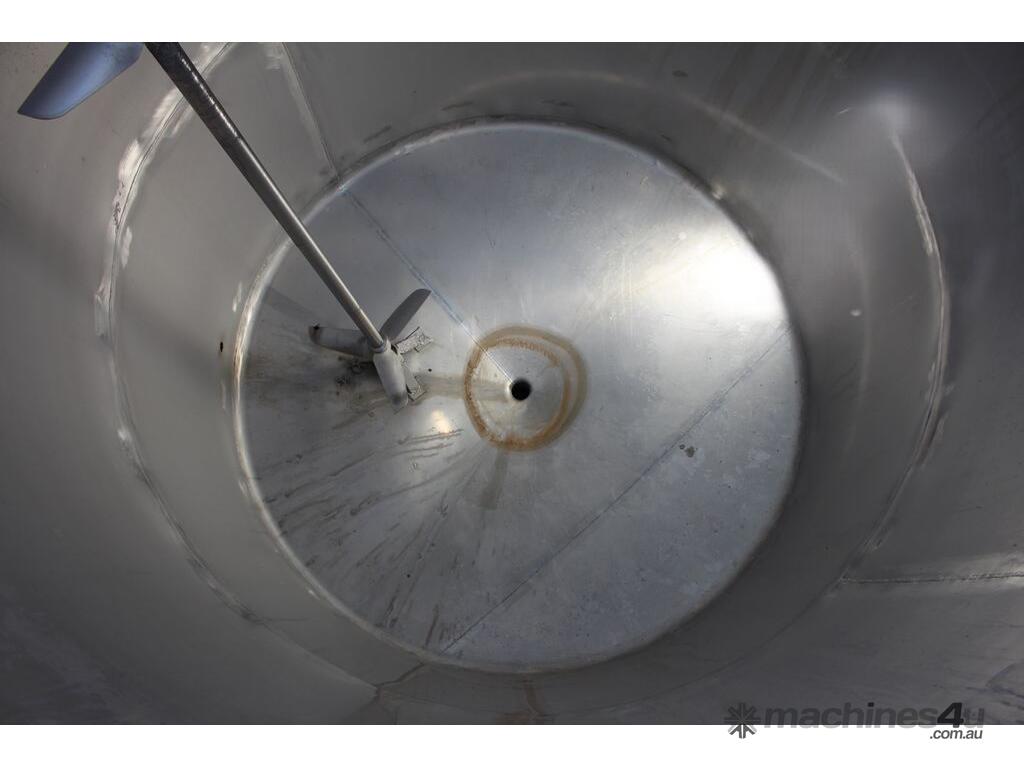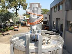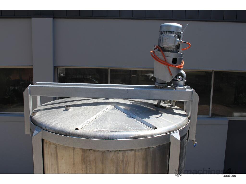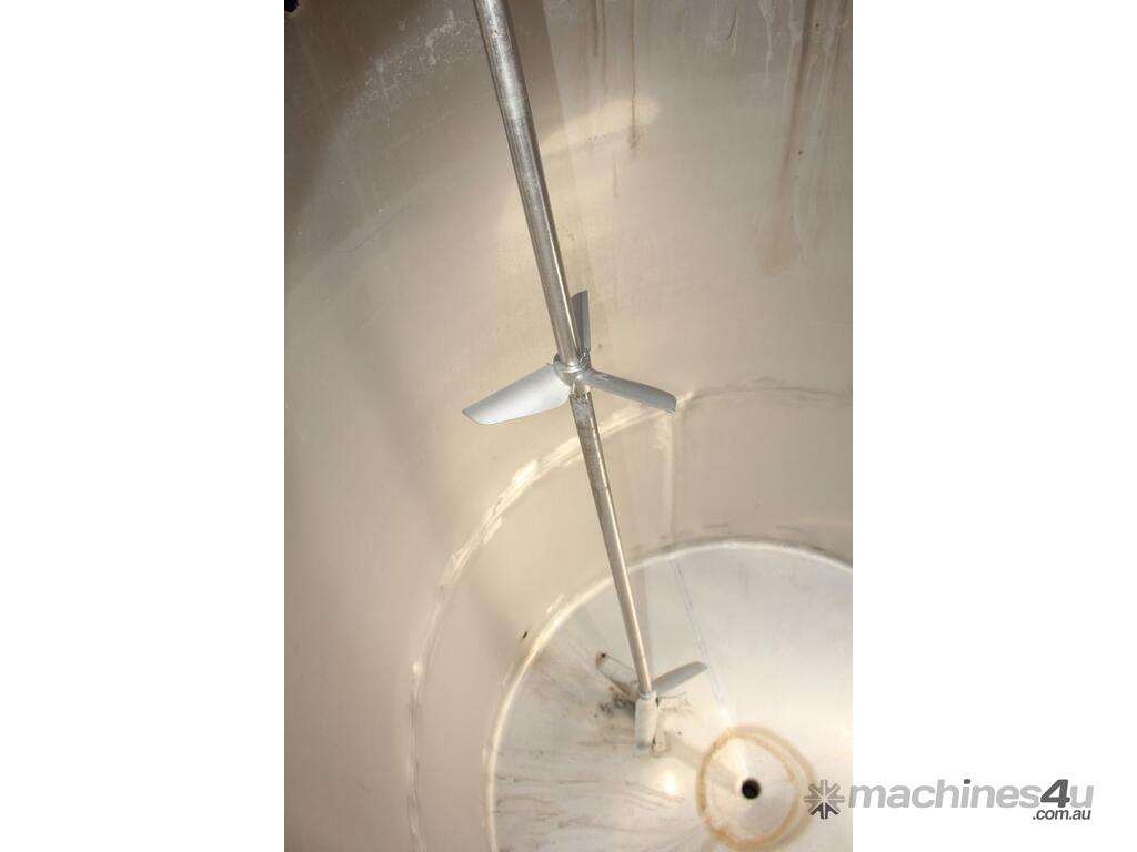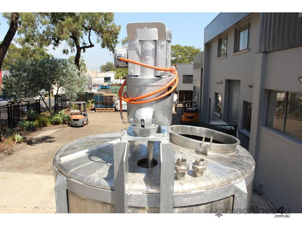 Stainless Steel Mixing Tank, capacity 3,500L, internal dimensions 1500mm dia x 1950mm deep, totally enclosed with 510mm dia manway without lids, conical bottom with 50mm dia centre outlet returned to the side, top entry mixer driven by 3 phase geared motor mounted over a welded bridge with 3 x stainless steel propellers, overall height 4100mm