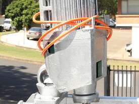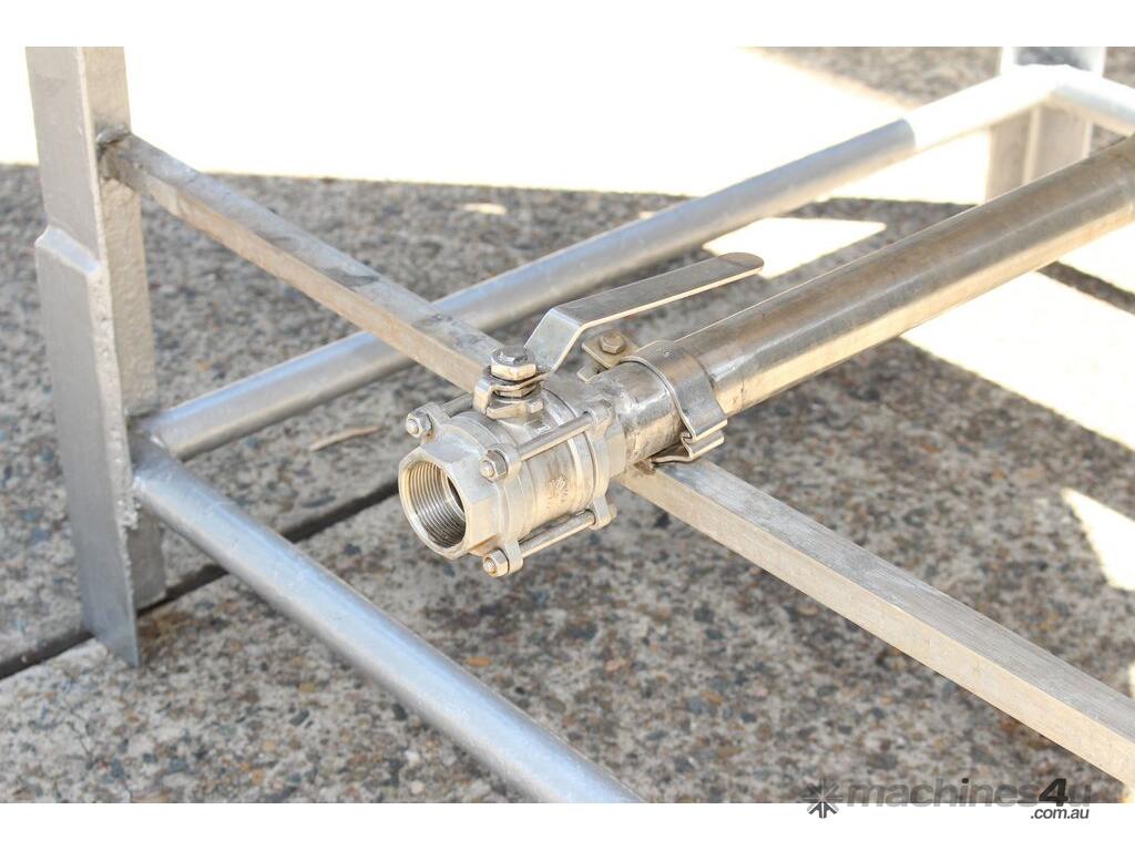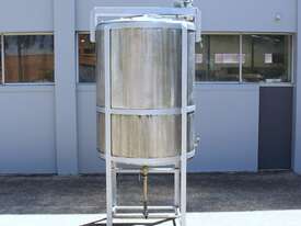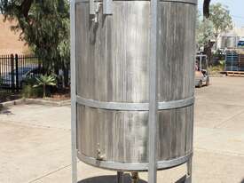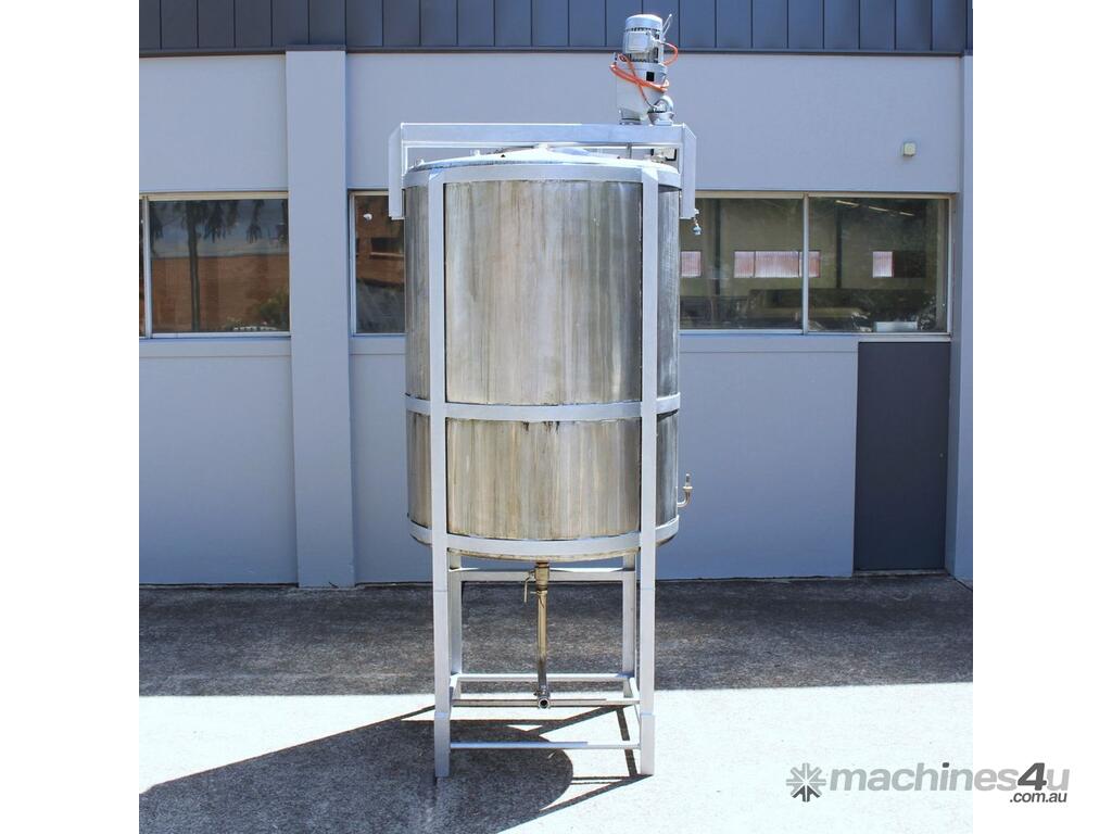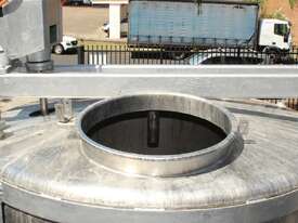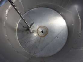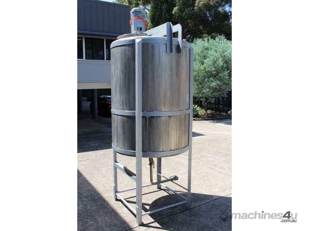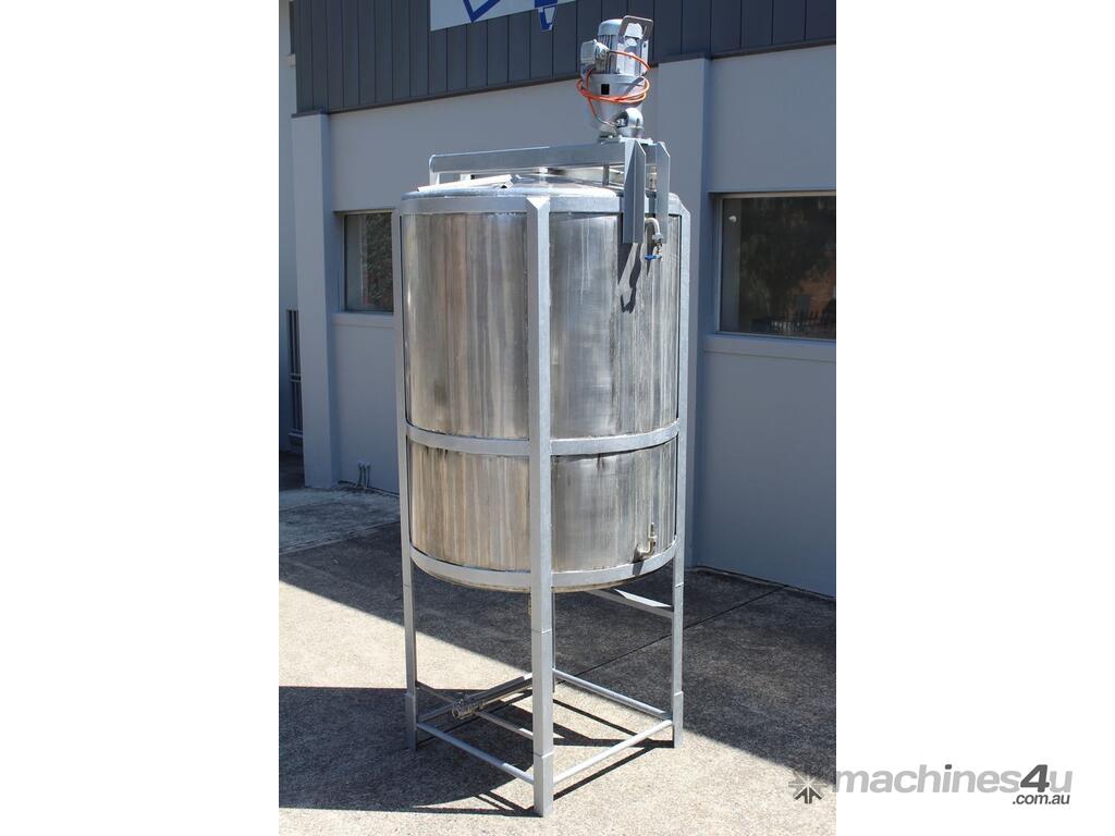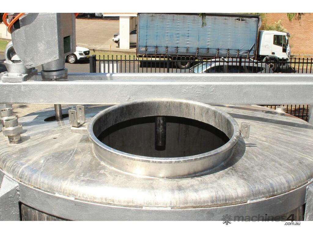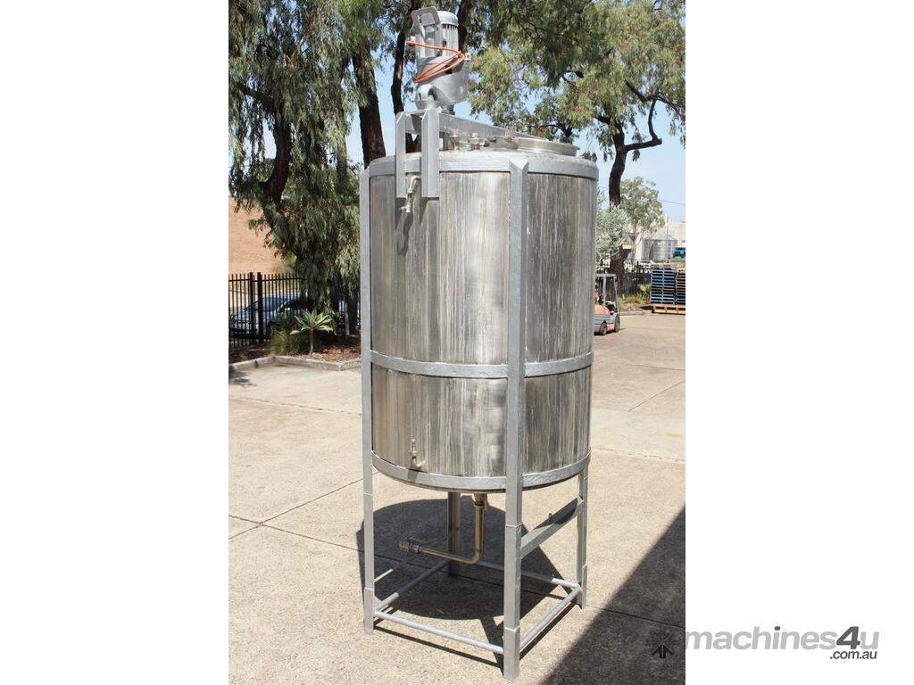 Stainless Steel Mixing Tank, capacity 3,500L, internal dimensions 1500mm dia x 1950mm deep, totally enclosed with 510mm dia manway without lids, conical bottom with 50mm dia centre outlet returned to the side, top entry mixer driven by 3 phase geared motor mounted over a welded bridge with 3 x stainless steel propellers, overall height 4100mm