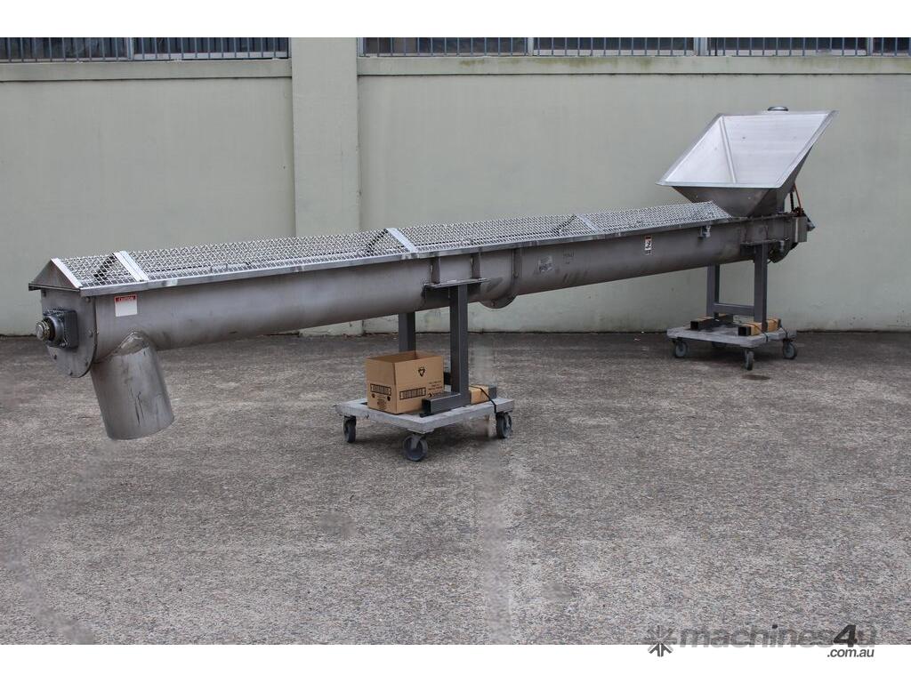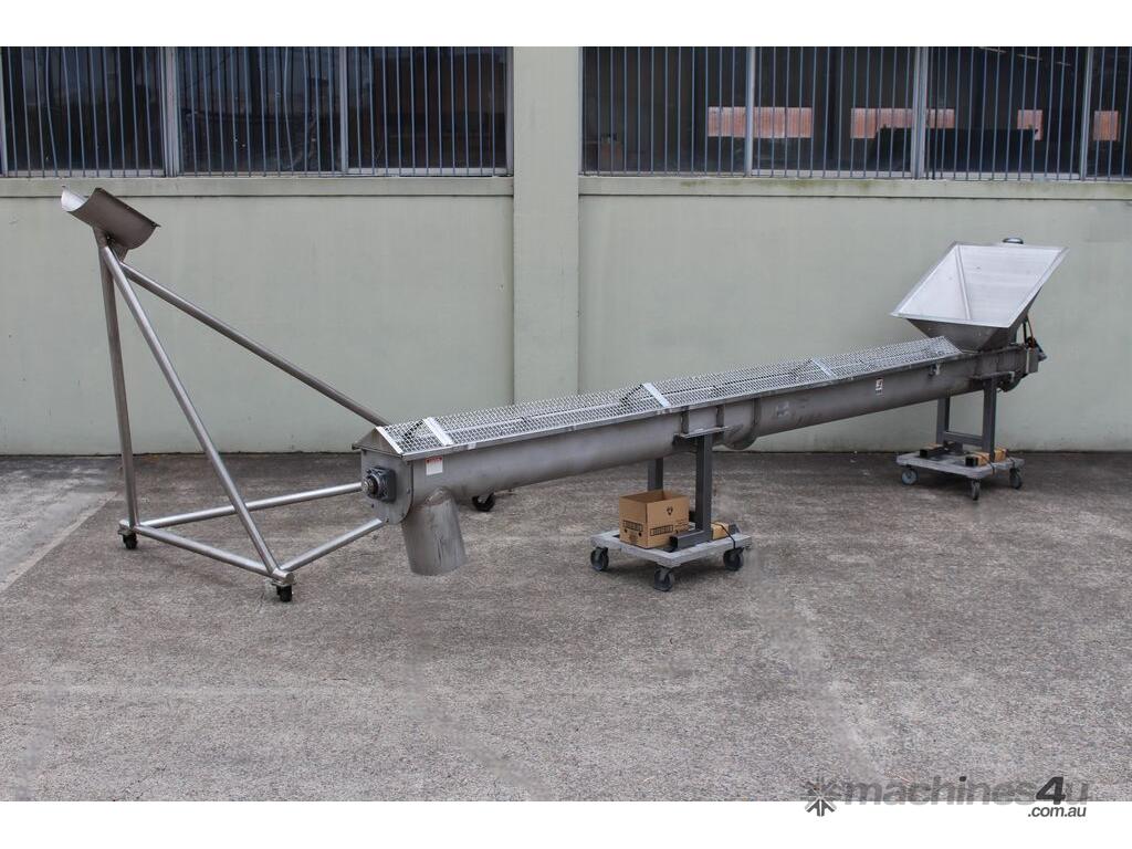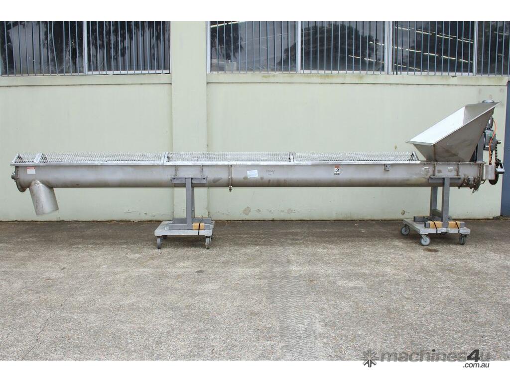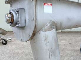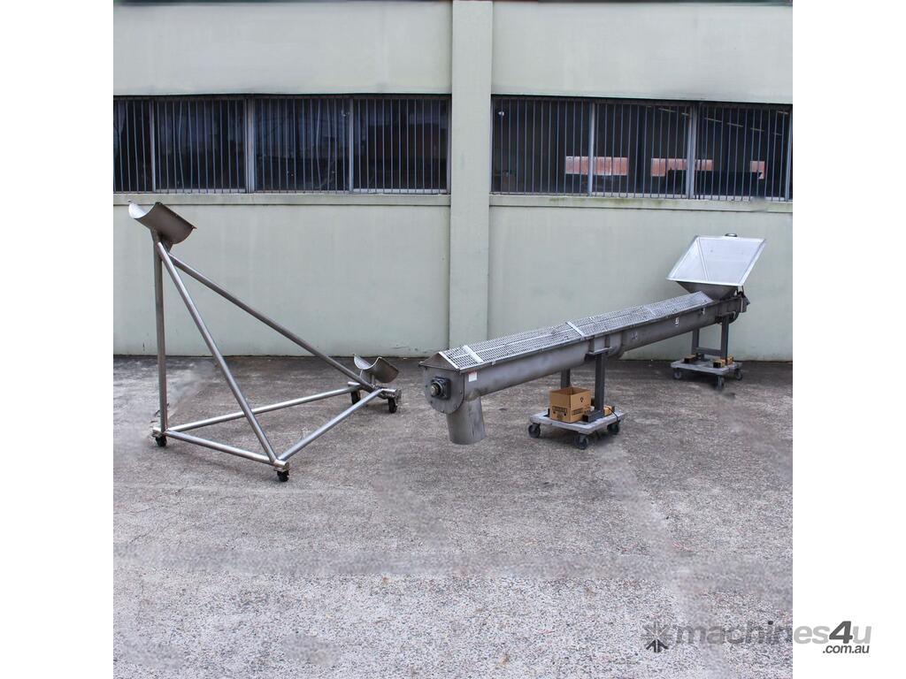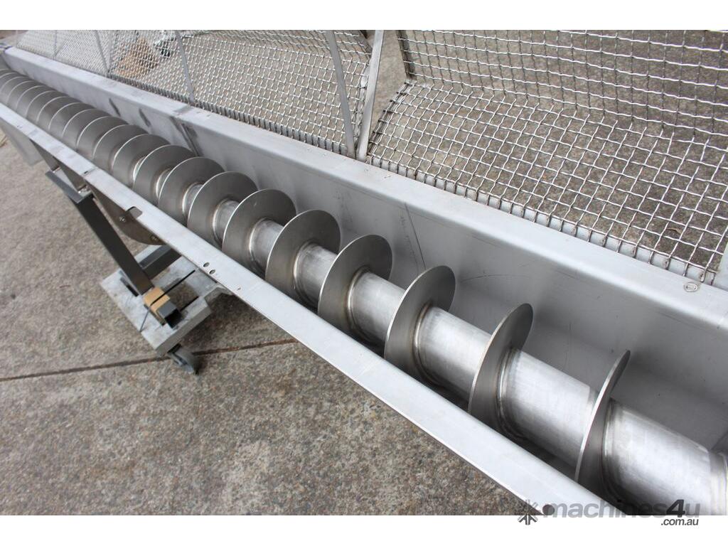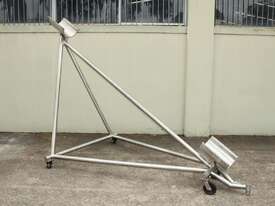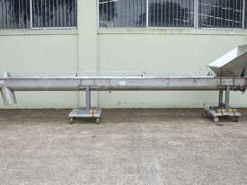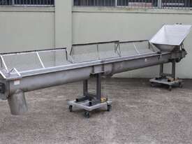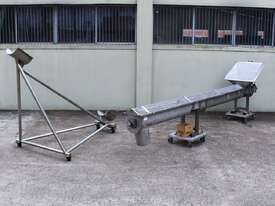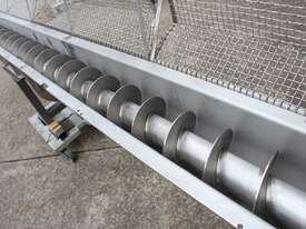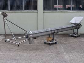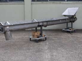Stainless Steel Mobile Auger Screw Conveyor, 270mm dia x 5500mm long, stainless steel wetted parts, completely guarded with 1" size stainless steel grid mesh, stainless steel feeding hopper with overall dimension: 940mm x 950mm x 550mm deep, inlet size 410mm long x 280mm wide, outlet size 260mm dia, can be used as horizontal conveyor with stationary legs or use as an elevator with inclined frame, driven by 3 phase 0.25kw geared motor, overall length of conveyor is 6000mm