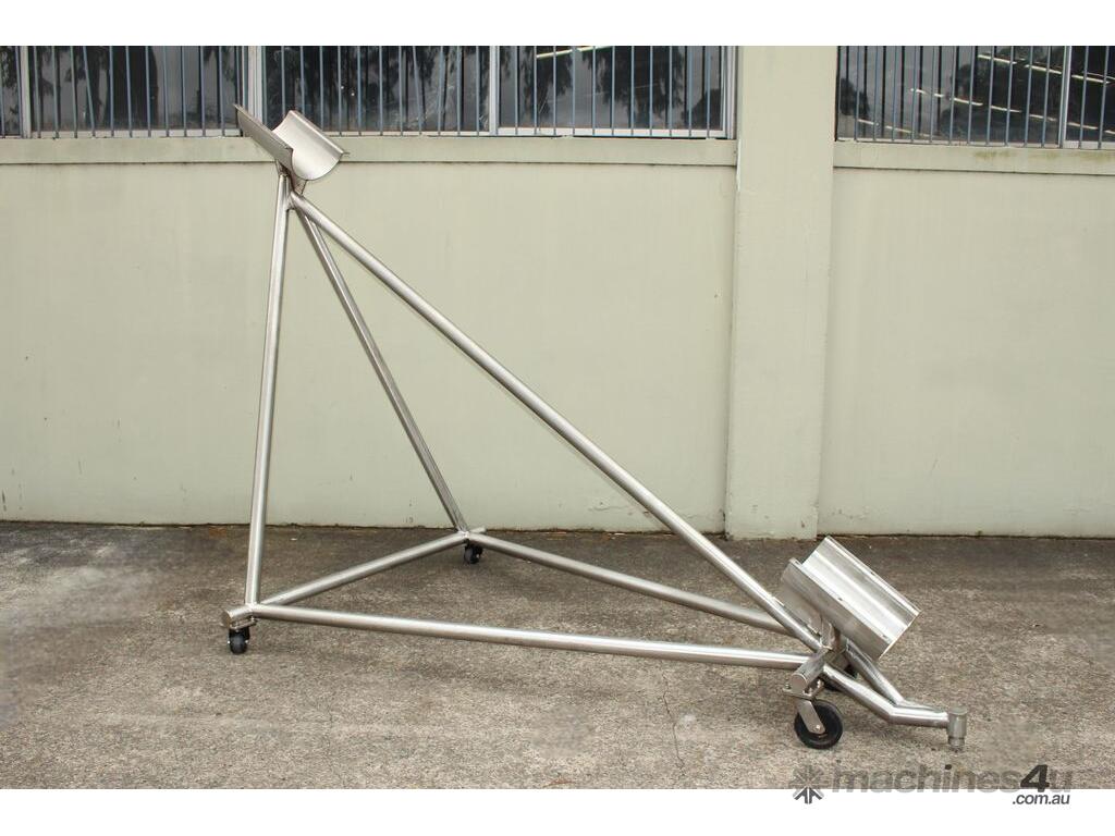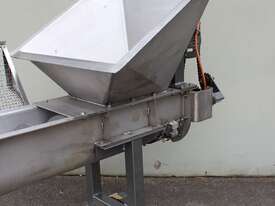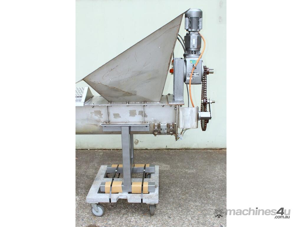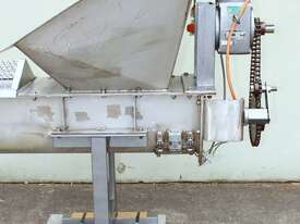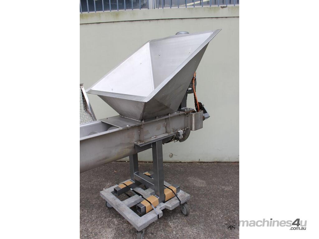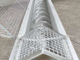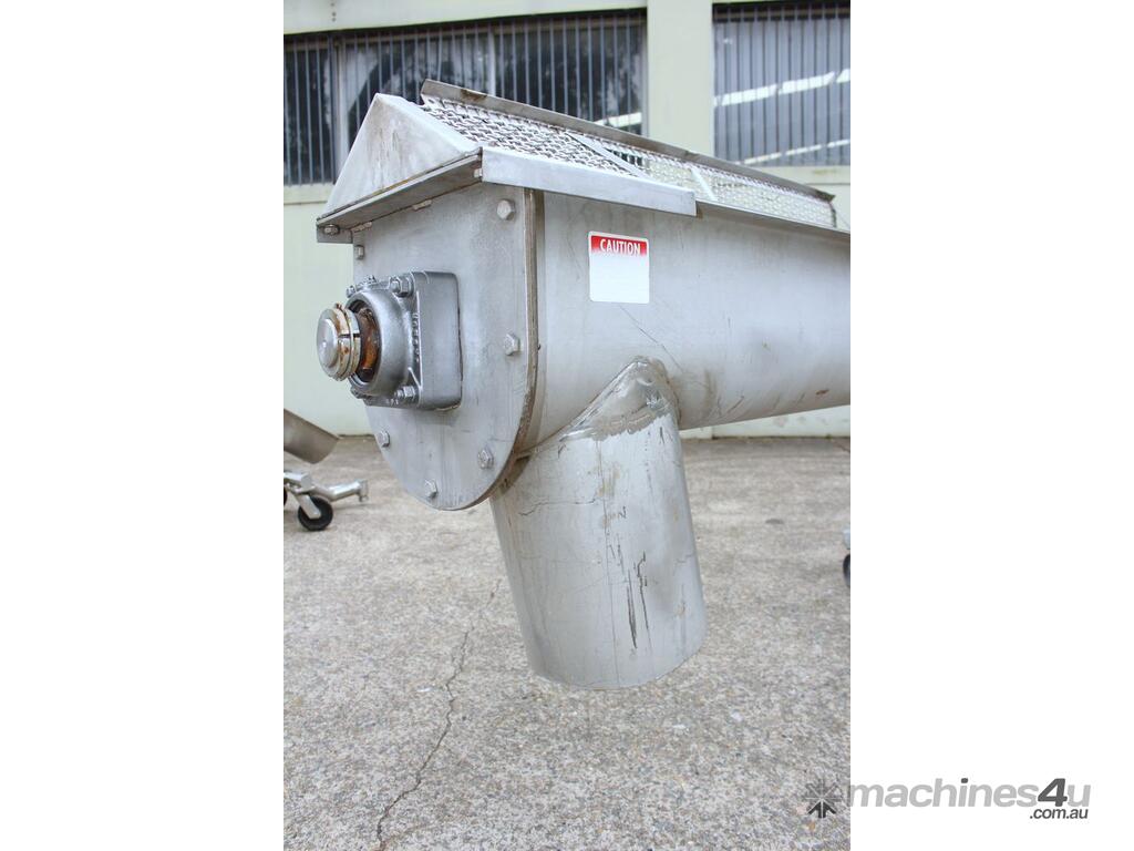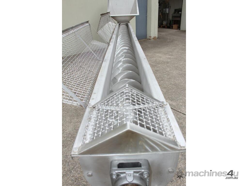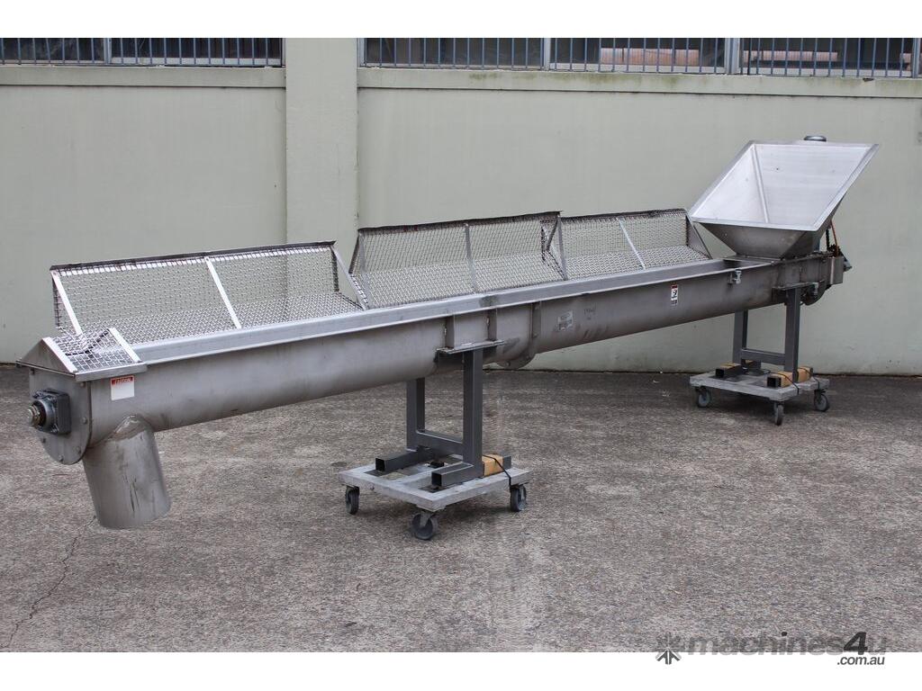 Stainless Steel Mobile Auger Screw Conveyor, 270mm dia x 5500mm long, stainless steel wetted parts, completely guarded with 1" size stainless steel grid mesh, stainless steel feeding hopper with overall dimension: 940mm x 950mm x 550mm deep, inlet size 410mm long x 280mm wide, outlet size 260mm dia, can be used as horizontal conveyor with stationary legs or use as an elevator with inclined frame, driven by 3 phase 0.25kw geared motor, overall length of conveyor is 6000mm