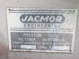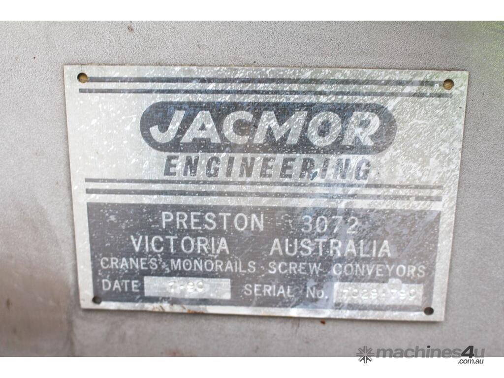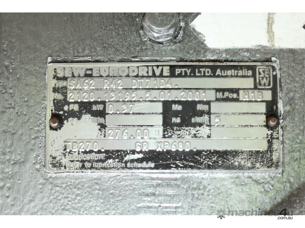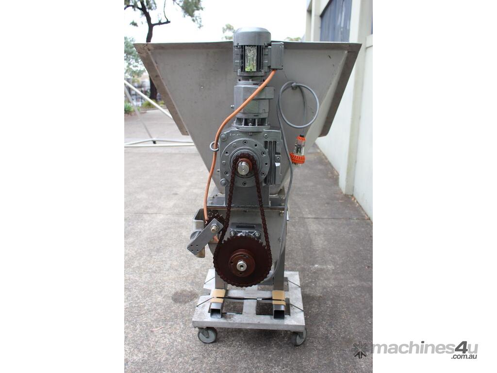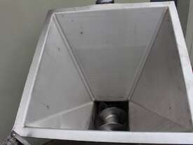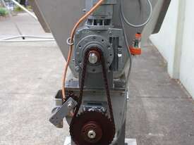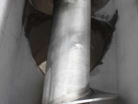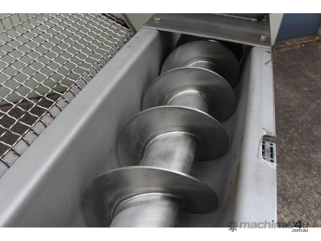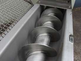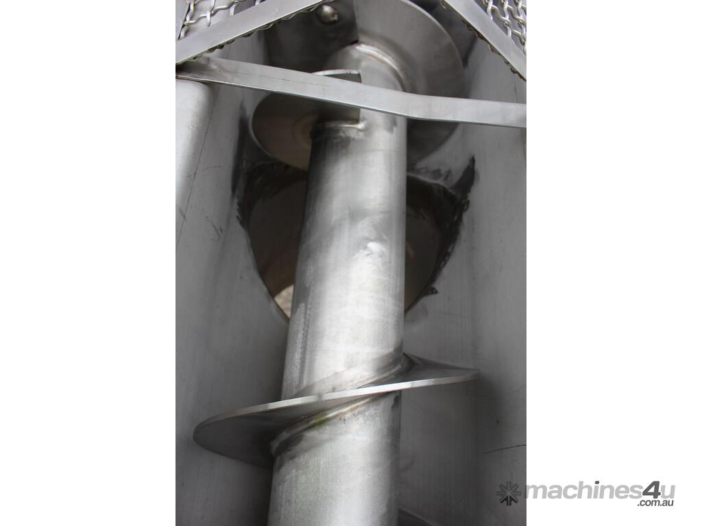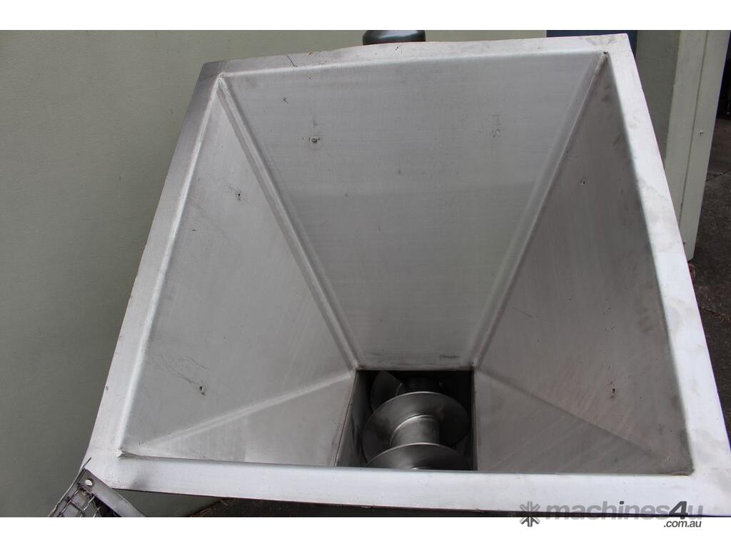 Stainless Steel Mobile Auger Screw Conveyor, 270mm dia x 5500mm long, stainless steel wetted parts, completely guarded with 1" size stainless steel grid mesh, stainless steel feeding hopper with overall dimension: 940mm x 950mm x 550mm deep, inlet size 410mm long x 280mm wide, outlet size 260mm dia, can be used as horizontal conveyor with stationary legs or use as an elevator with inclined frame, driven by 3 phase 0.25kw geared motor, overall length of conveyor is 6000mm