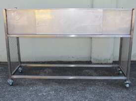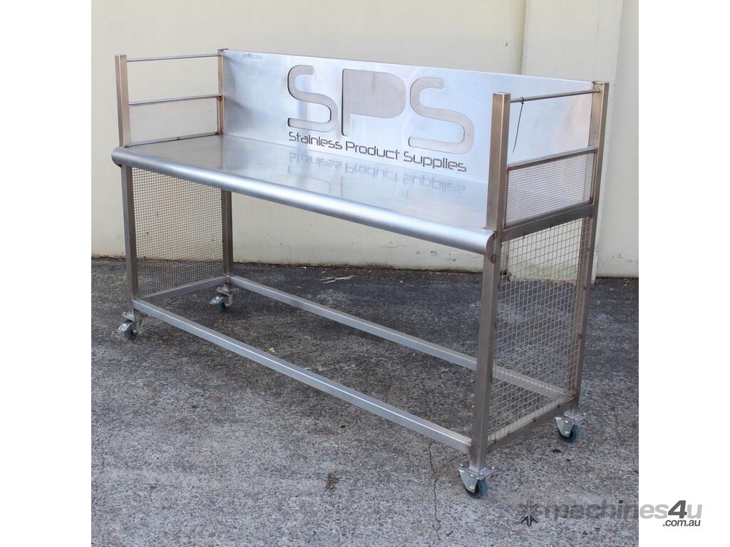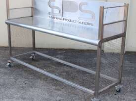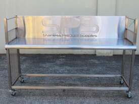 Stainless Steel Mobile Bench With Splashback, "SPS", dimensions: 1920mm long x 600mm deep x 900mm high, splashback wall 400mm high, overall external dimensions: 2000mm x 650mm x 1300mm