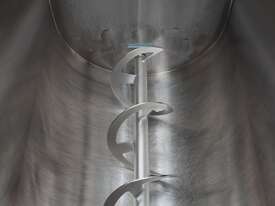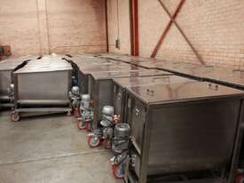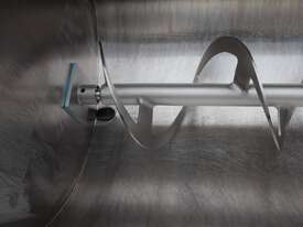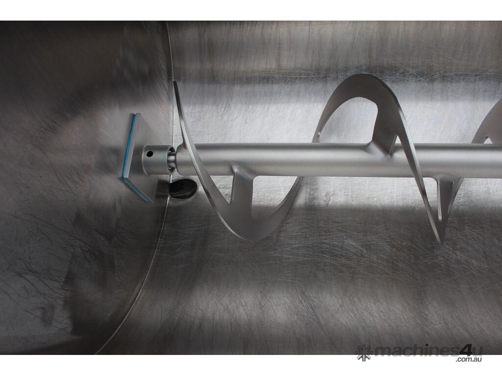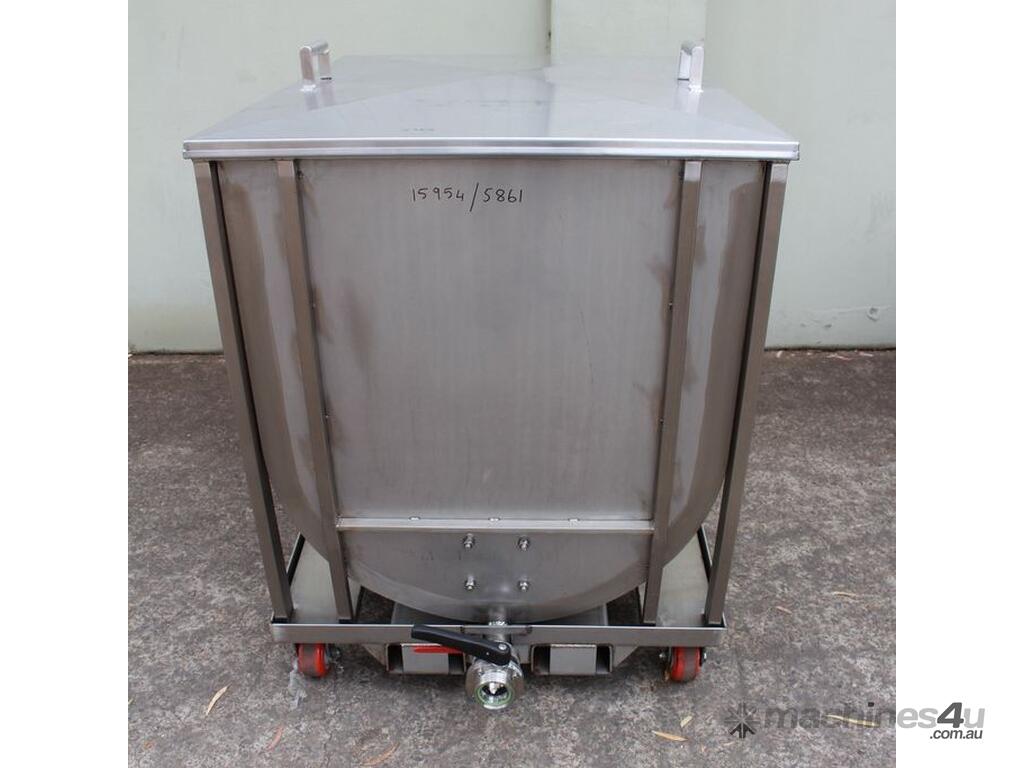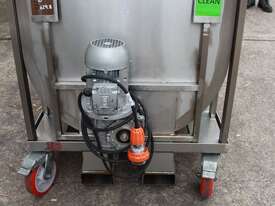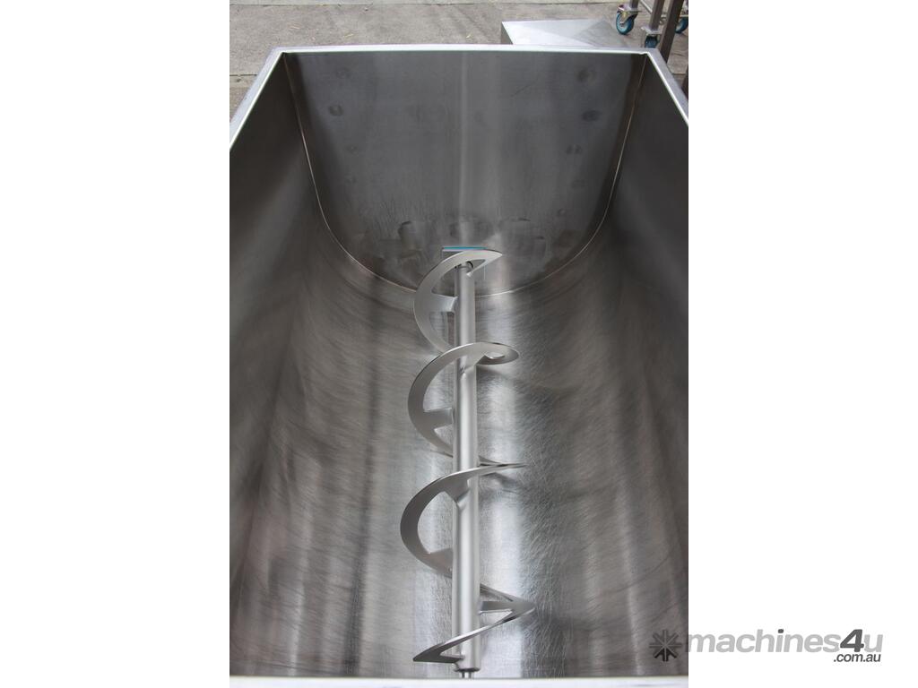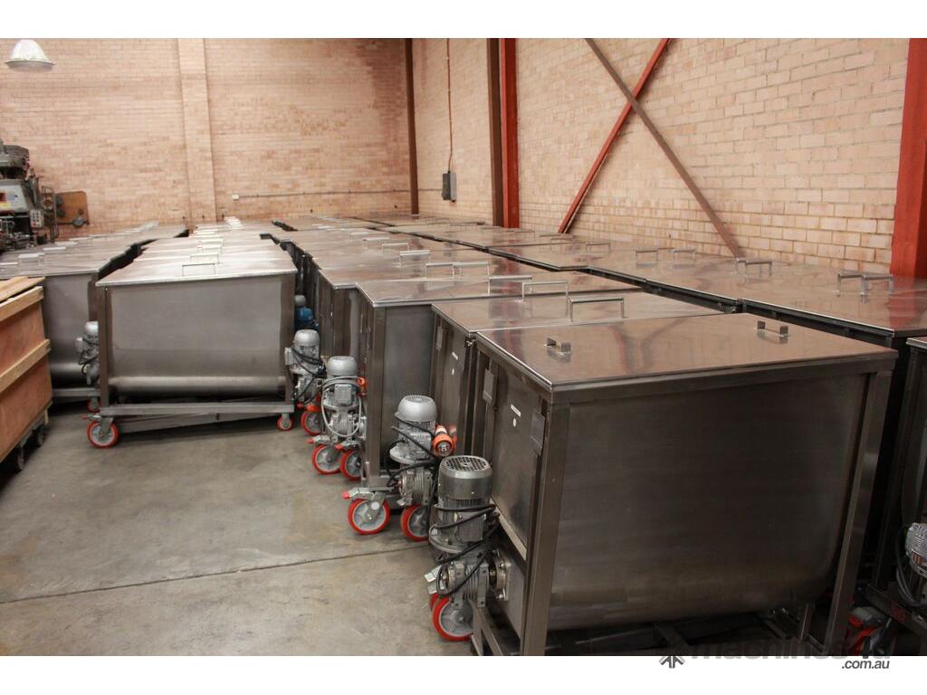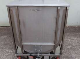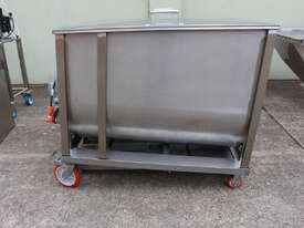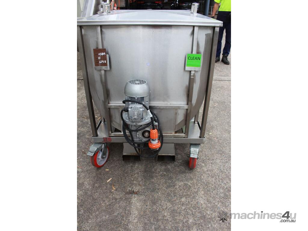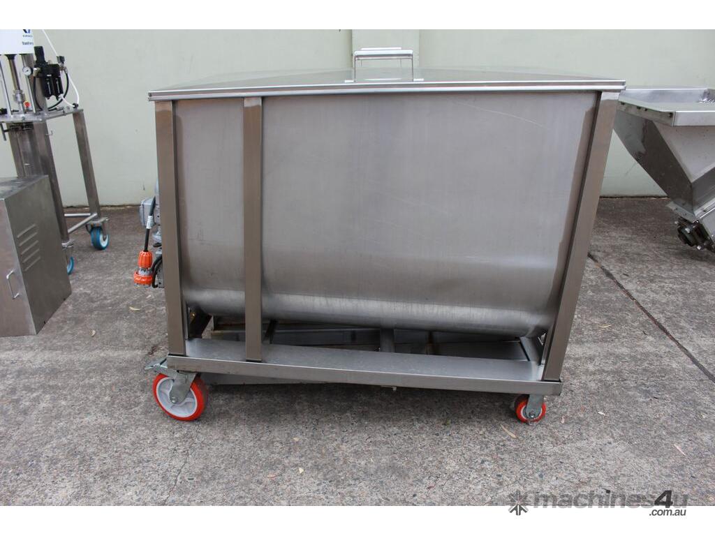Stainless Steel Mobile Feed Hopper, internal size: 1210 x 800 x 800mm average depth, approx. capacity 800L, sloping semi cylindrical bottom, with a 50mm dia outlet and a valve, 300mm dia ribbon type mixer for discharge driven by a 0.55kw three phase geared motor at approx. 22rpm, one stainless steel lid with handles, the vat is mobile with 2 locked wheels and a forklift attachment. 40+ available