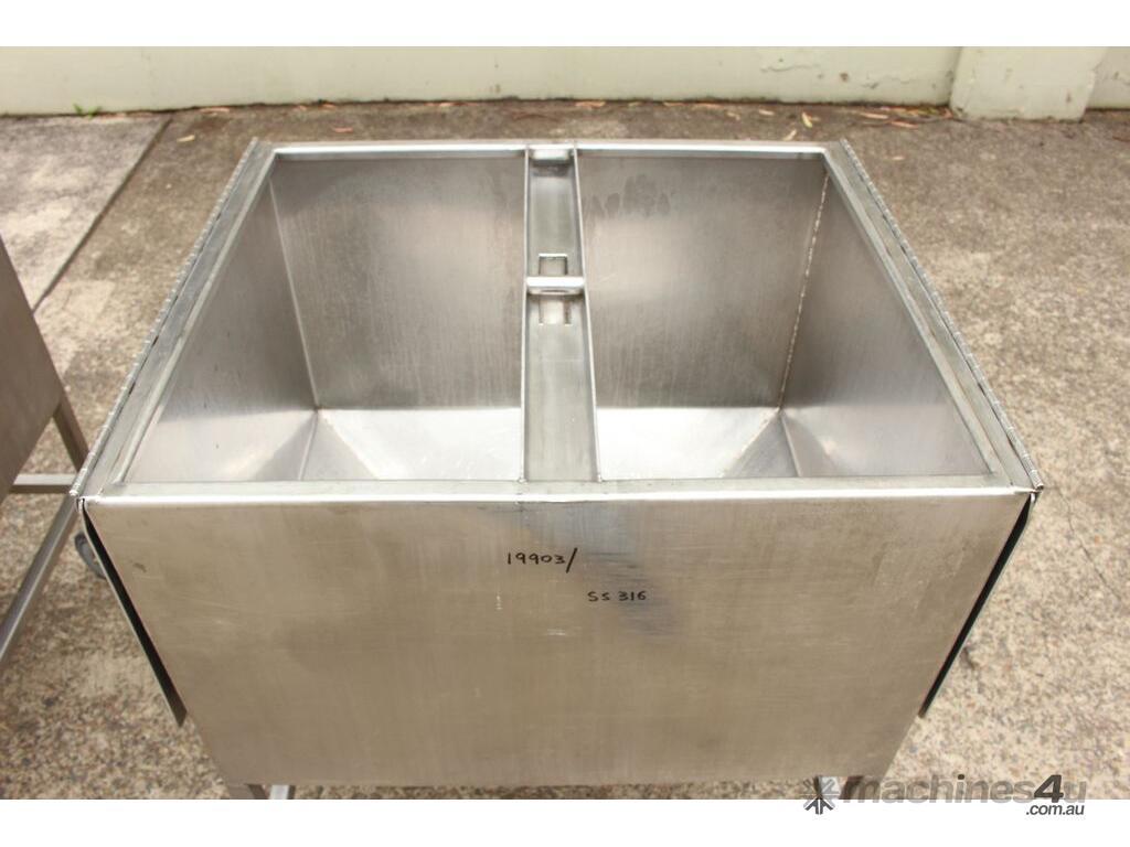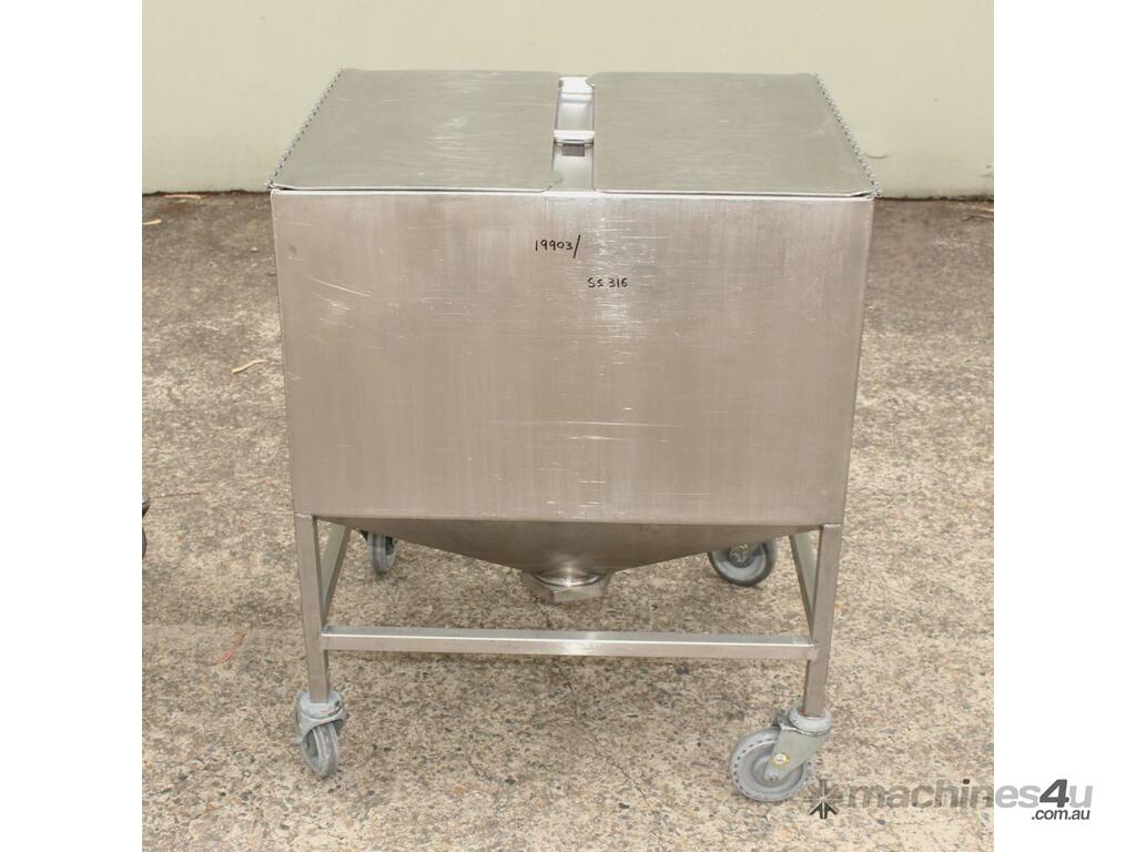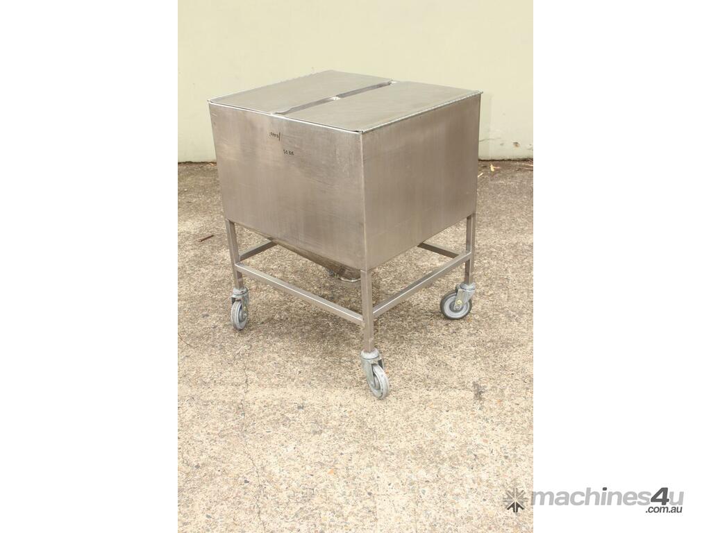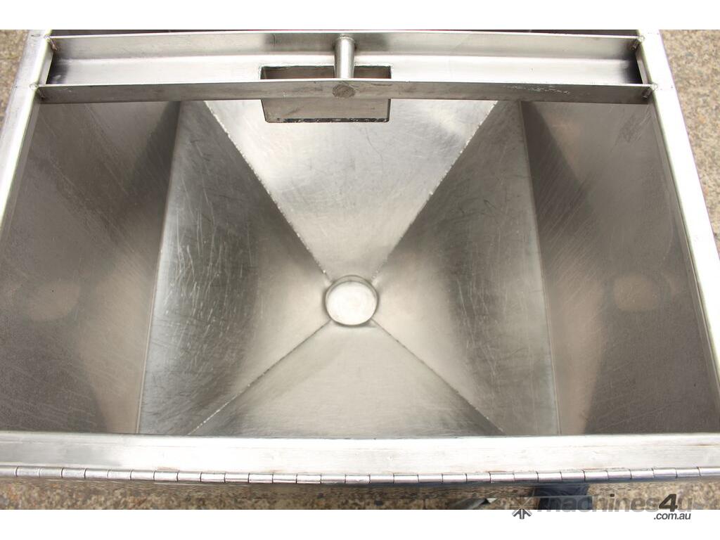 Stainless Steel Mobile Hopper Bin, 150L capacity, internal dimensions: 650mm x 560mm x 420mm deep wall, complete with 2 x hinged lids, conical bottom to a 100mm dia outlet, all stainless steel frame