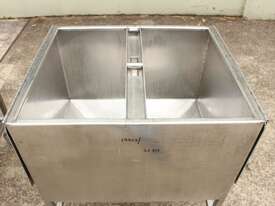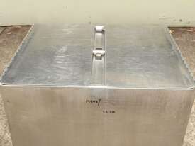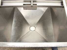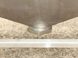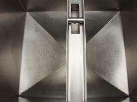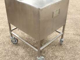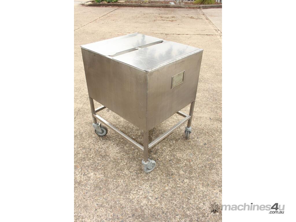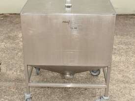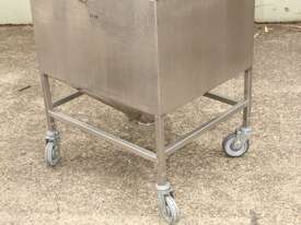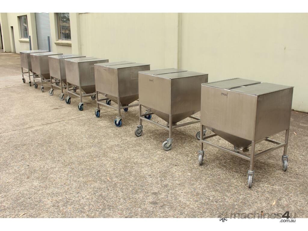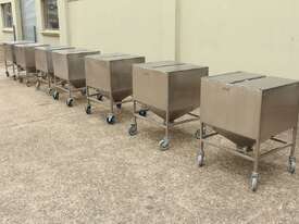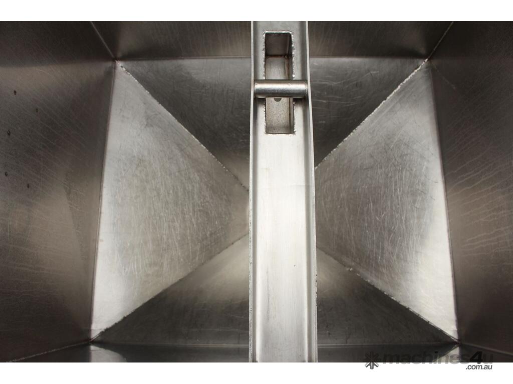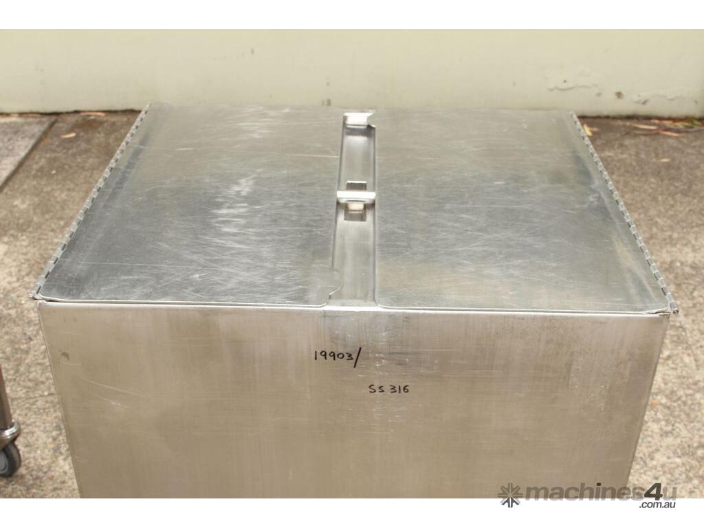 Stainless Steel Mobile Hopper Bin, 150L capacity, internal dimensions: 650mm x 560mm x 420mm deep wall, complete with 2 x hinged lids, conical bottom to a 100mm dia outlet, all stainless steel frame