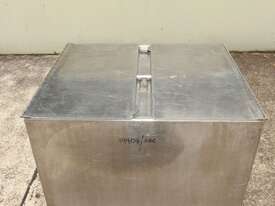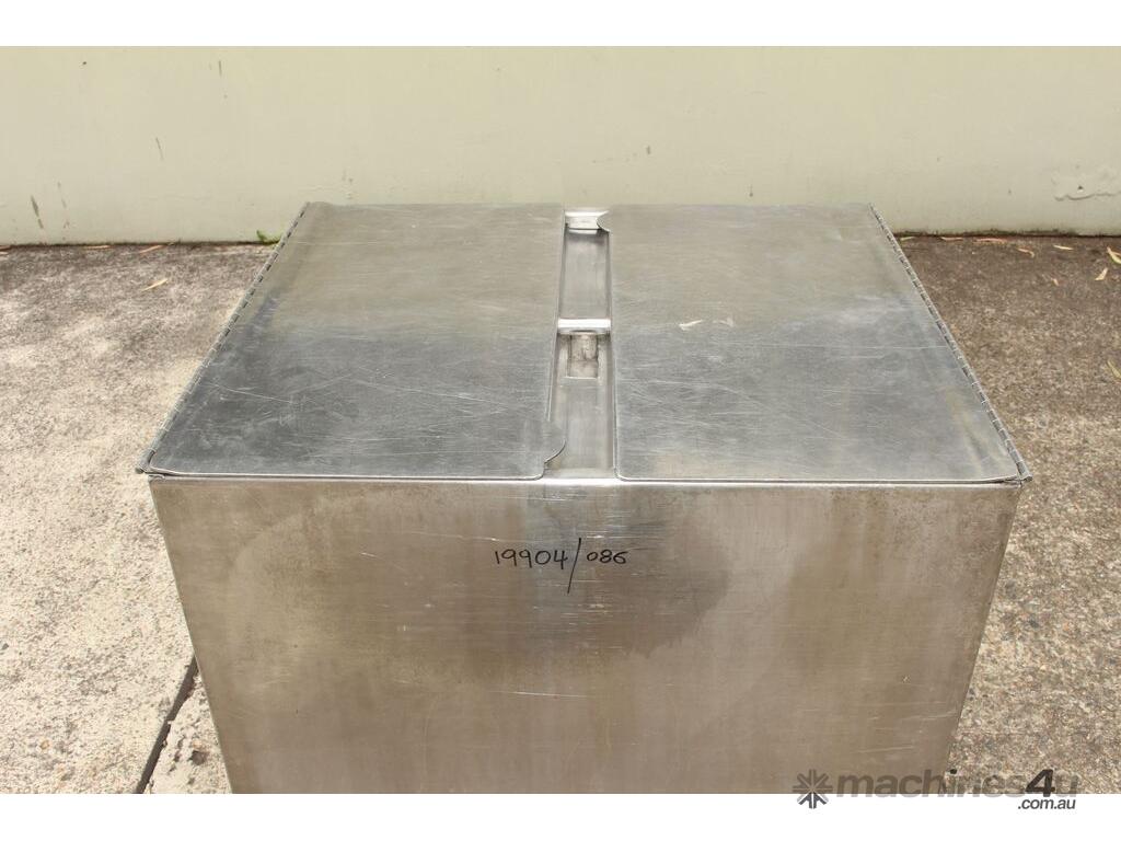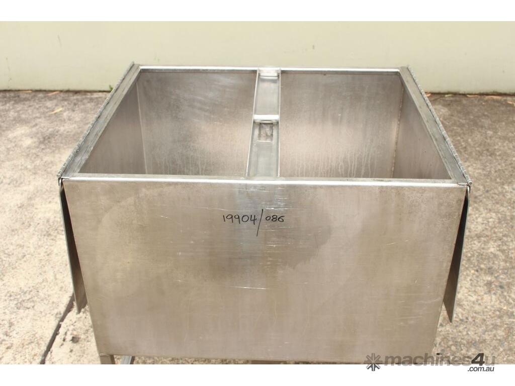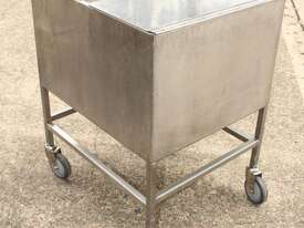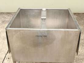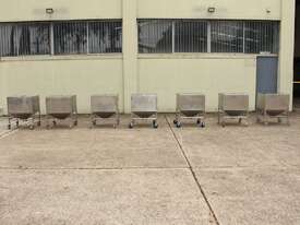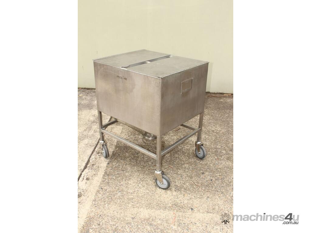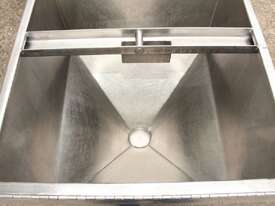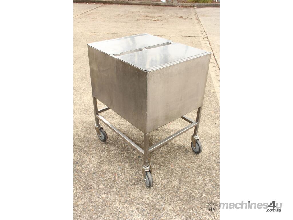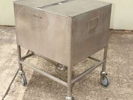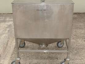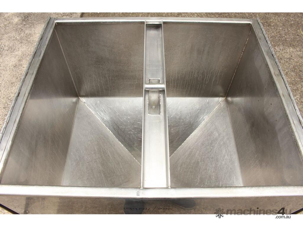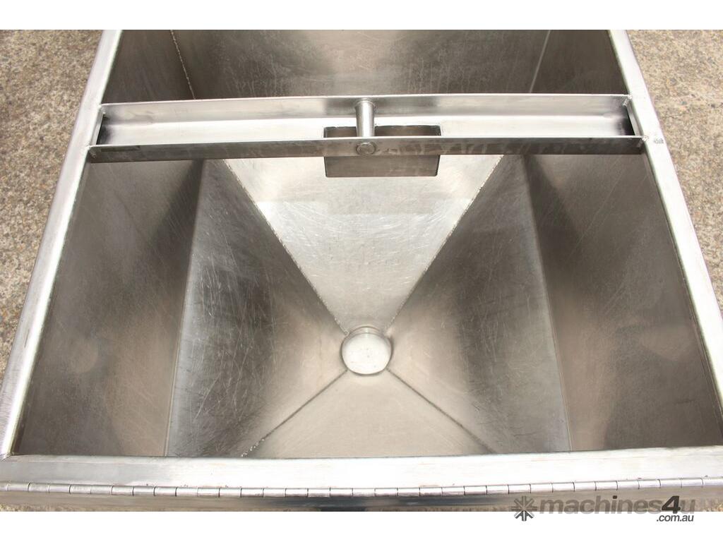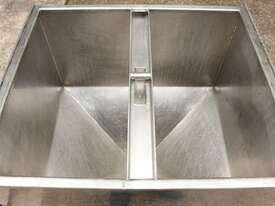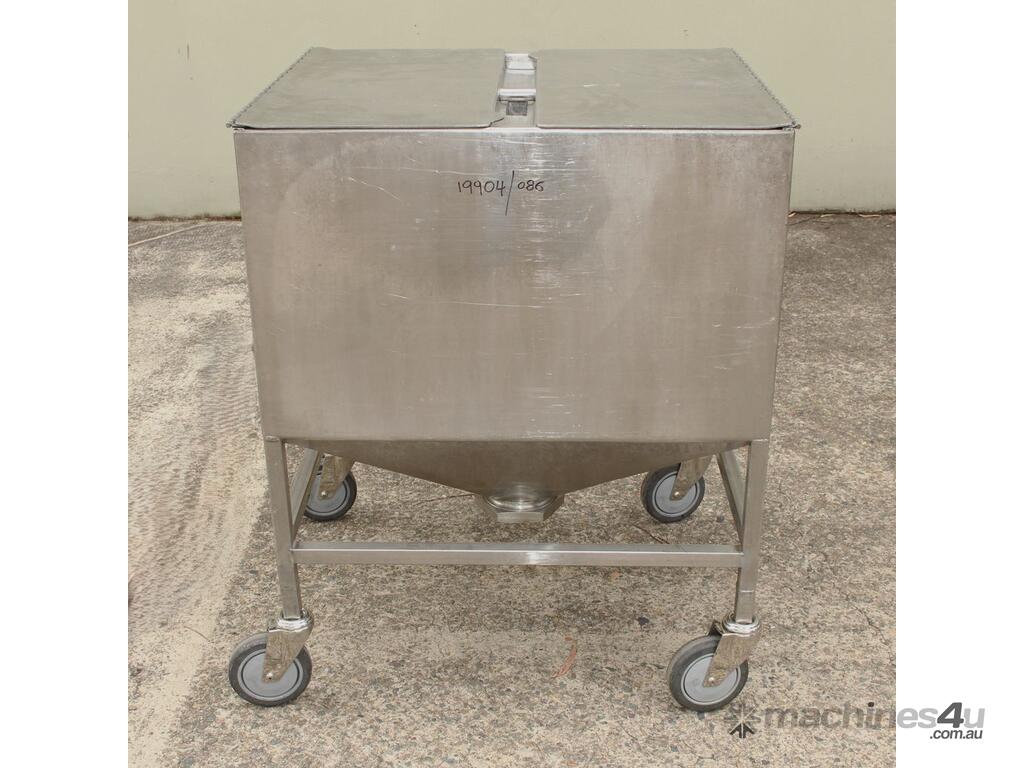 Stainless Steel Mobile Hopper Bin, 150L capacity, internal dimensions: 650mm x 560mm x 420mm deep wall, complete with 2 x hinged lids, conical bottom to a 100mm dia outlet, all stainless steel frame