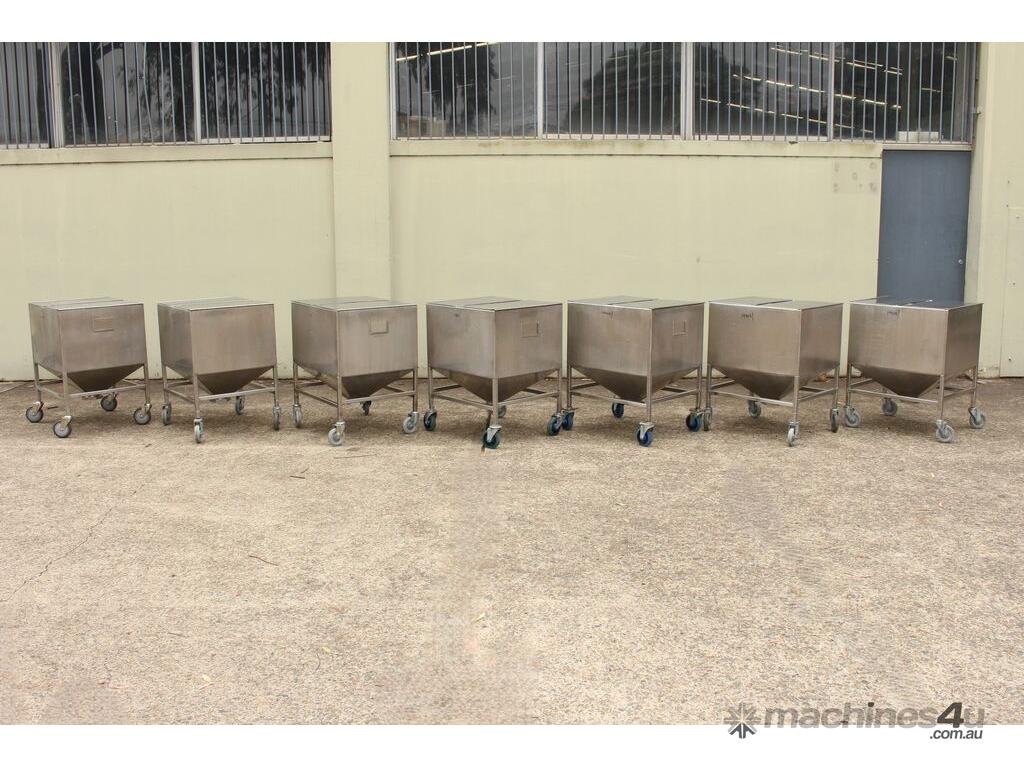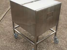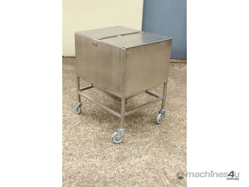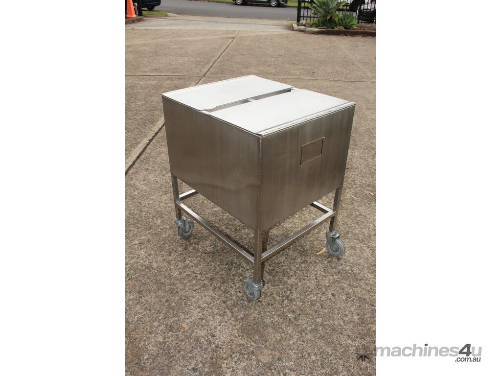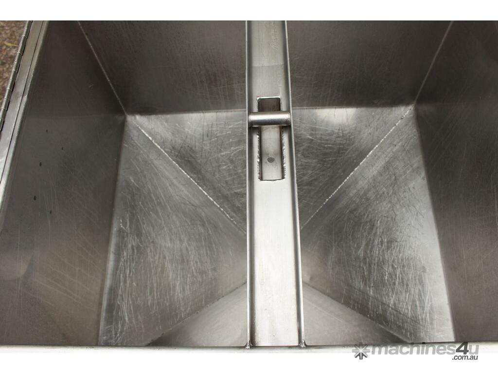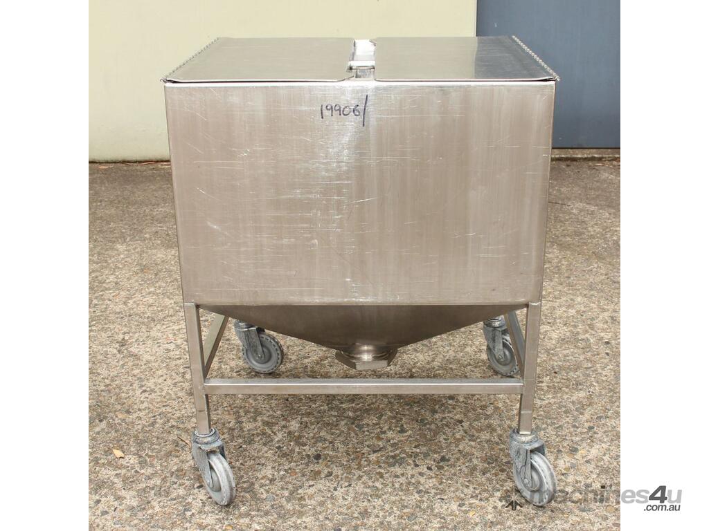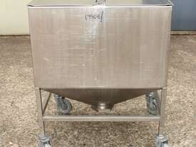 Stainless Steel Mobile Hopper Bin, 150L capacity, internal dimensions: 650mm x 560mm x 420mm deep wall, complete with 2 x hinged lids, conical bottom to a 100mm dia outlet, all stainless steel frame