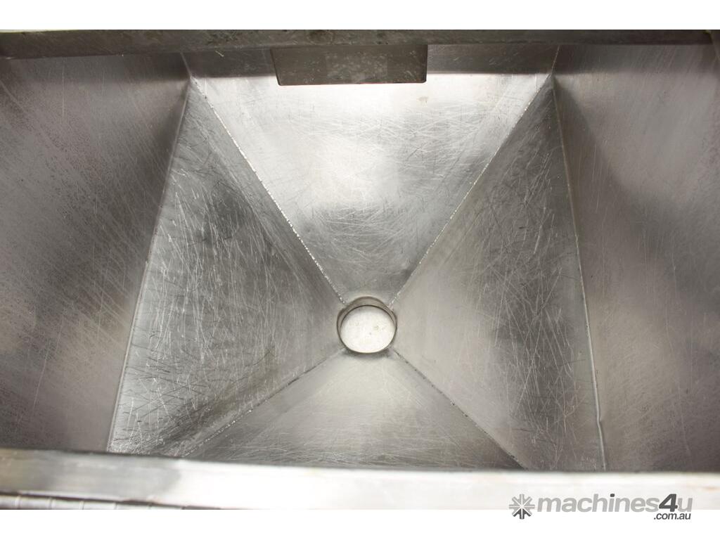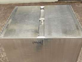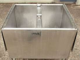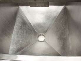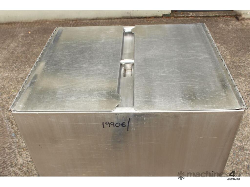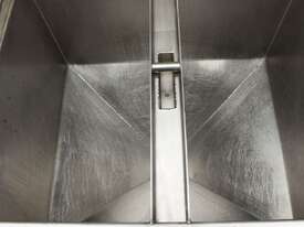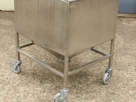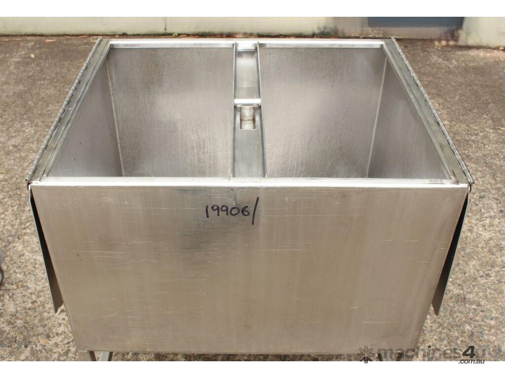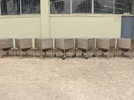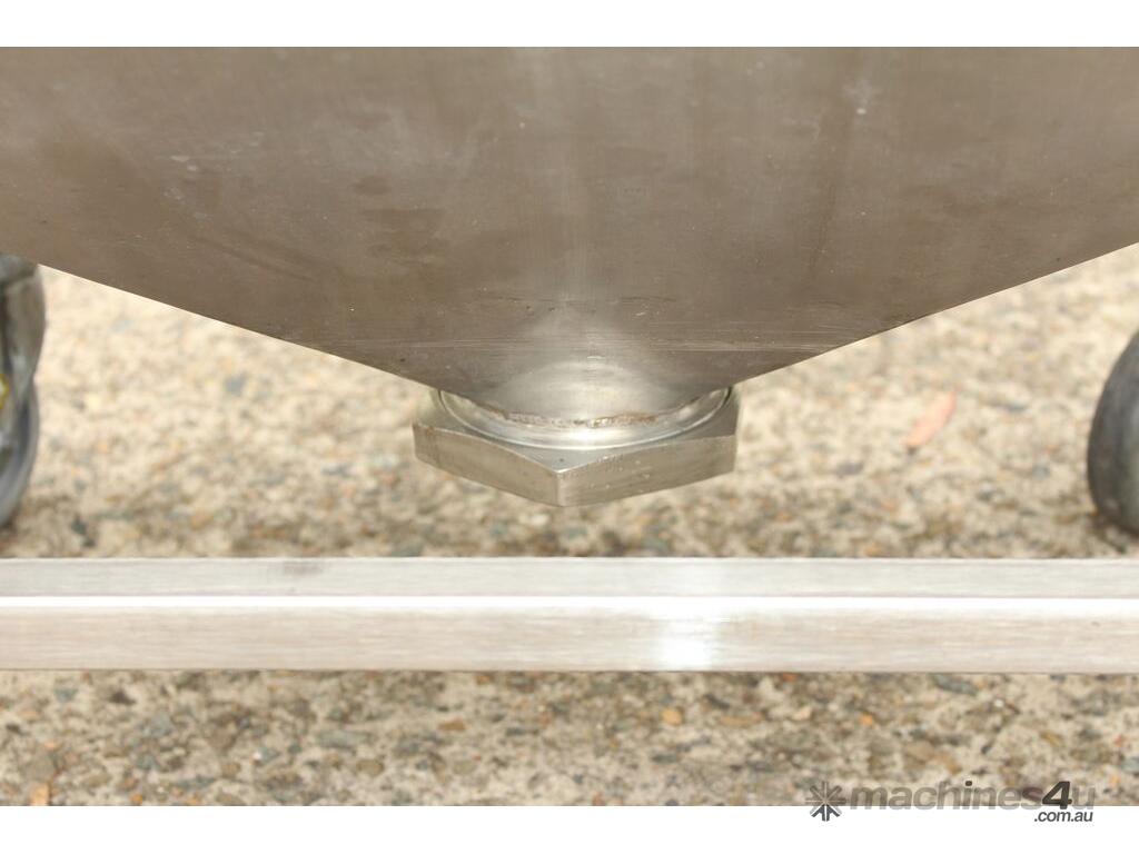 Stainless Steel Mobile Hopper Bin, 150L capacity, internal dimensions: 650mm x 560mm x 420mm deep wall, complete with 2 x hinged lids, conical bottom to a 100mm dia outlet, all stainless steel frame