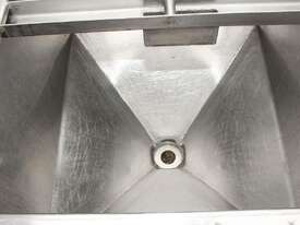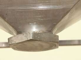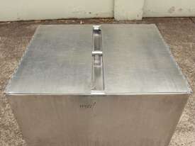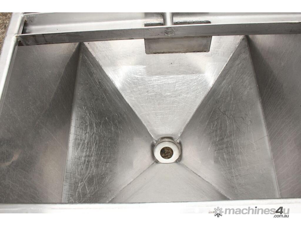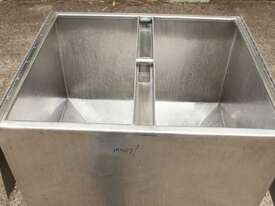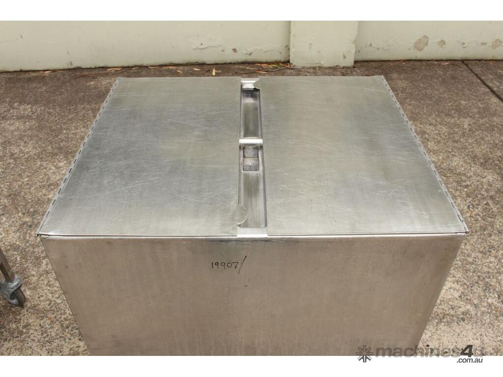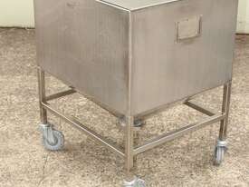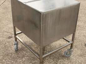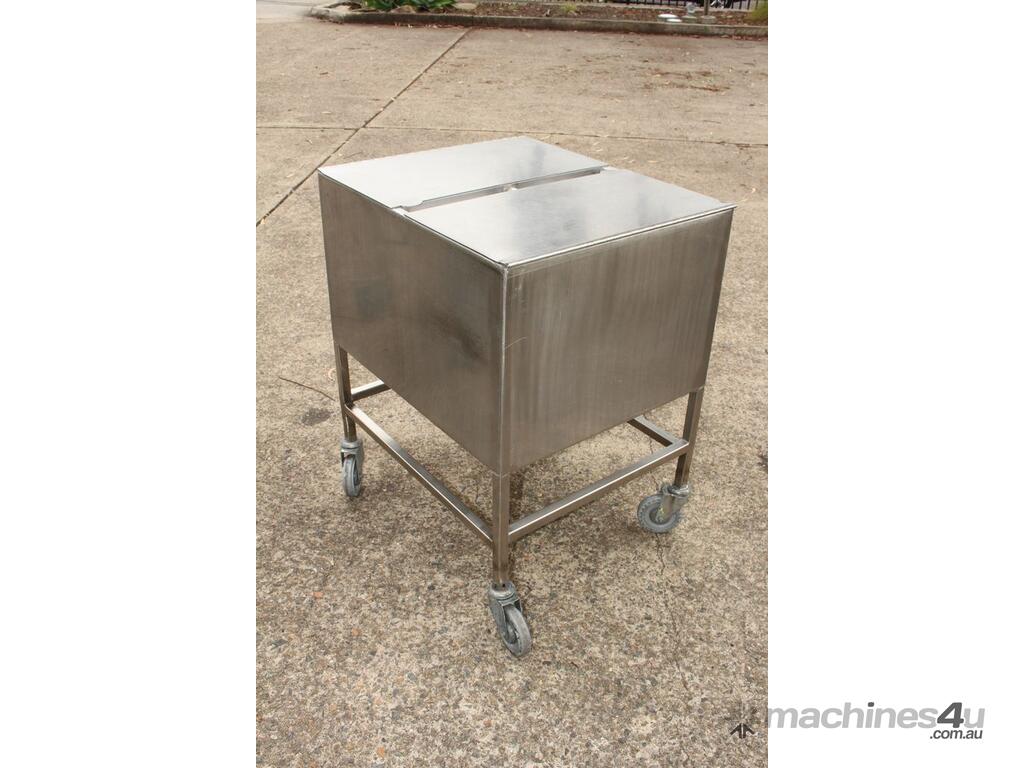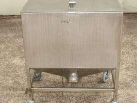 Stainless Steel Mobile Hopper Bin, 150L capacity, internal dimensions: 650mm x 560mm x 420mm deep wall, complete with 2 x hinged lids, conical bottom to a 100mm dia outlet, all stainless steel frame
