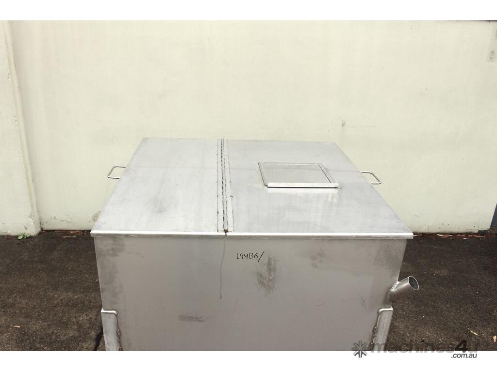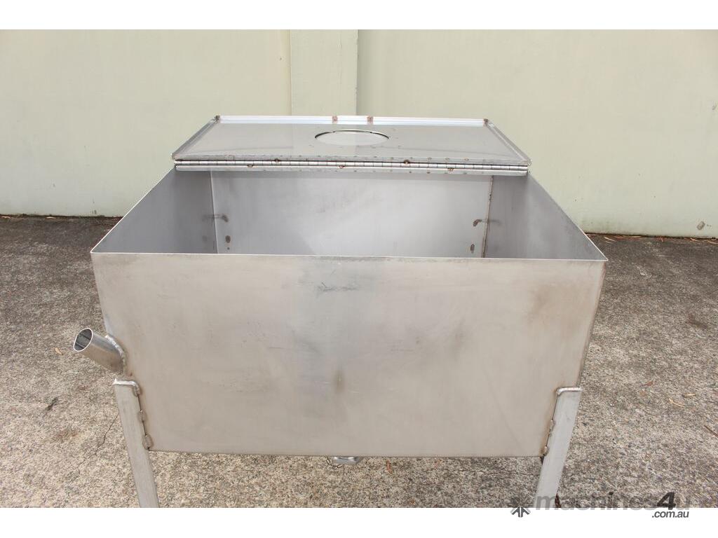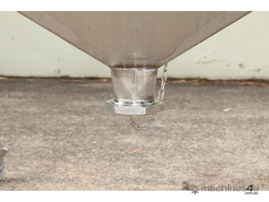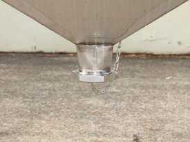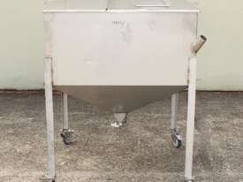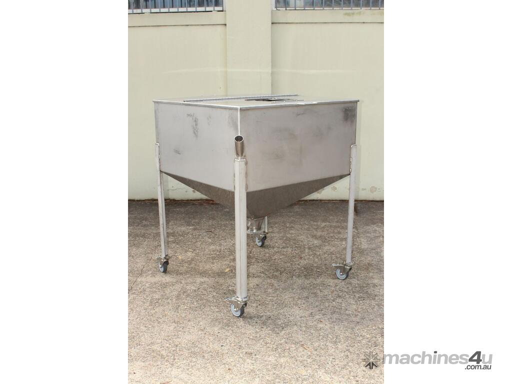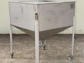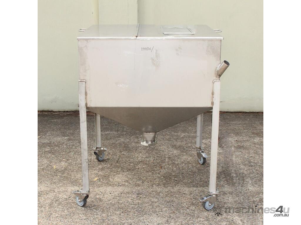 Stainless Steel Mobile Hopper, completely enclosed, open top with two stainless steel hinged lids, internal dimensions: (L x W x H): 1000mm x 1000mm x 800mm deep, 100mm dia bottom discharge, overall dimensions: (L x W x H): 1010mm x 1030mm x 1320mm