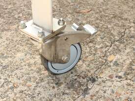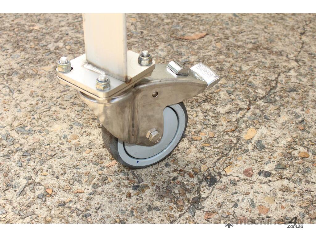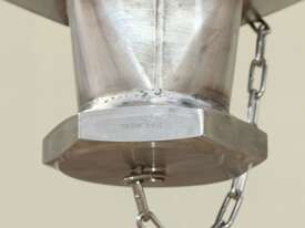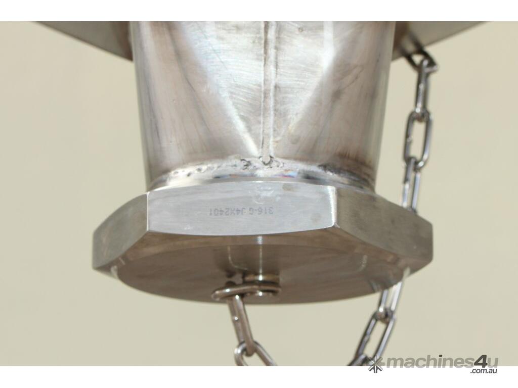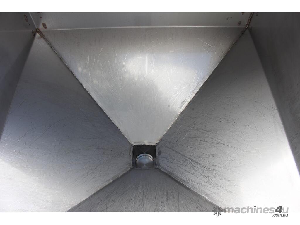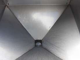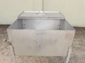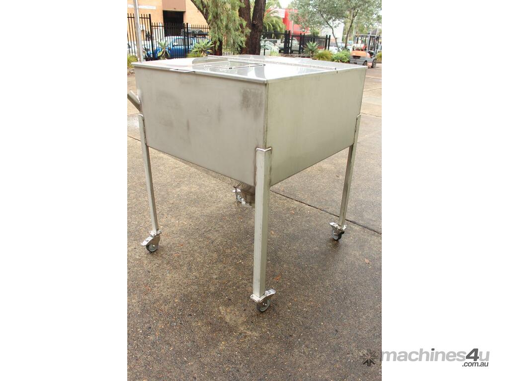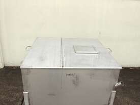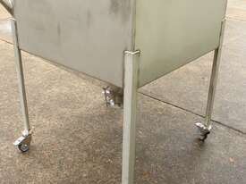 Stainless Steel Mobile Hopper, completely enclosed, open top with two stainless steel hinged lids, internal dimensions: (L x W x H): 1000mm x 1000mm x 800mm deep, 100mm dia bottom discharge, overall dimensions: (L x W x H): 1010mm x 1030mm x 1320mm