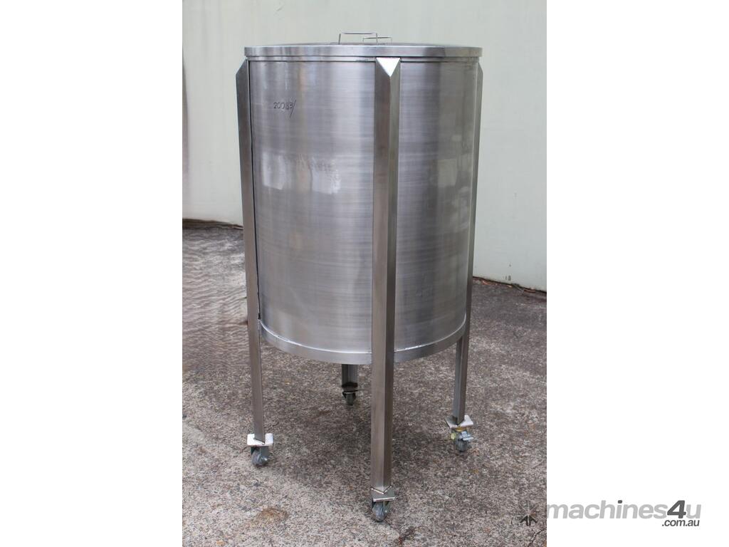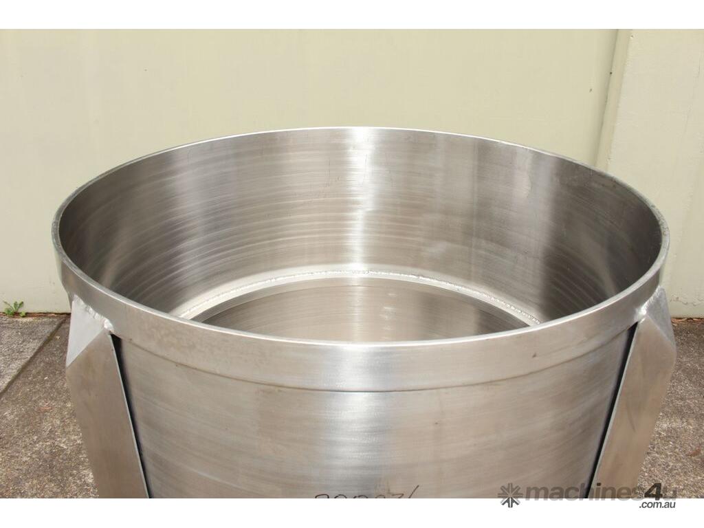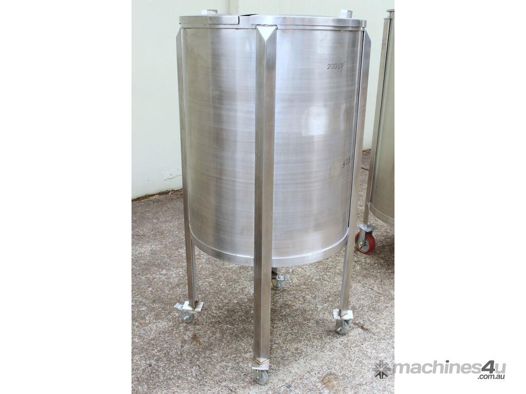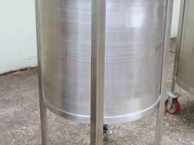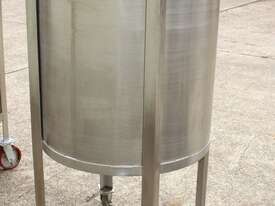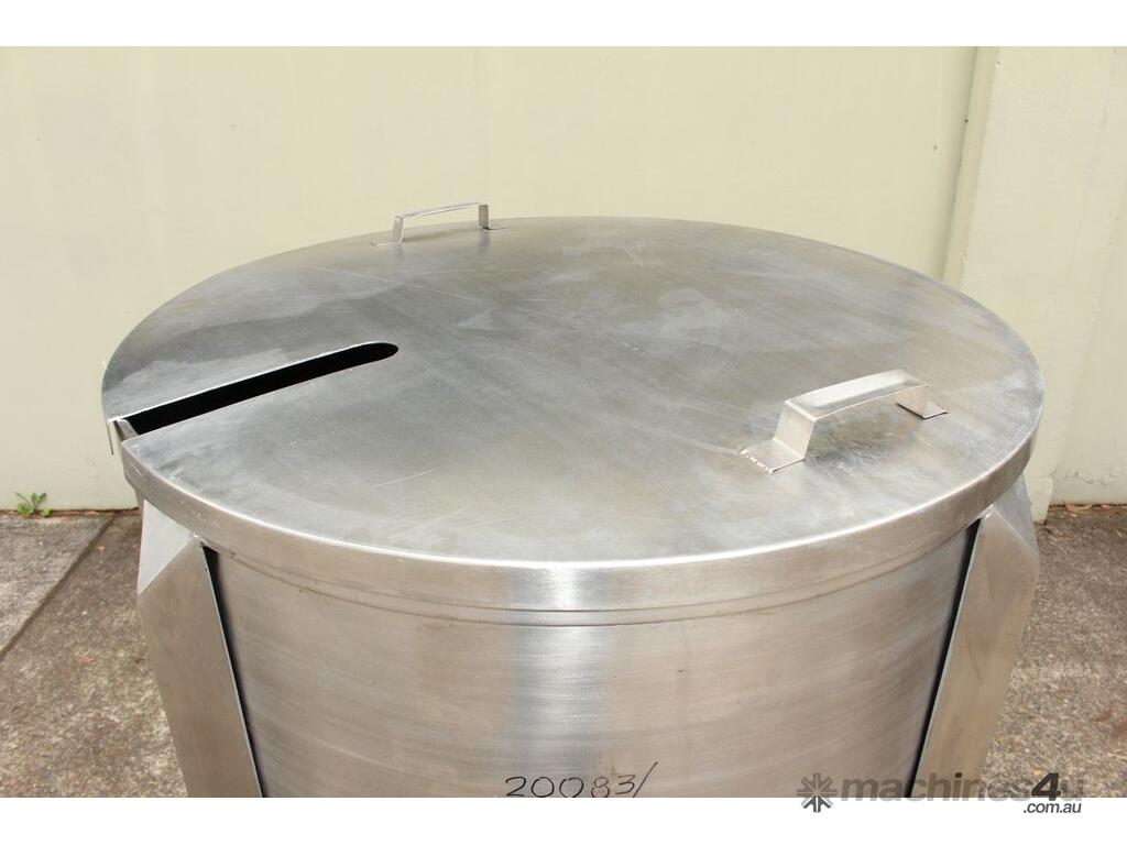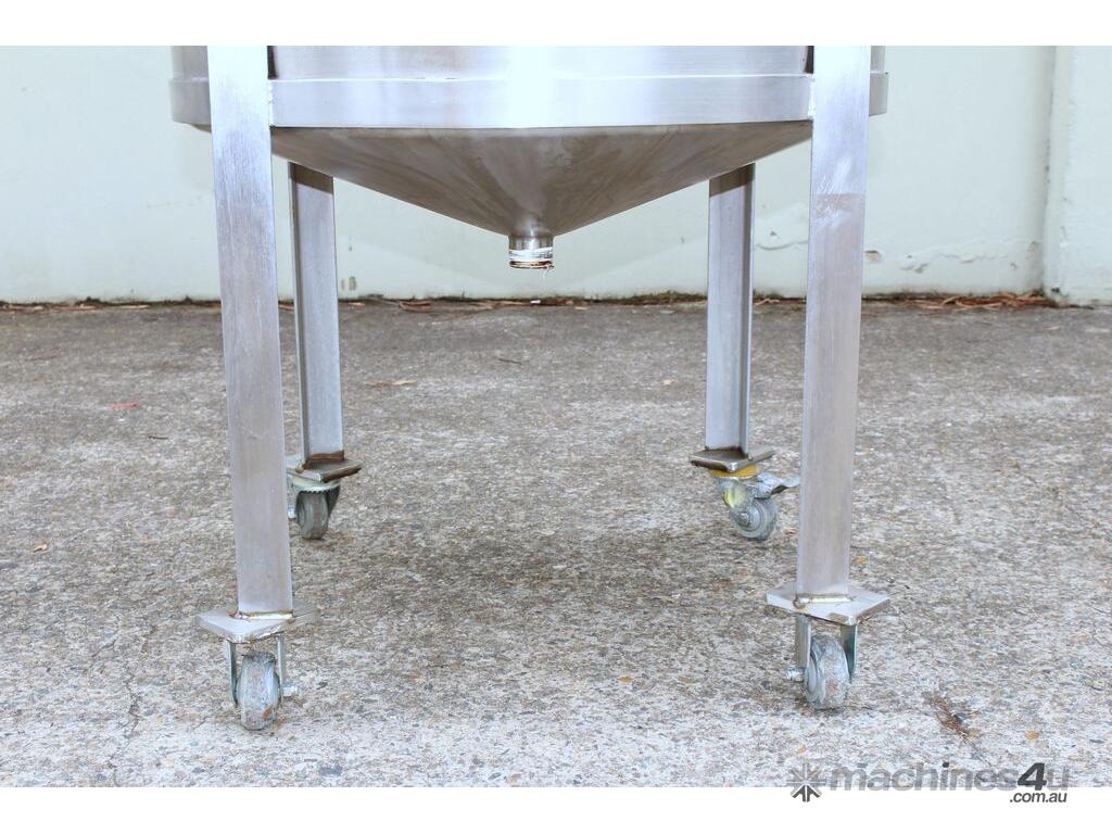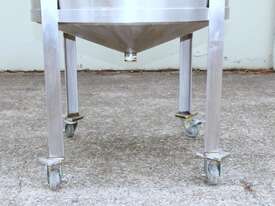 Stainless Steel Mobile Tank, capacity 375L, internal dimensions: 720mm dia x 920mm deep, open top with lid, conical bottom with centre 40mm outlet