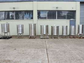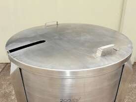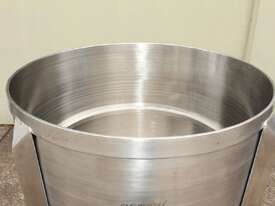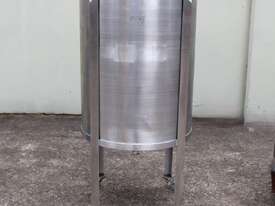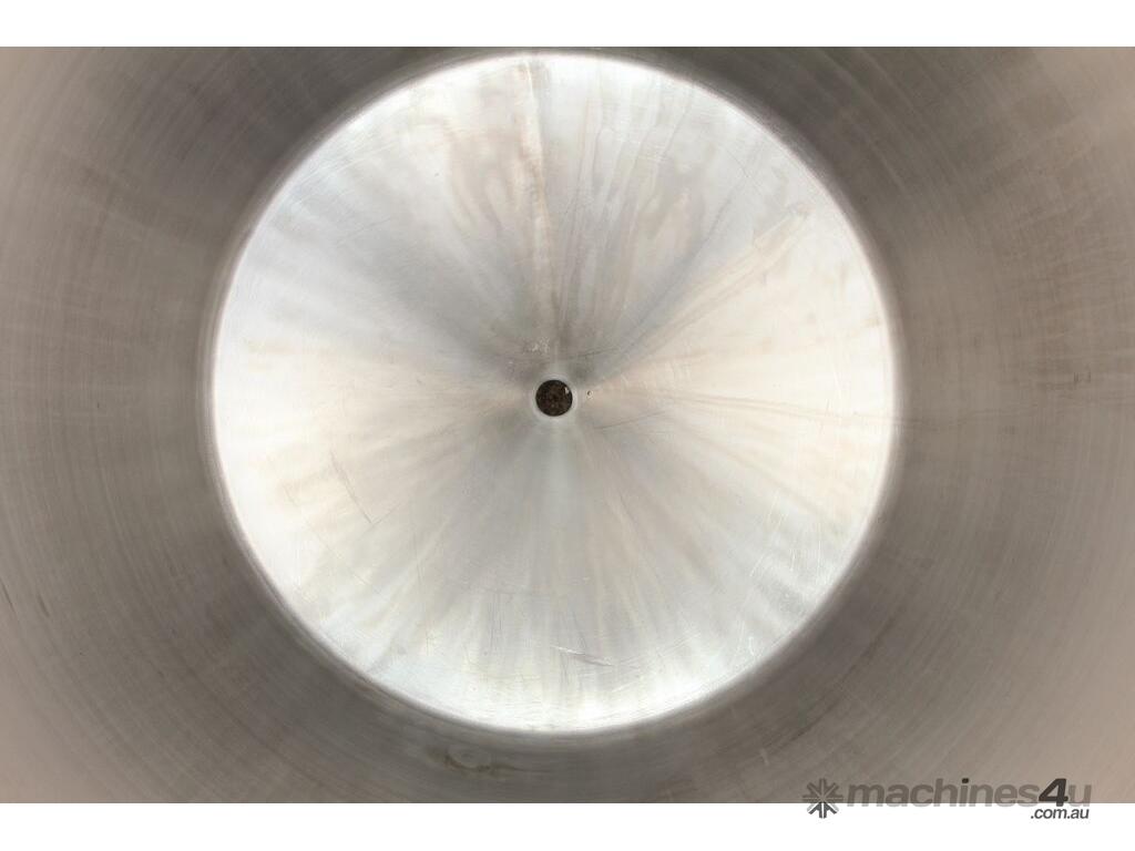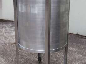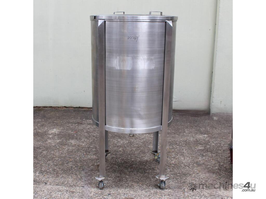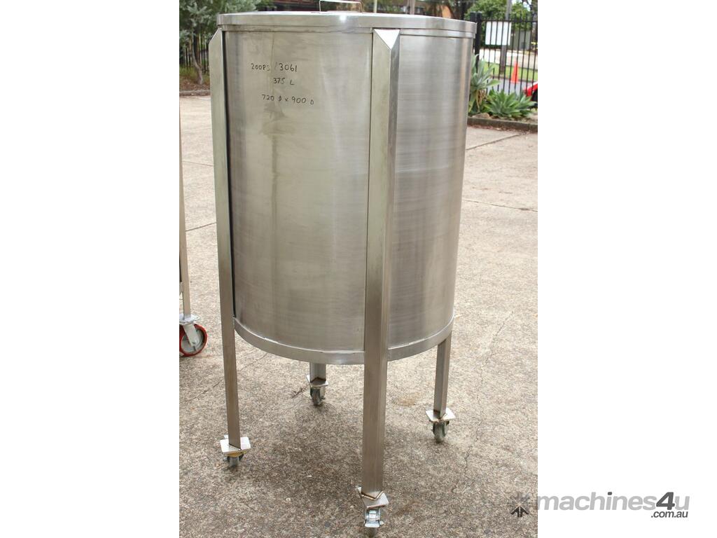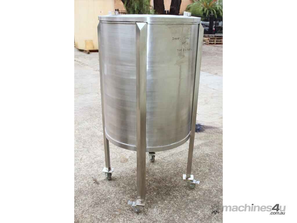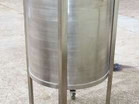 Stainless Steel Mobile Tank, capacity 375L, internal dimensions: 720mm dia x 920mm deep, open top with lid, conical bottom with centre 40mm outlet
