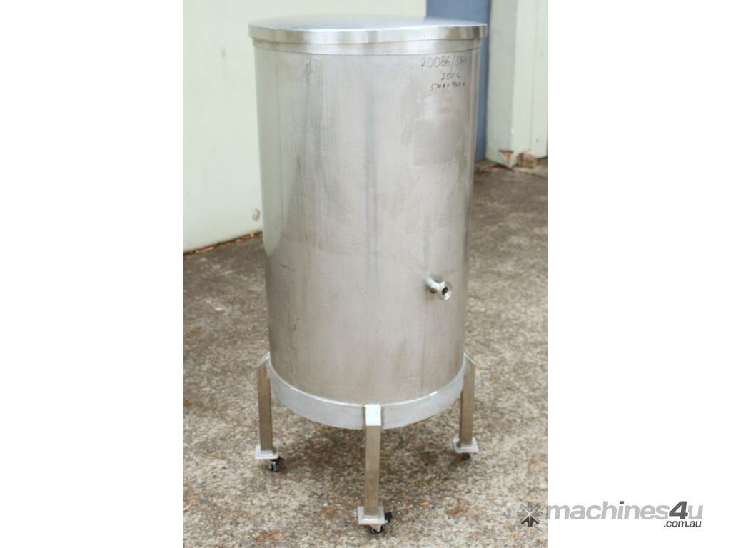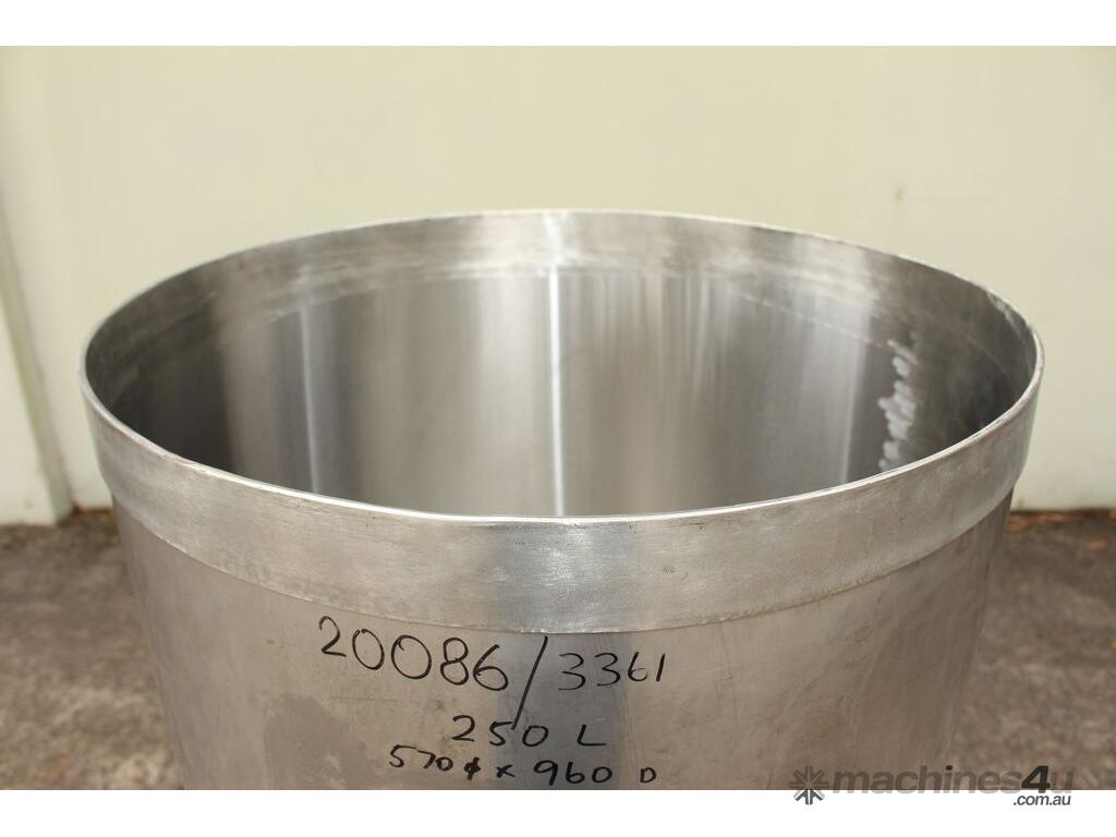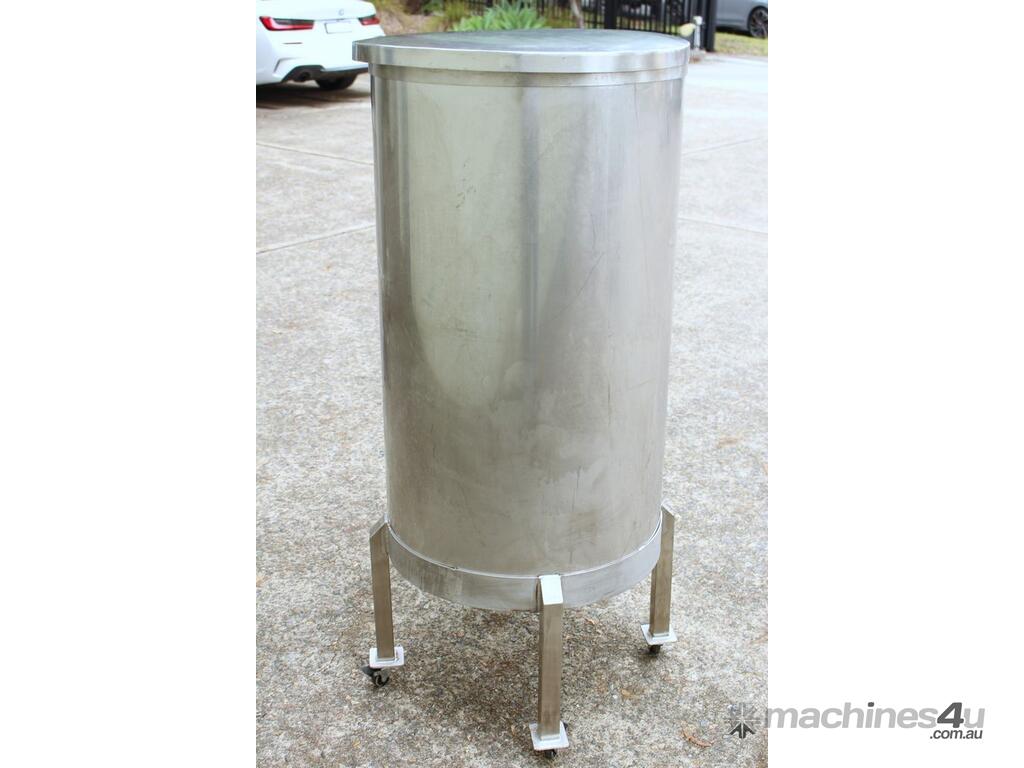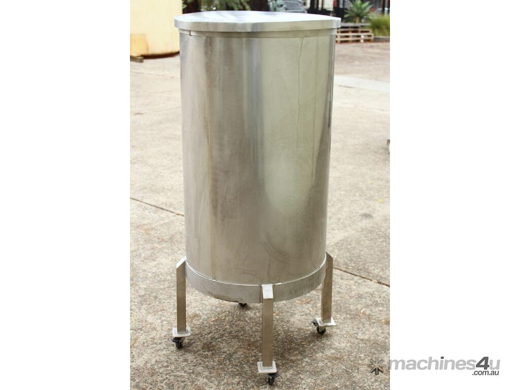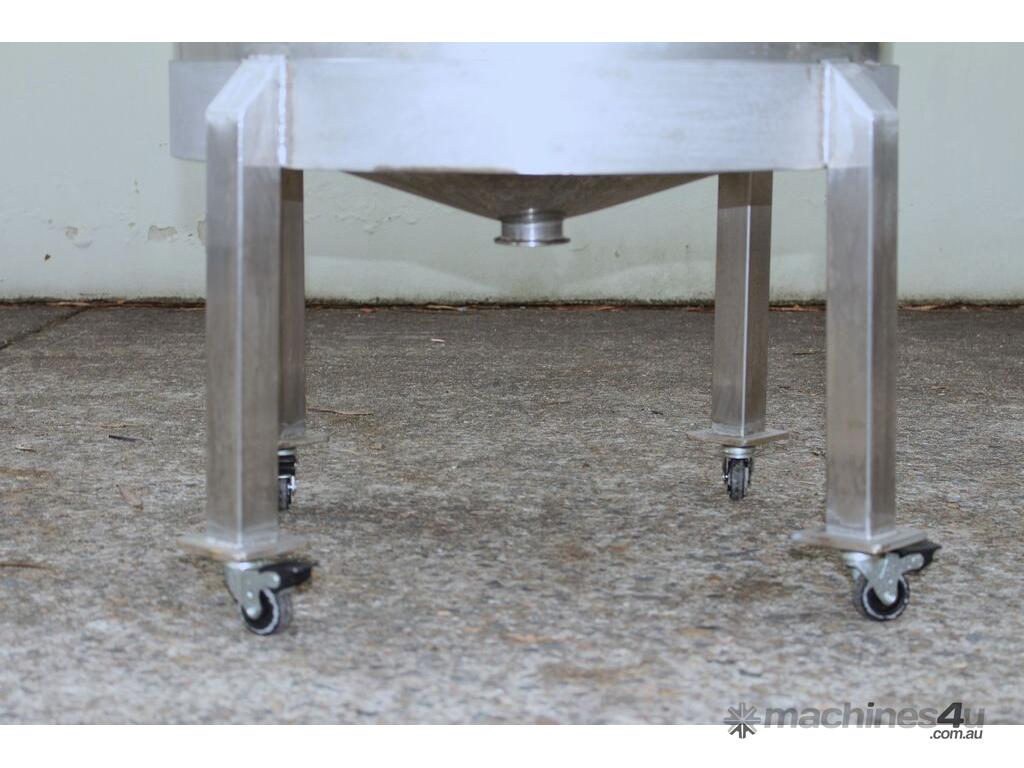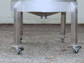 Stainless Steel Mobile Tank, capacity 250L, internal dimensions: 570mm dia x 950 mm deep, open top with lid, conical bottom with 50mm outlet at 270mm outlet height
