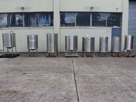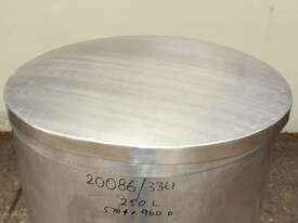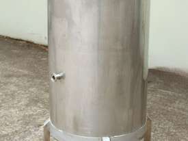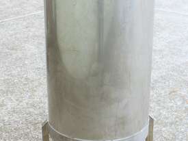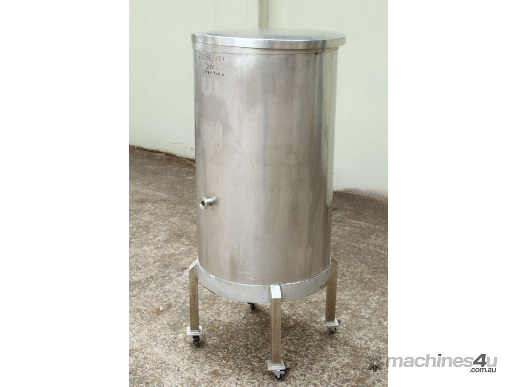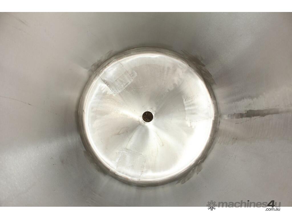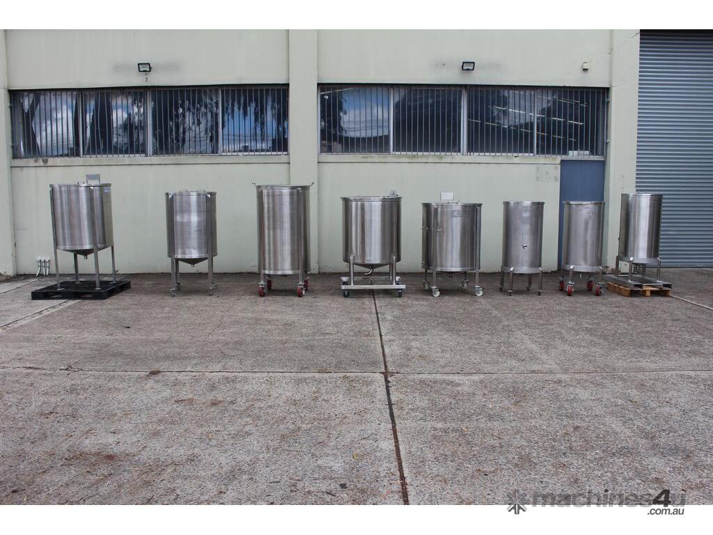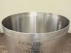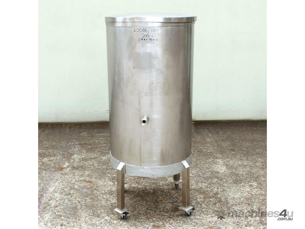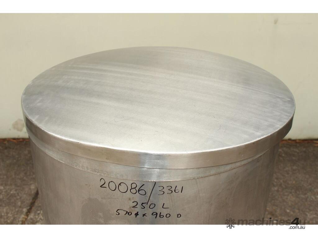 Stainless Steel Mobile Tank, capacity 250L, internal dimensions: 570mm dia x 950 mm deep, open top with lid, conical bottom with 50mm outlet at 270mm outlet height