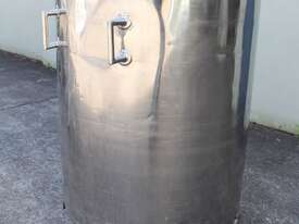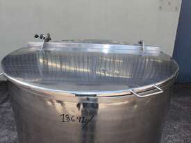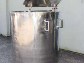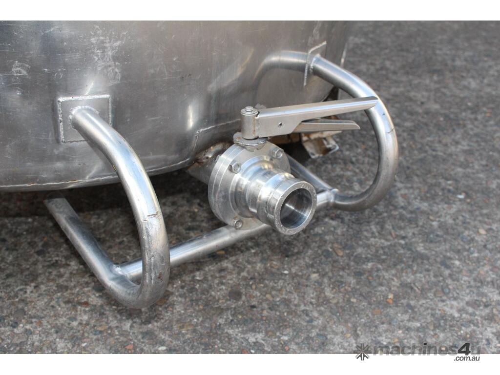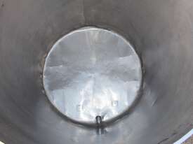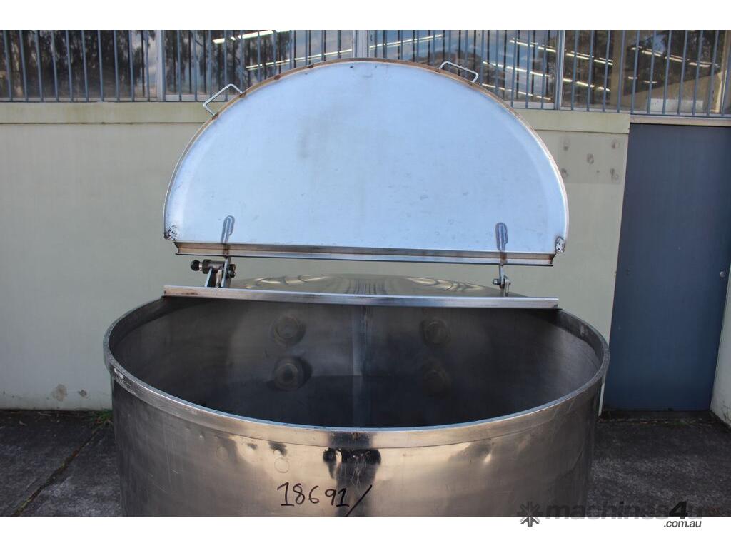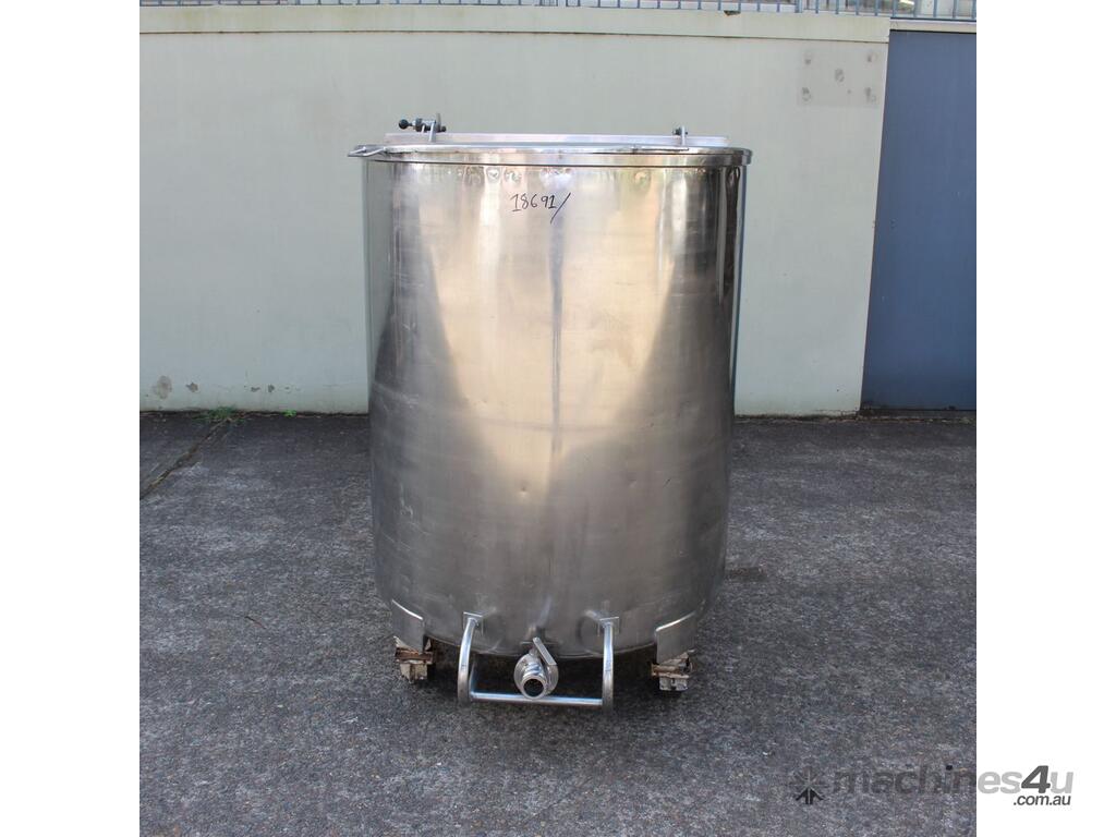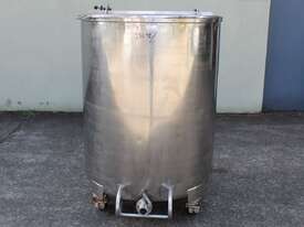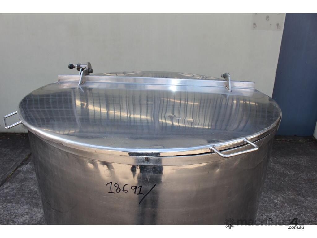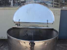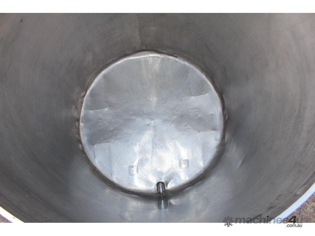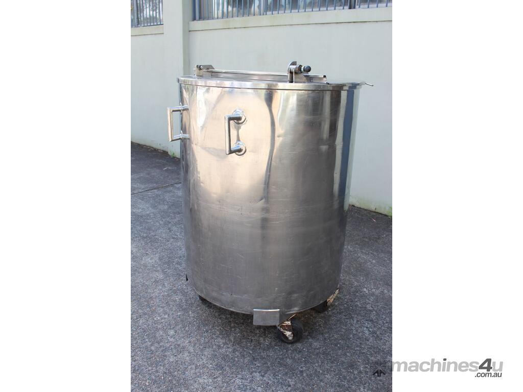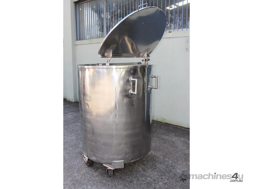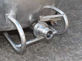 Stainless Steel Mobile Tank, 1000L capacity, 1010mm dia x 1250mm deep, open top with 2/3 hinged lid and a 1/3 fixed lid, sloping to side 50mm dia bottom outlet with valve, with 2 handles