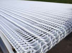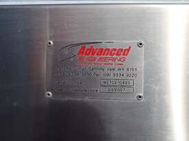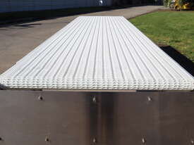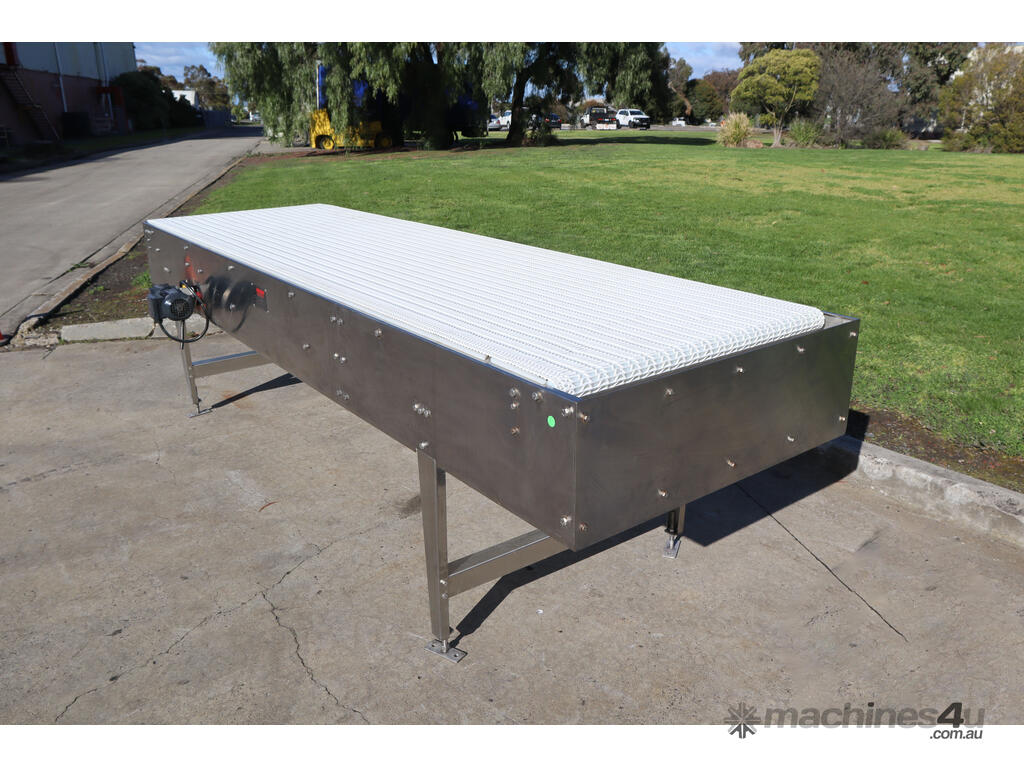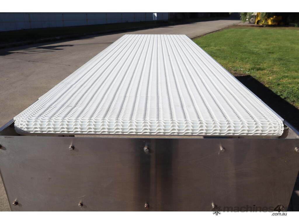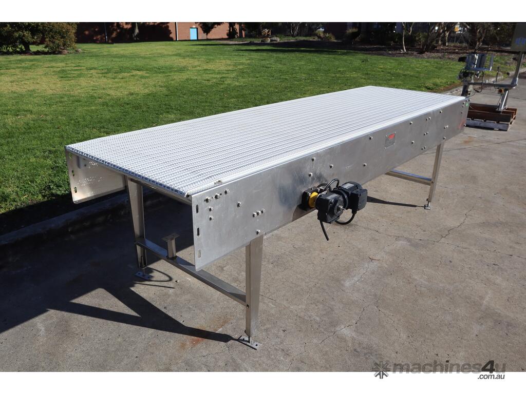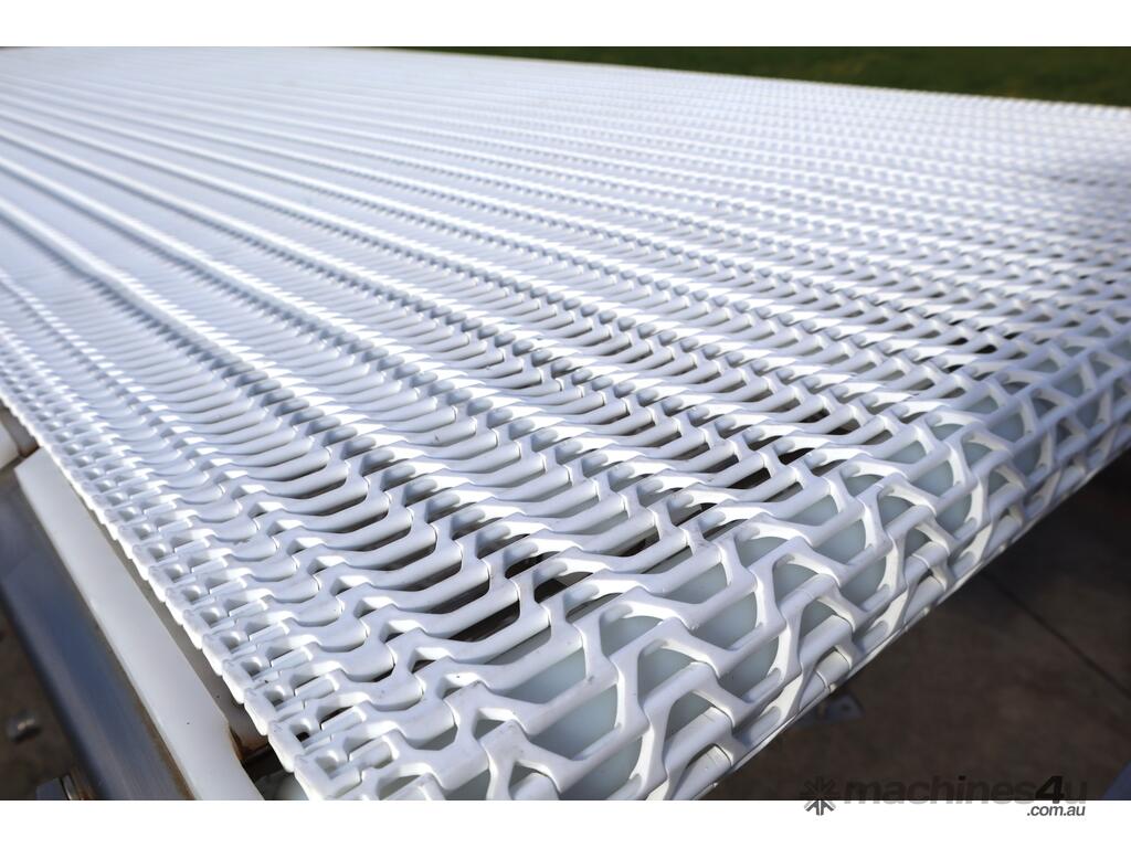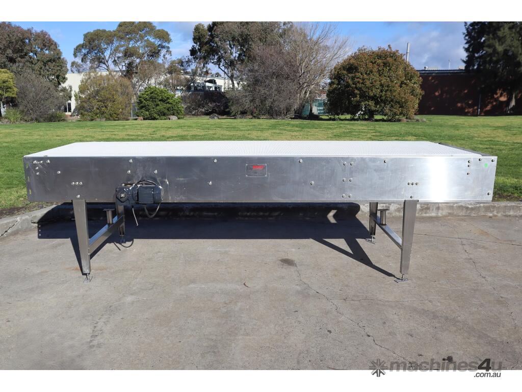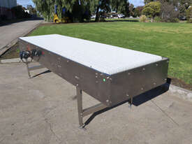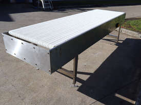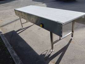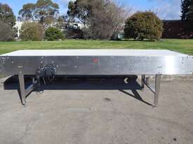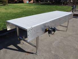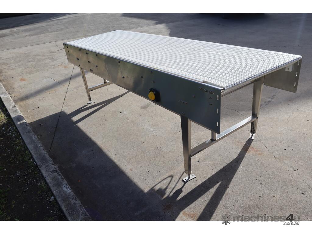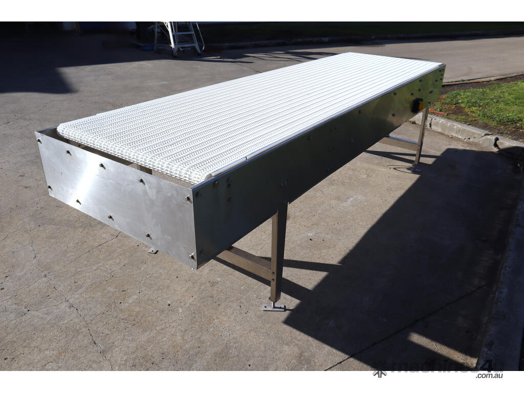 Motorised and with a stainless steel frame, this conveyor is in excellent condition. The belt is of a plastic modular type.