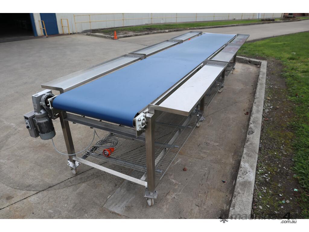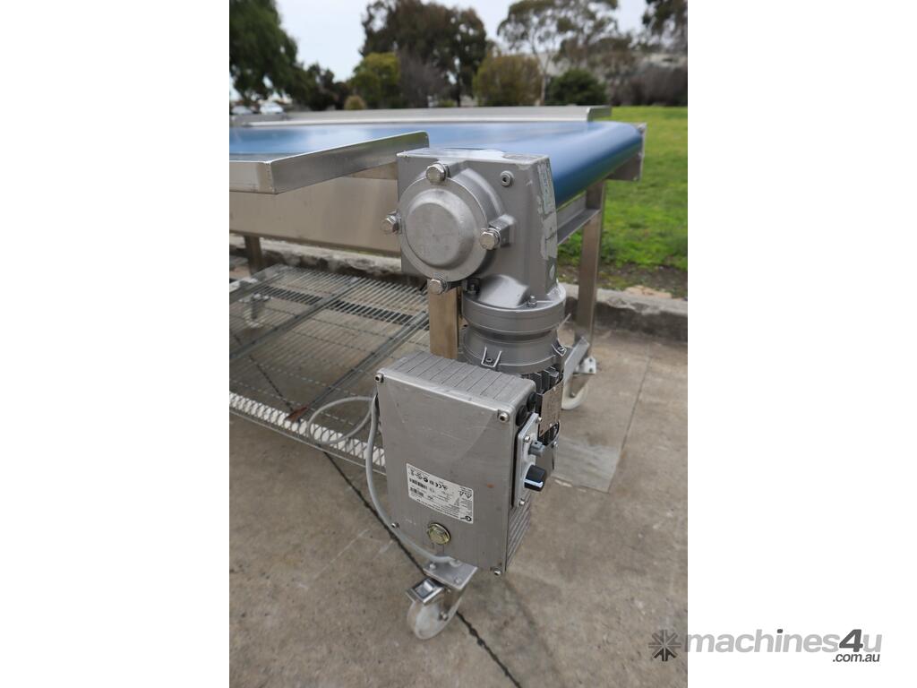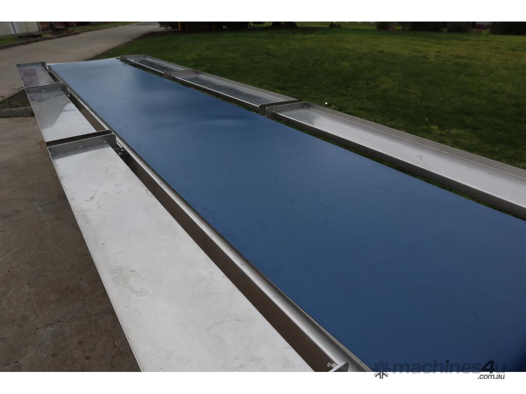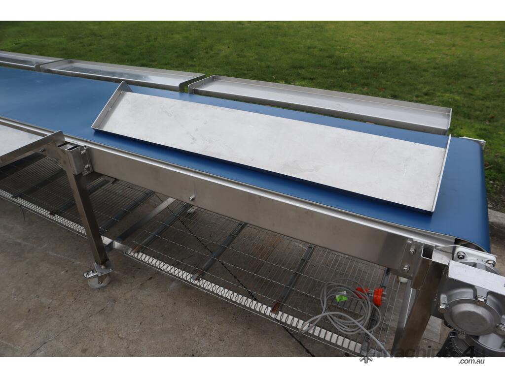 Motorised and with a stainless steel frame, this conveyor is in excellent condition. It comes with stainless steel trays that can be mounted on the sides and has a VSD installed.