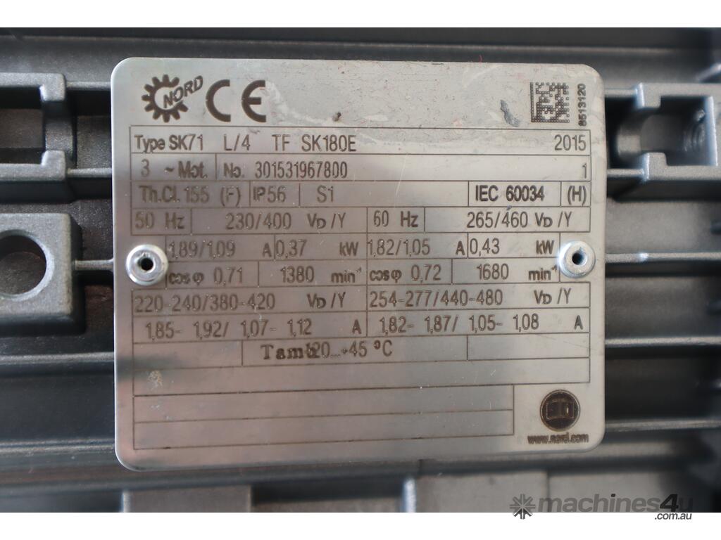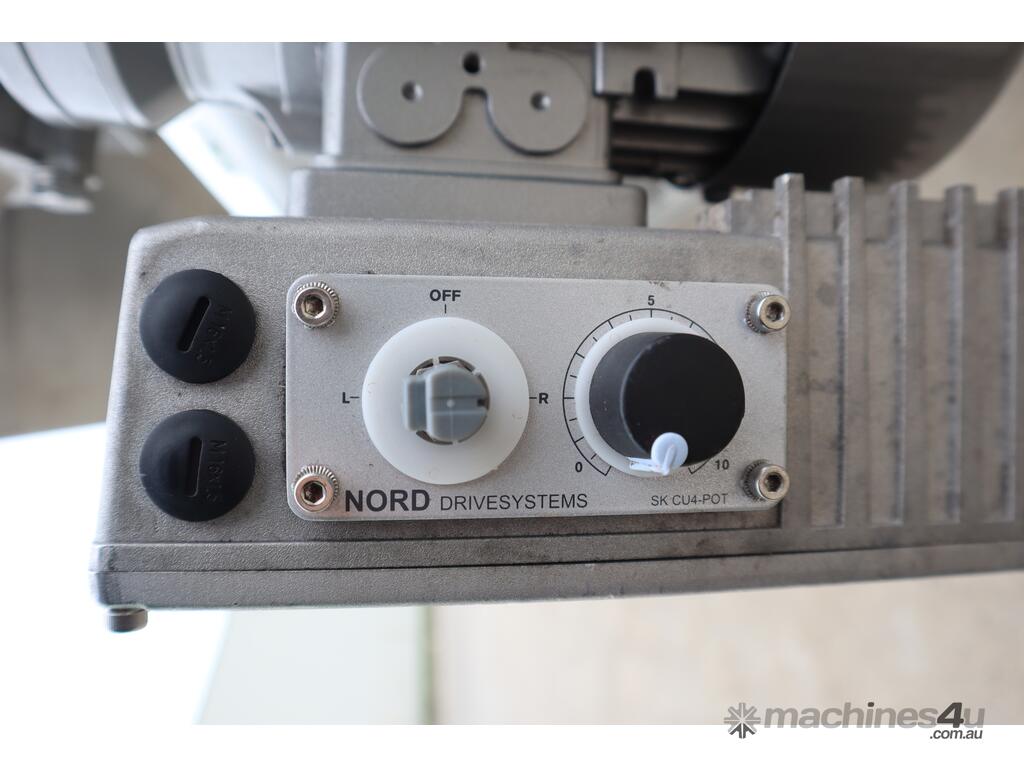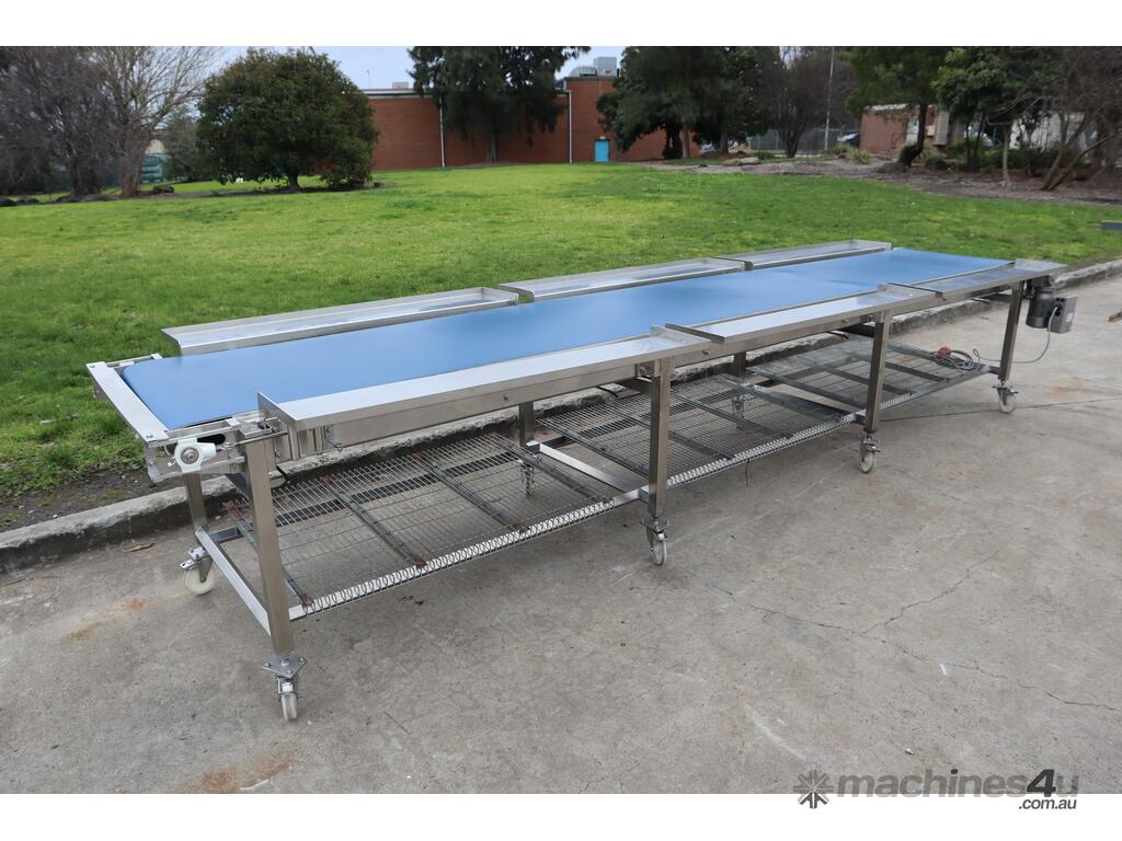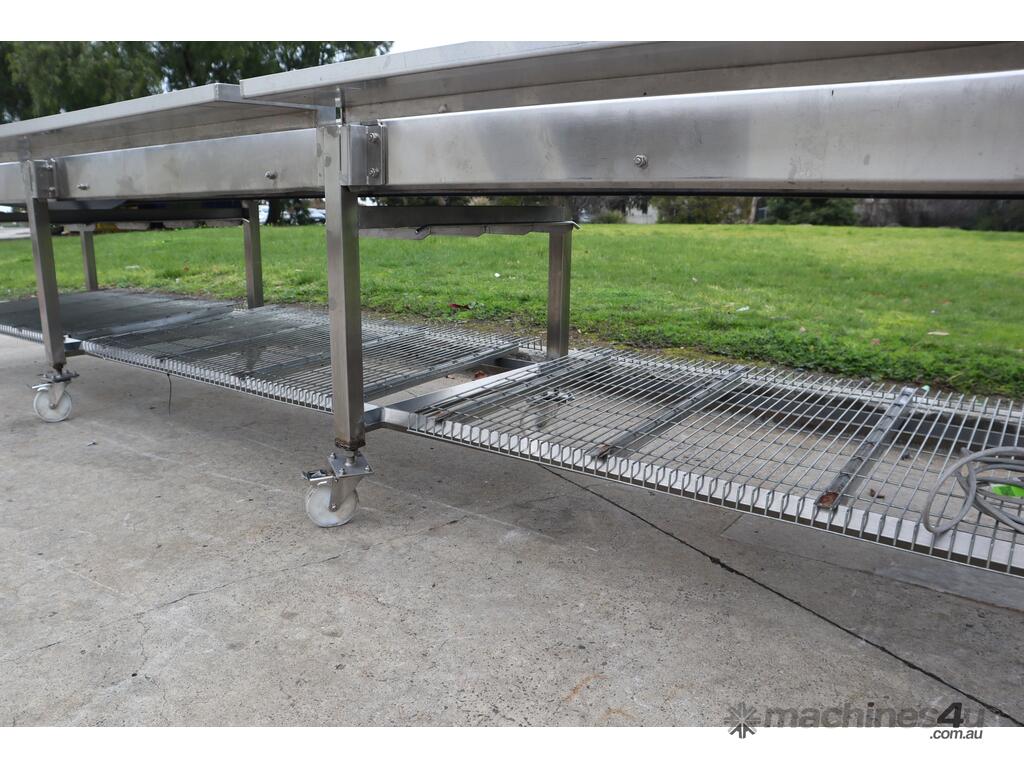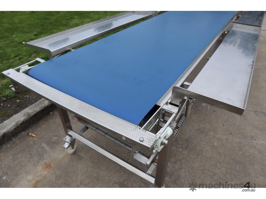 Motorised and with a stainless steel frame, this conveyor is in excellent condition. It comes with stainless steel trays that can be mounted on the sides and has a VSD installed.