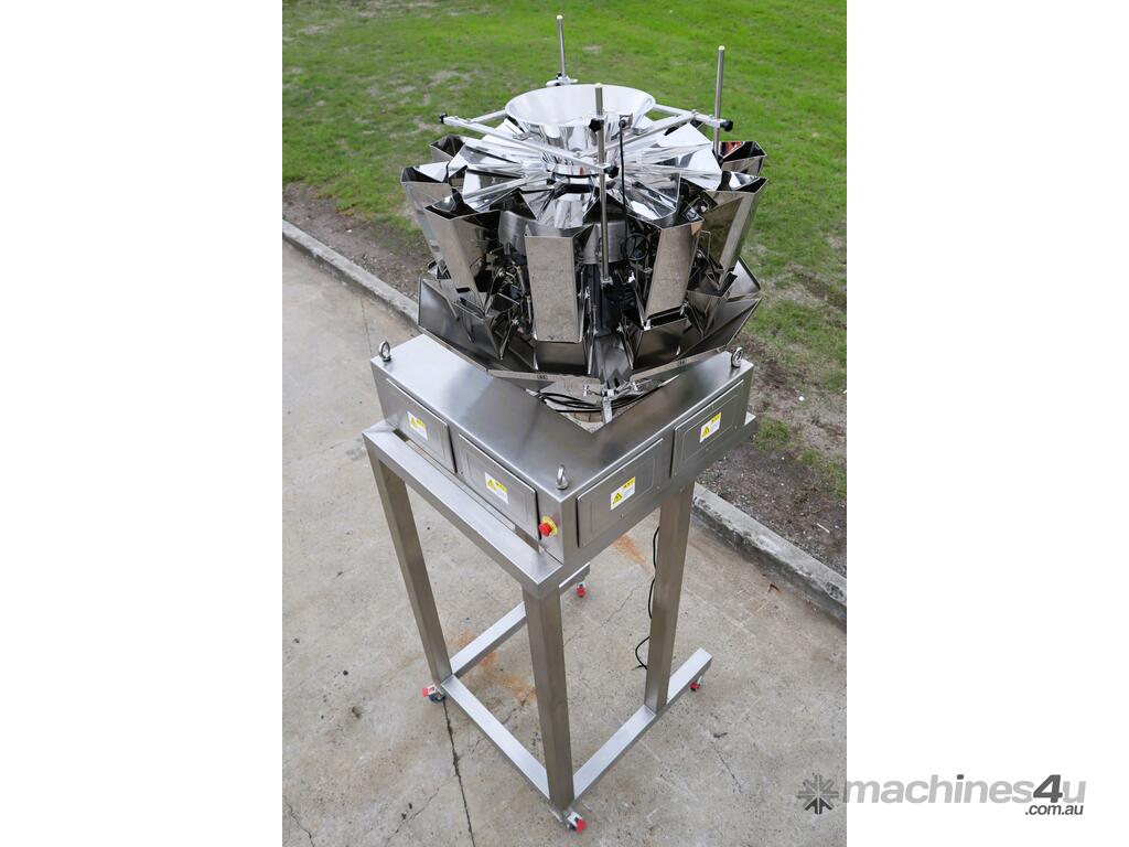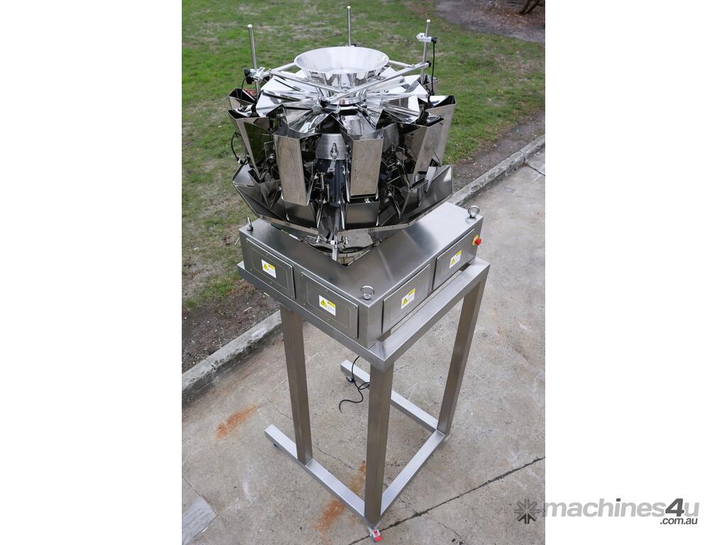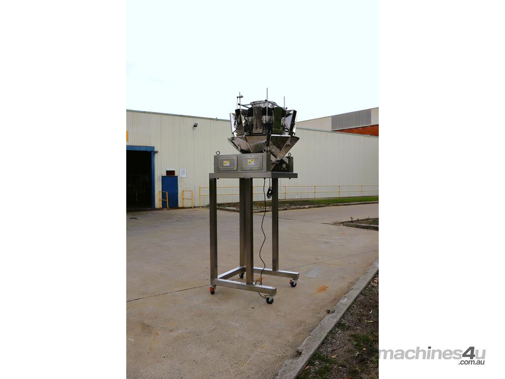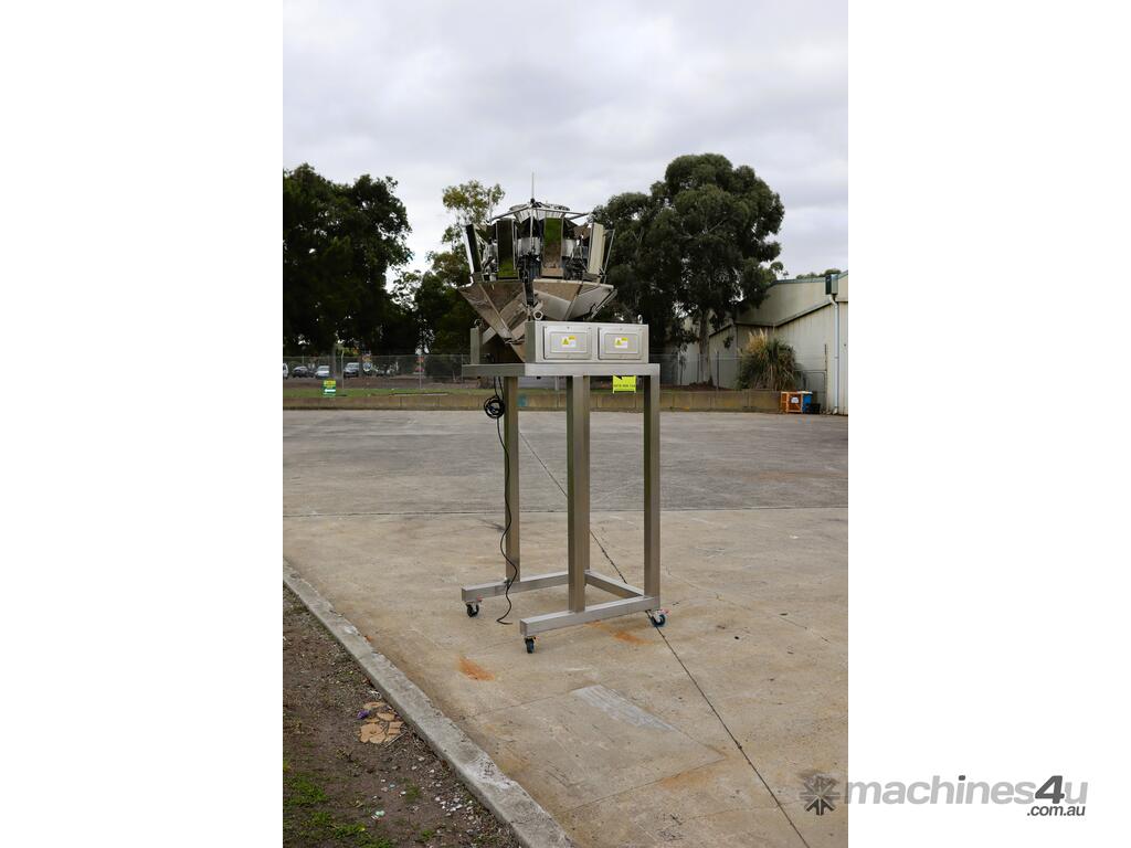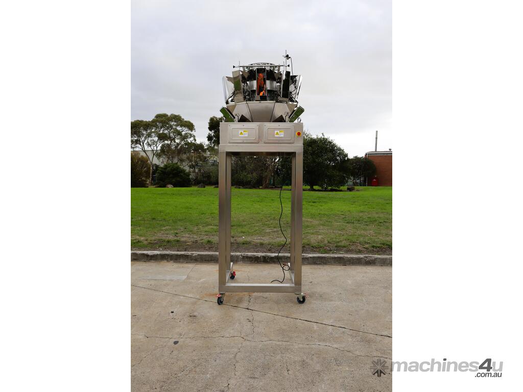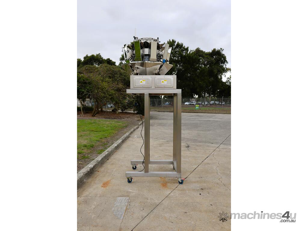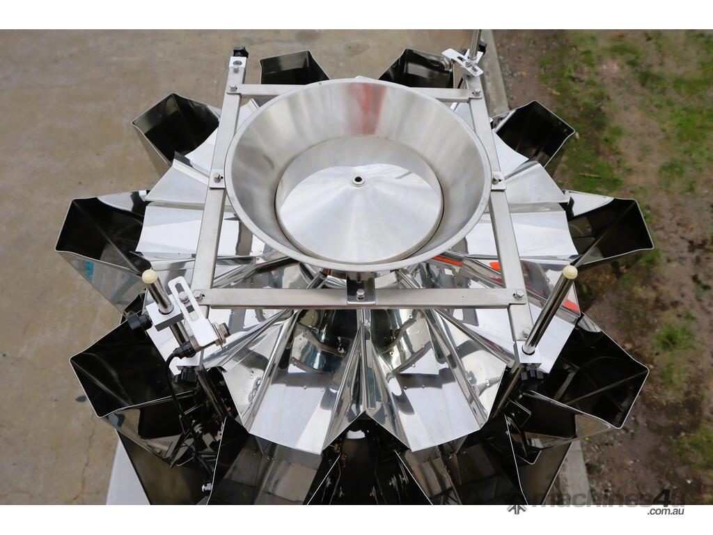 This multihead weigher unit in excellent condition. Made of stainless steel, it features 10 Weigh Heads and is suitable for the weighing of granules, irregular shape materials such as candy, seed, jelly, fries, coffee granule, peanut, puffy food, biscuit, chocolate, nut, yogurt pet food, frozen foods, etc.