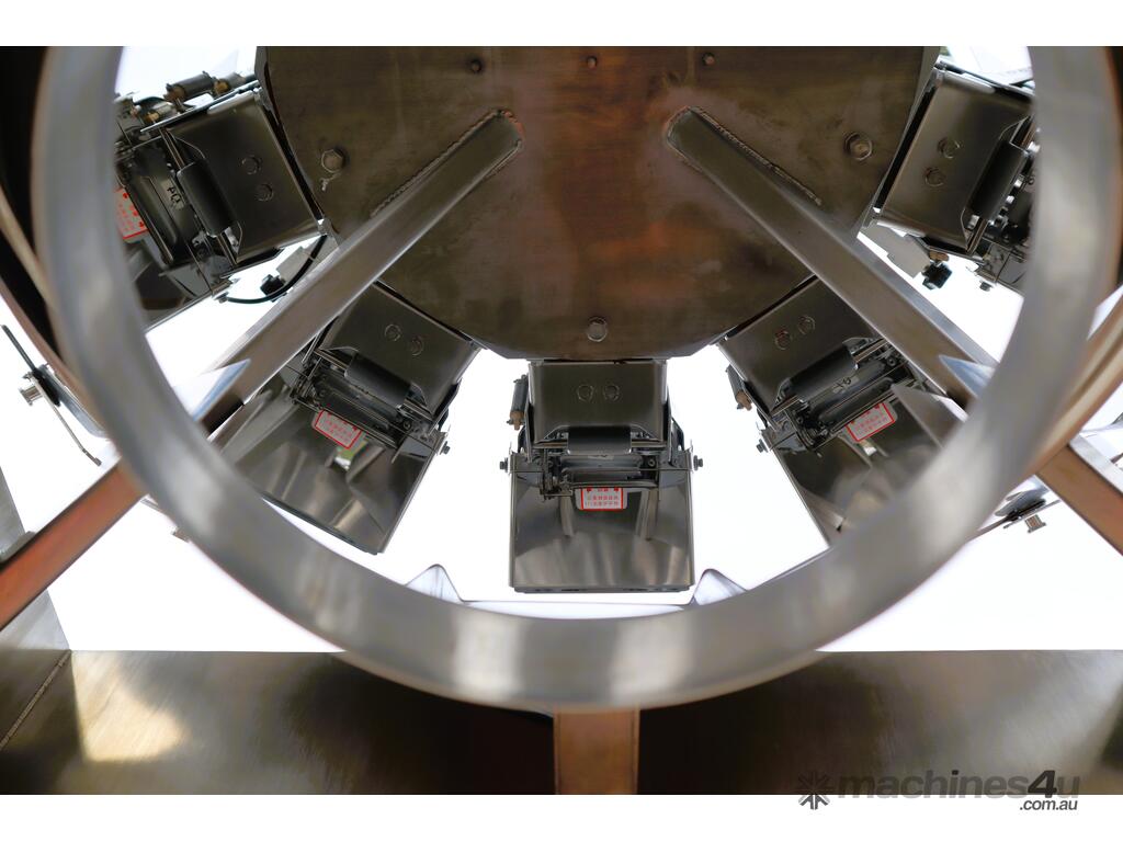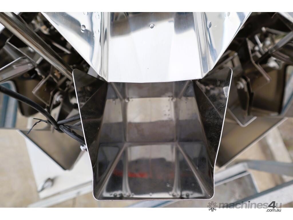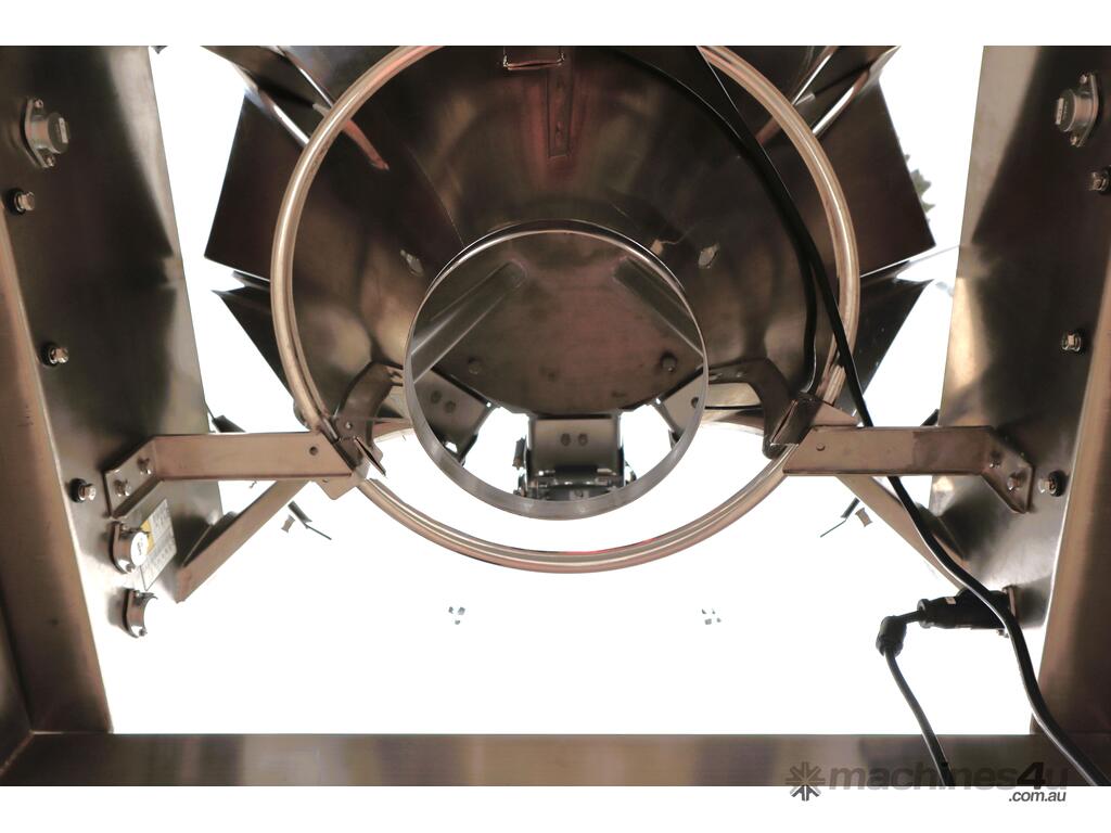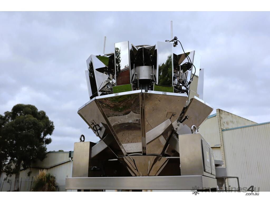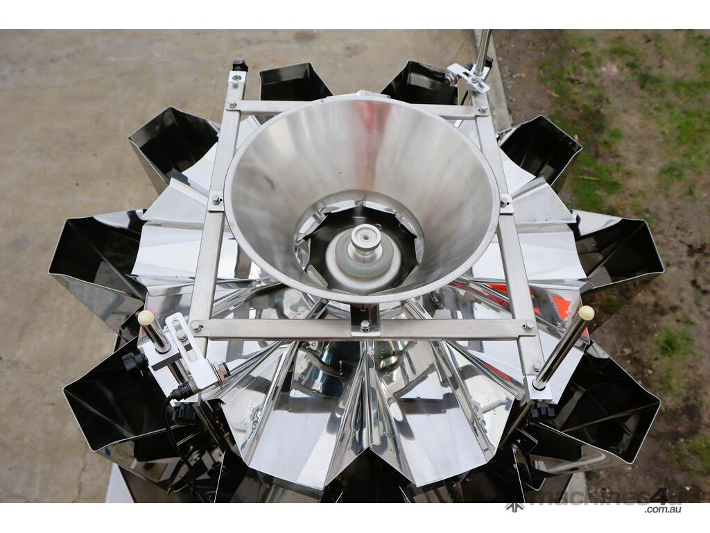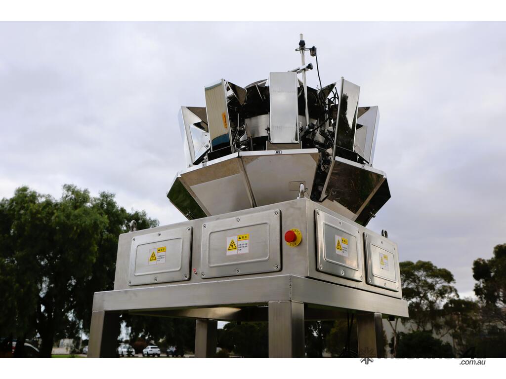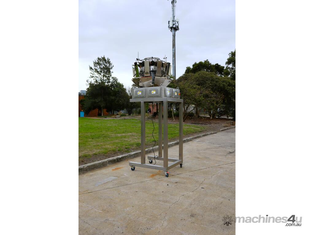 This multihead weigher unit in excellent condition. Made of stainless steel, it features 10 Weigh Heads and is suitable for the weighing of granules, irregular shape materials such as candy, seed, jelly, fries, coffee granule, peanut, puffy food, biscuit, chocolate, nut, yogurt pet food, frozen foods, etc.