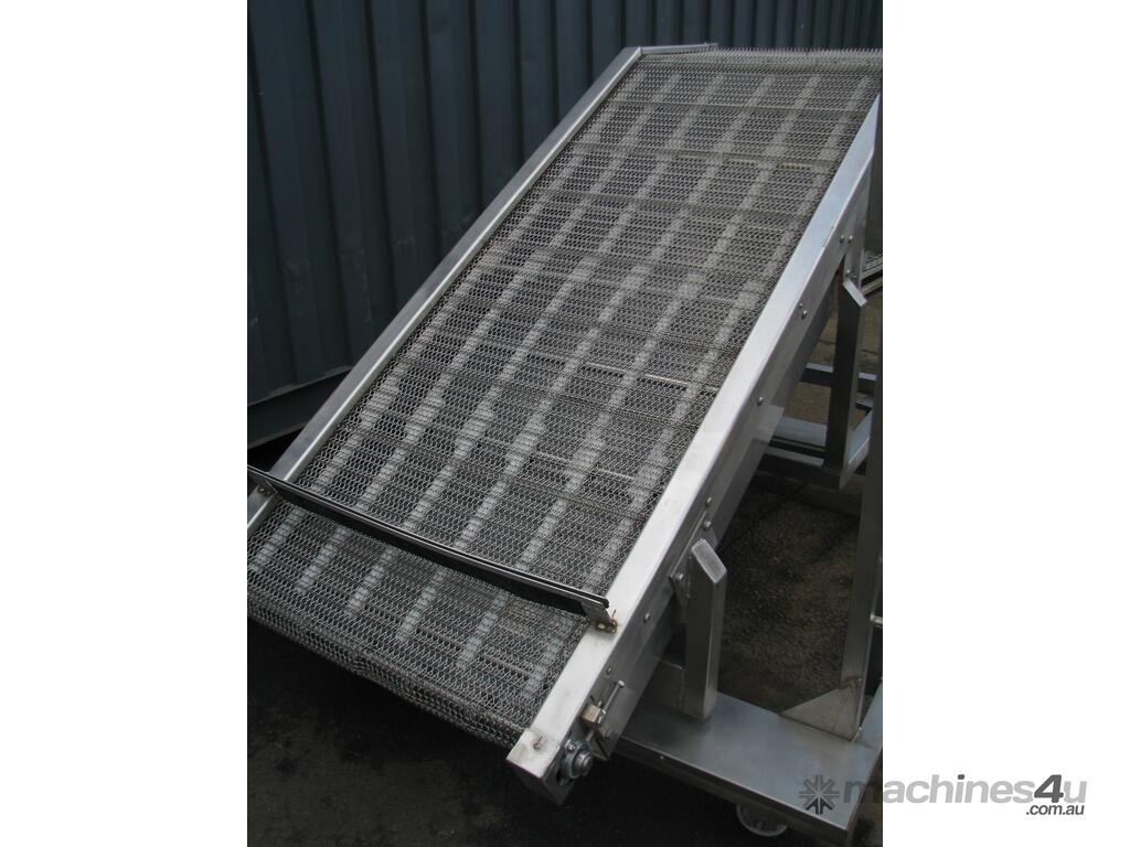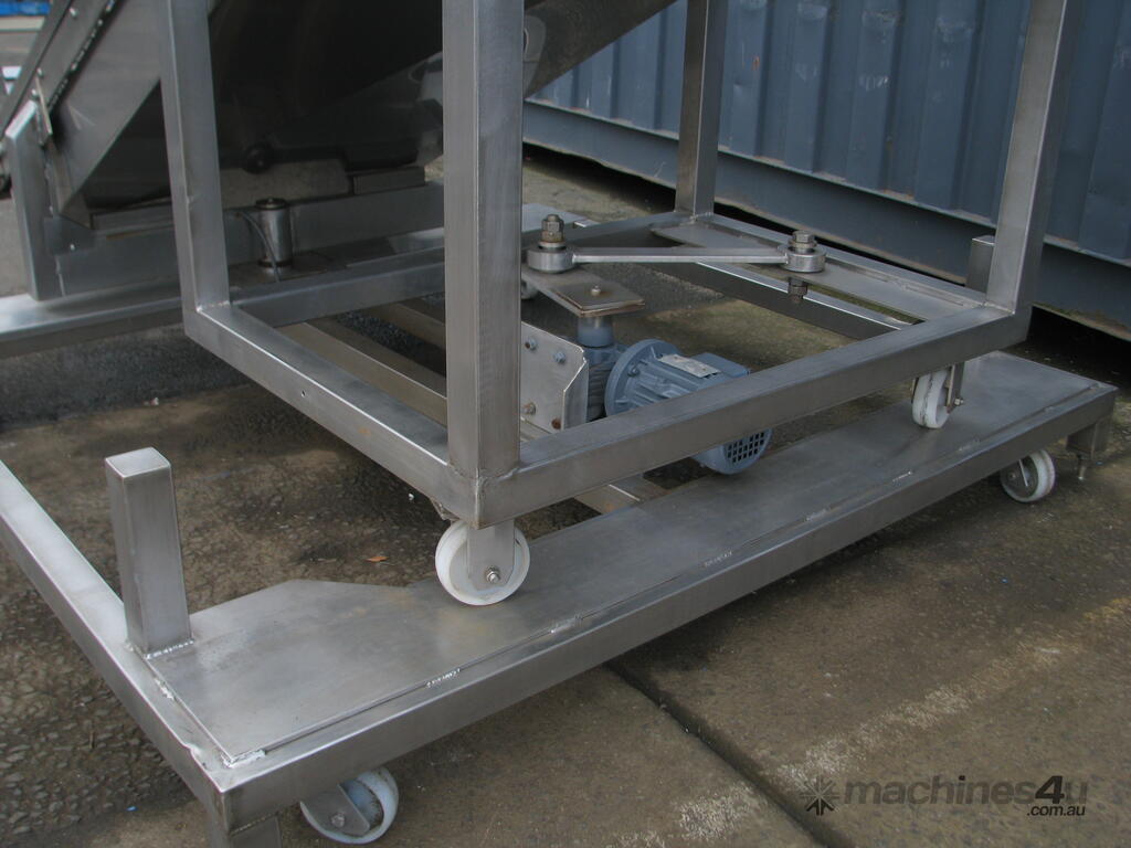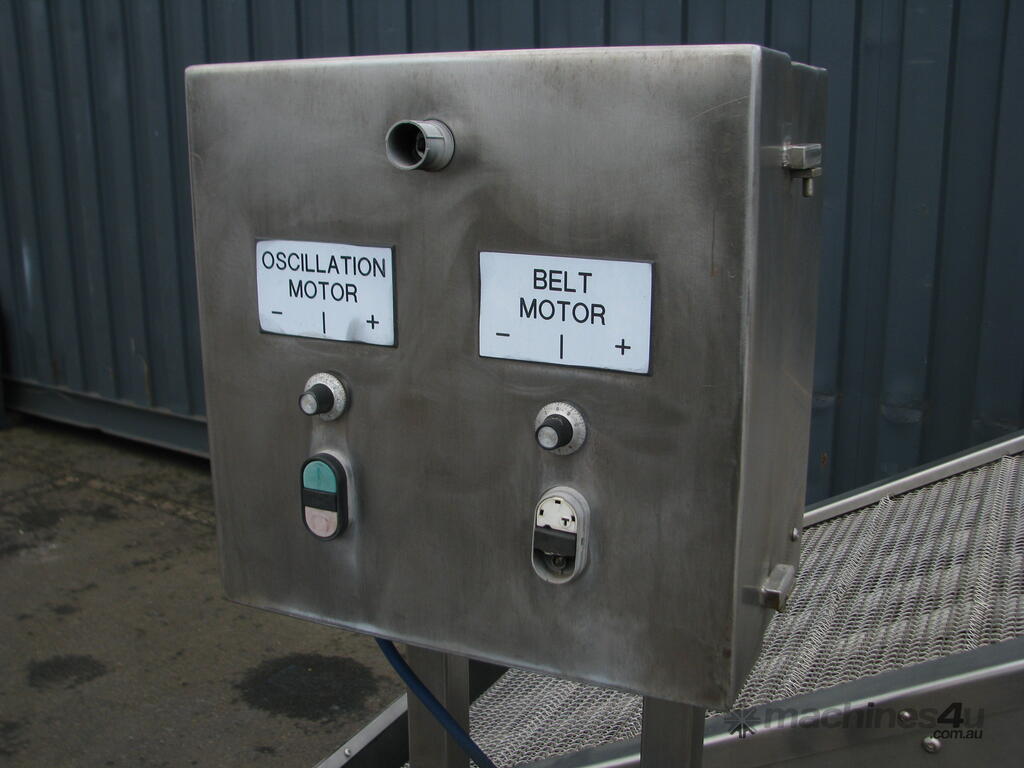 The conveyor oscillates (swings side to side on a pivot) to spread contents onto a wider conveyor.