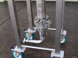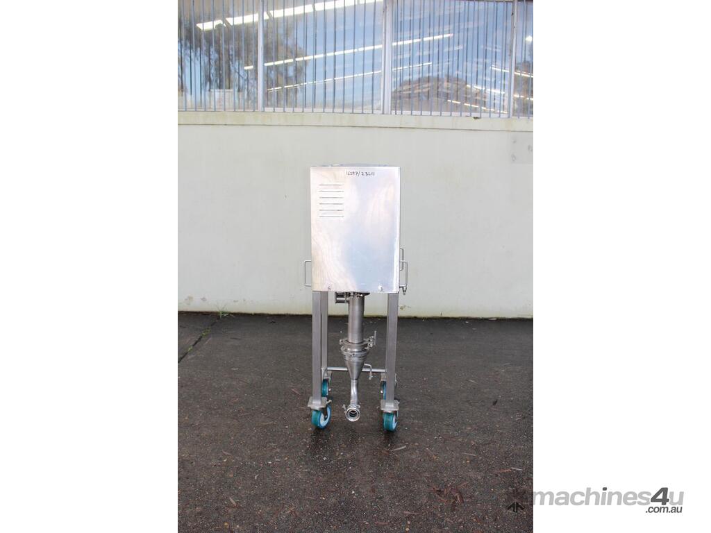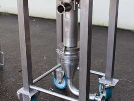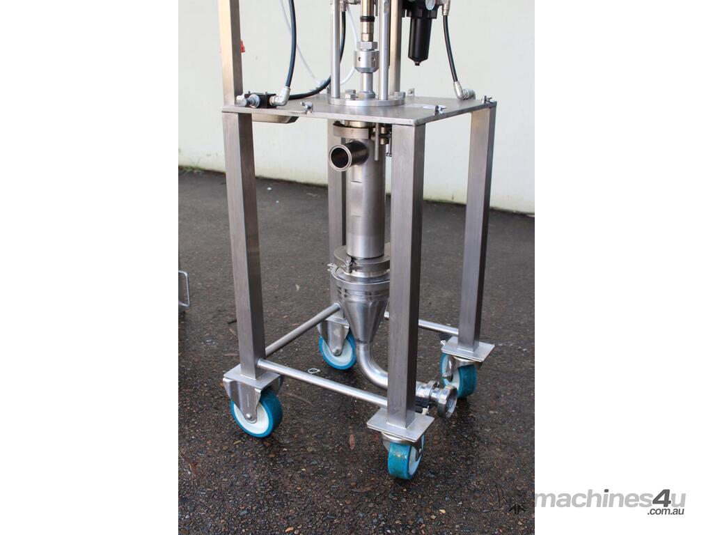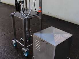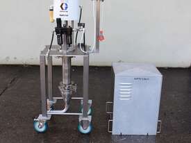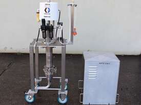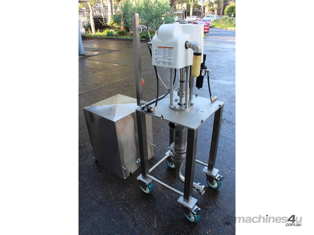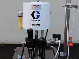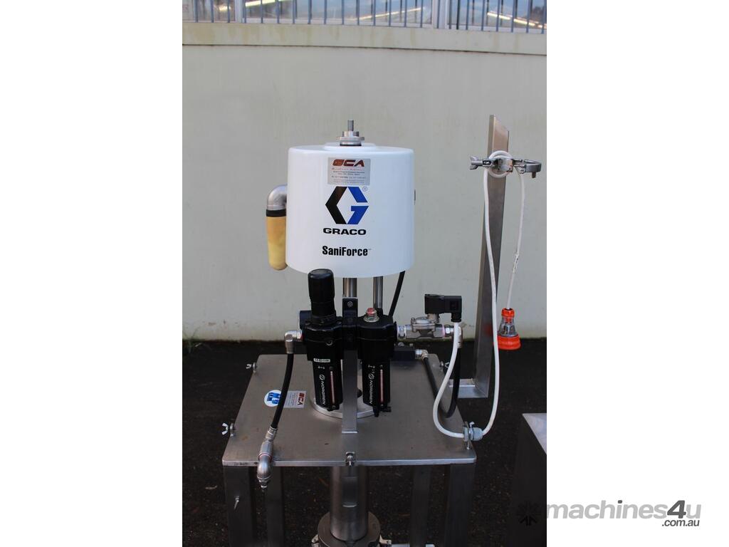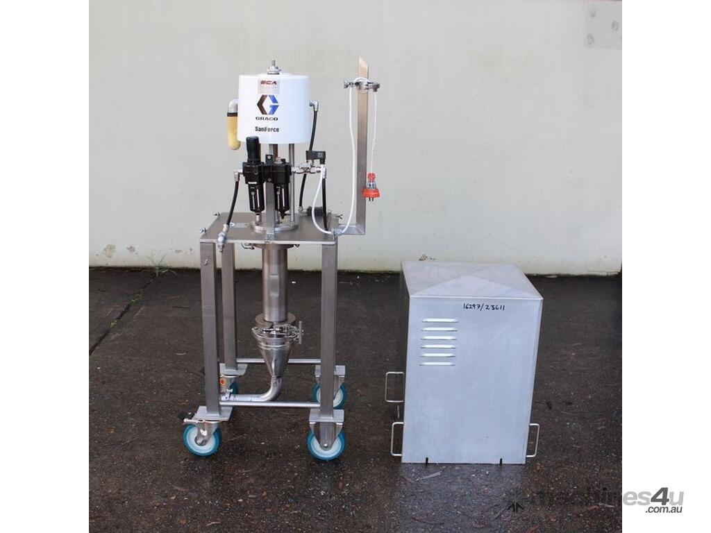 Graco SaniForce 12:1 Transfer Pump: Flow rates up to 8.5 gpm (32 lpm), maximum fluid pressures up to 1200 psi (83 bar, 8.3 MPa), suitable for high viscous material, Suitable to pump products such as: cosmetics, fruit juice concentrates, creamy candy fillings, ice cream variegates, jams and jellies, fitted with electrical air valve, set up on high grade stainless steel trolley with a stainless cover