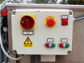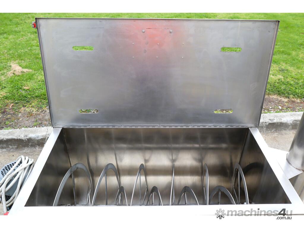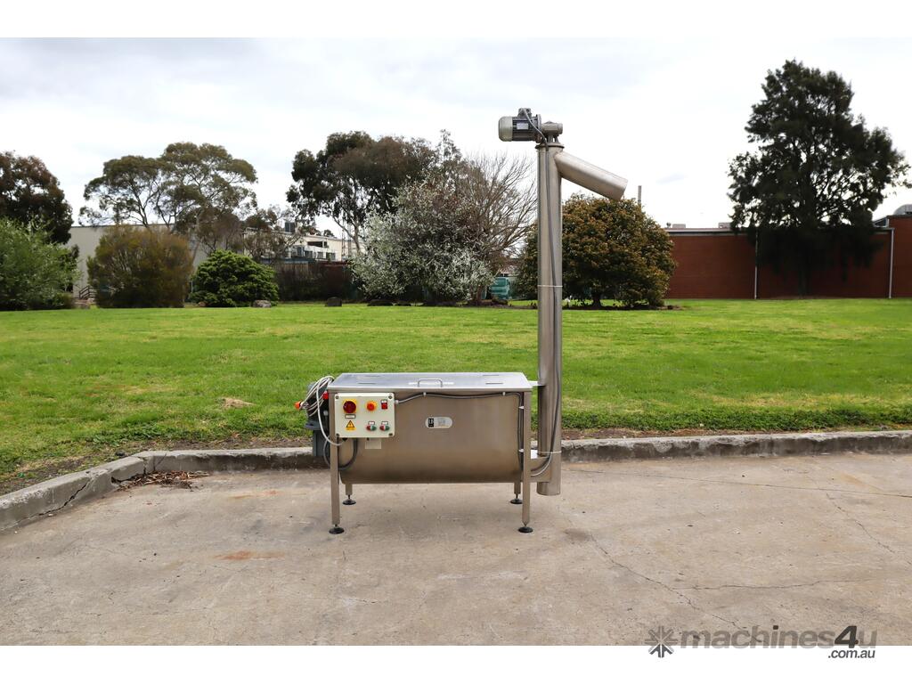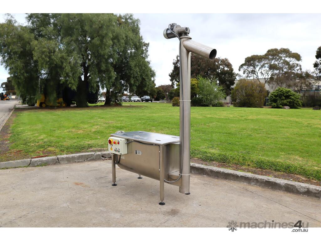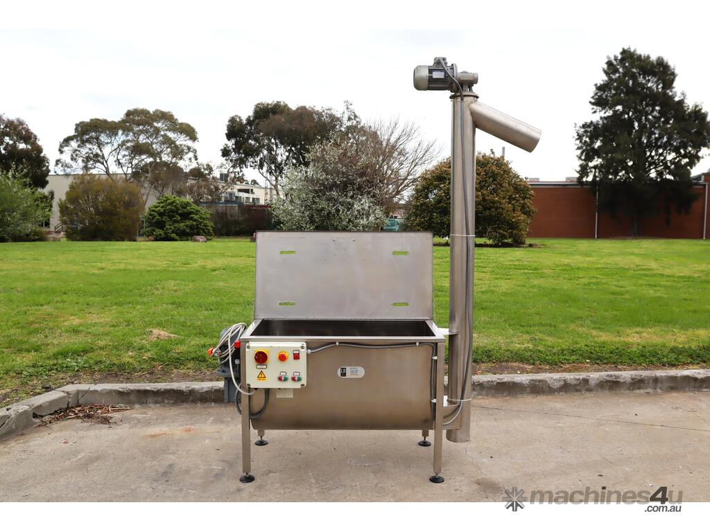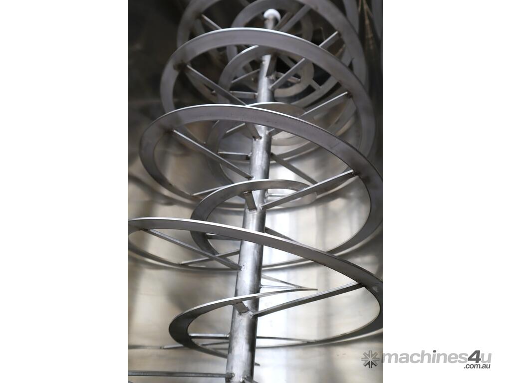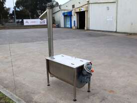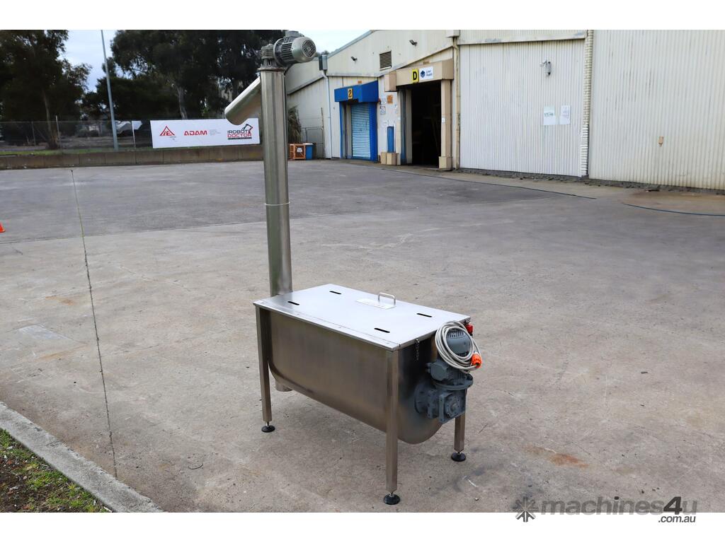 The tank is fitted with a horizontal ribbon mixer for consistent mixing performance, while the integrated screw auger makes product transfer efficient and hands free. Equipped with a motor and full control panel with emergency stop, this unit is designed for continuous duty in demanding environments. The strong frame and polished stainless steel tank ensure durability, easy cleaning, and long service life.