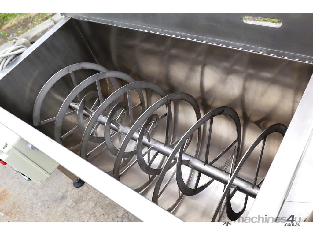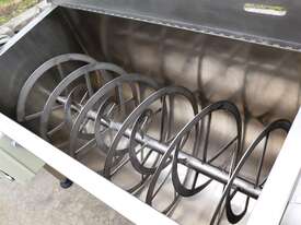 Robust and versatile stainless steel ribbon mixer with screw auger, built by Built by LB Italia SRL Pasta Machines. For reliable blending and discharge of powders, granules, and semi-dry materials etc.