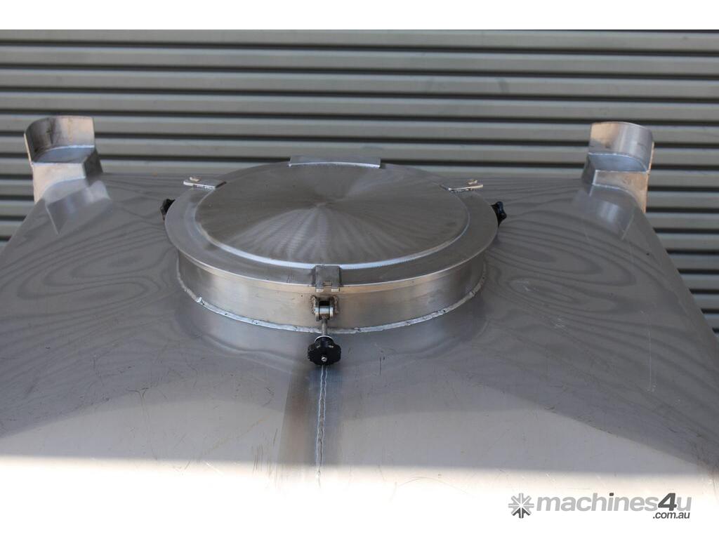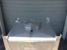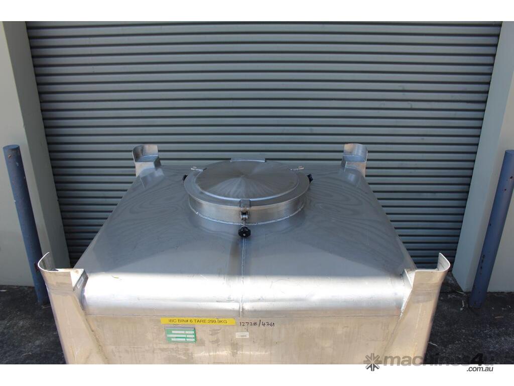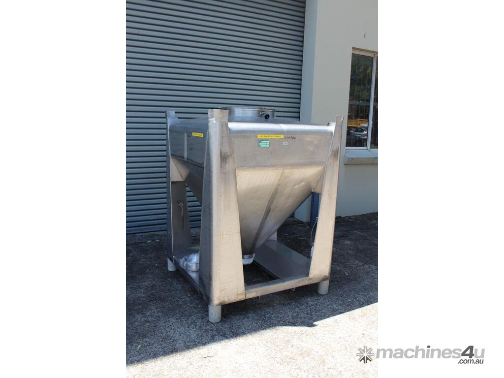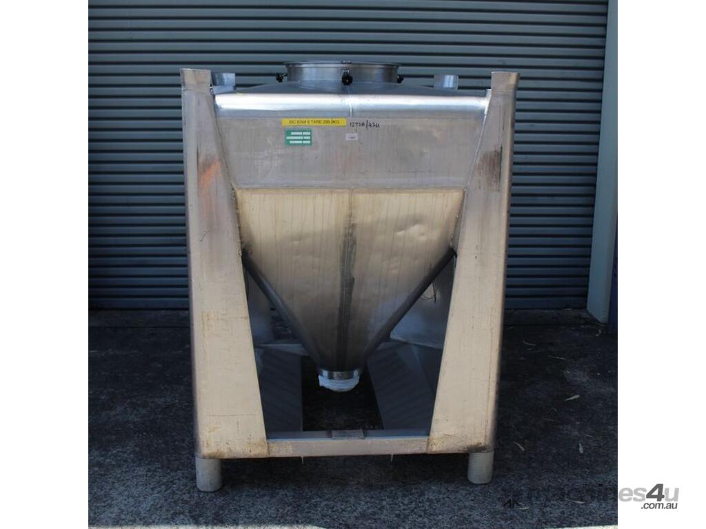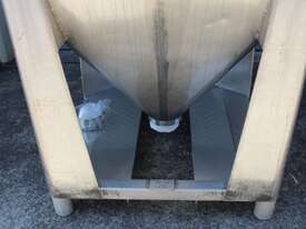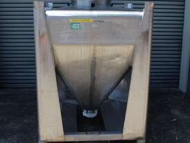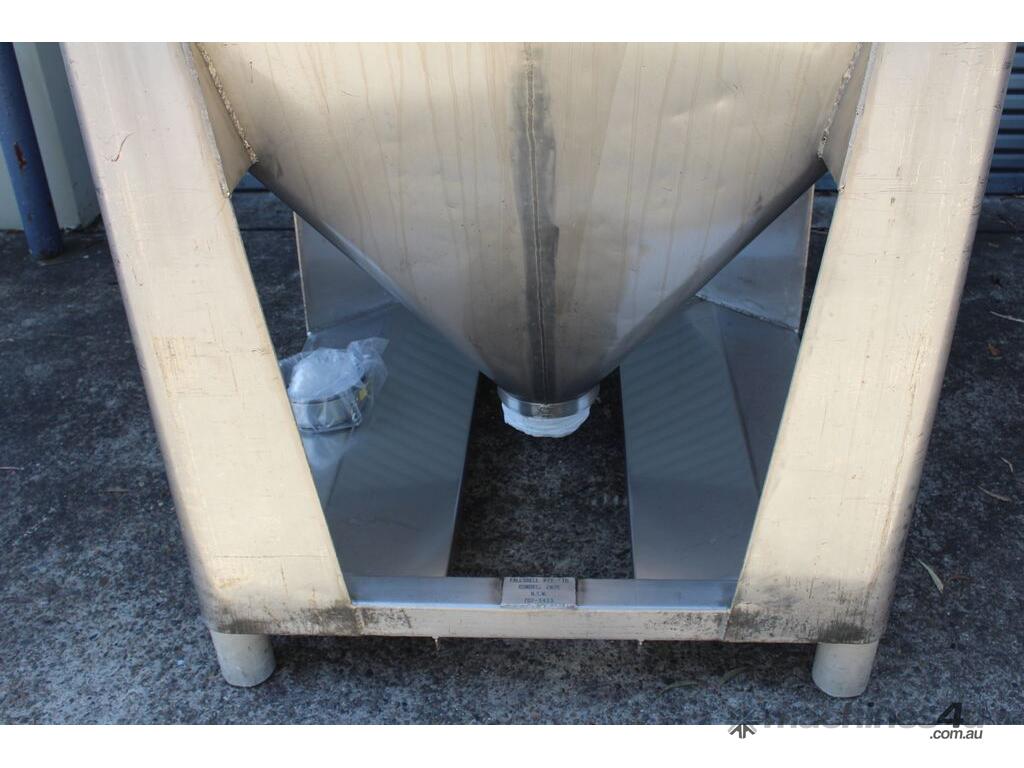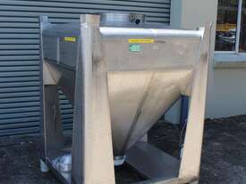 Stainless Steel Stackable Hopper, "Fallsdell", Capacity: 700L, 1200mm x 1200mm x 280mm deep straight wall with a 900mm deep cone, overall height 1650mm, totally enclosed with manway, conical bottom with a 180mm dia centre bottom outlet, stainless steel frame, SS316
