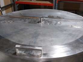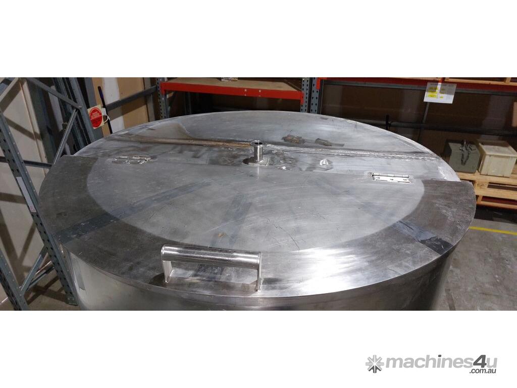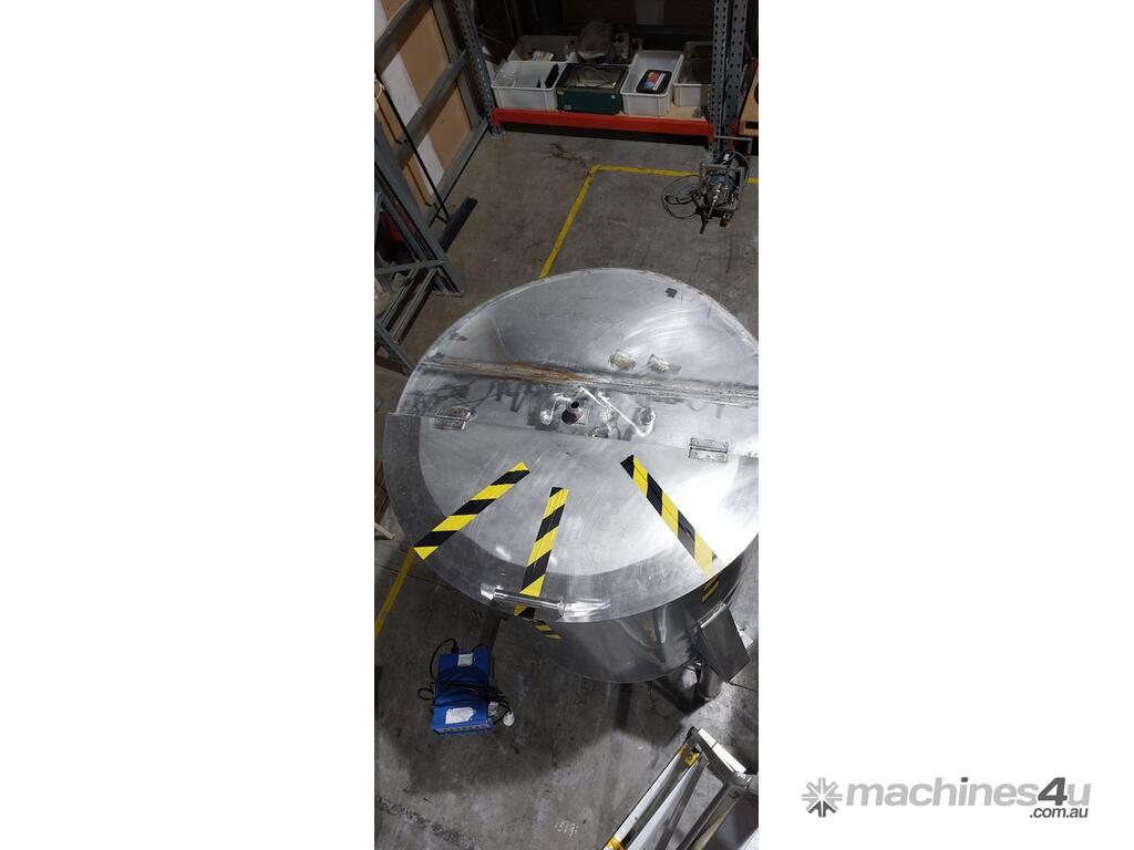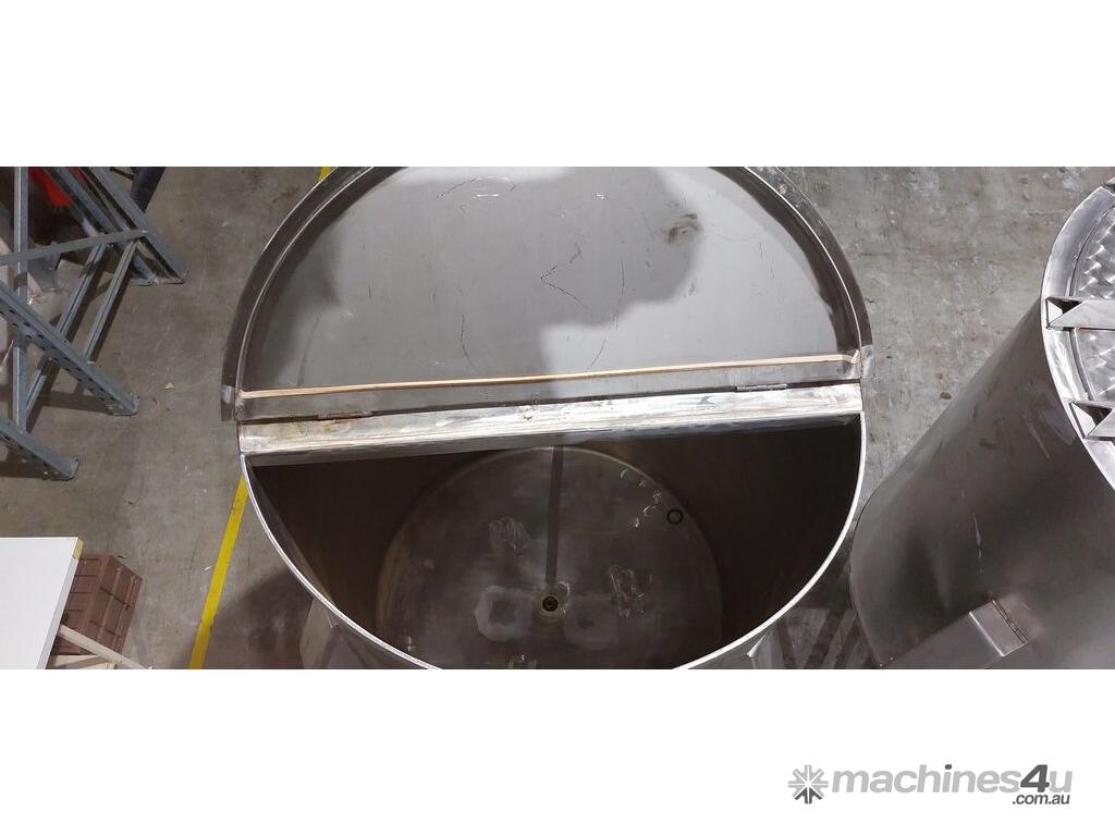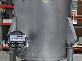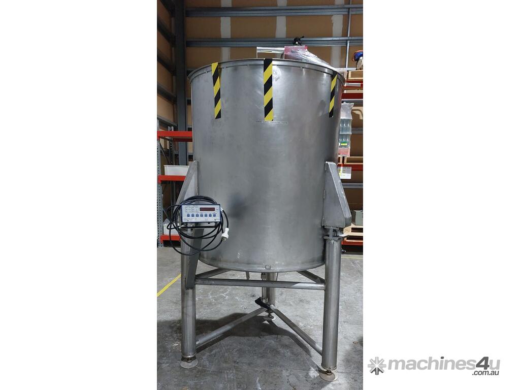 Stainless Steel Tank, 1000 litre capacity, fitted with 1000kg load cells, half-hinged lid, tri-clover fittings for inlet and outlet connections, butterfly valve on outlet, adjustable sediment pipe on outlet (optional use), adjustable legs, ideal for food, pharmaceutical and chemical processing applications