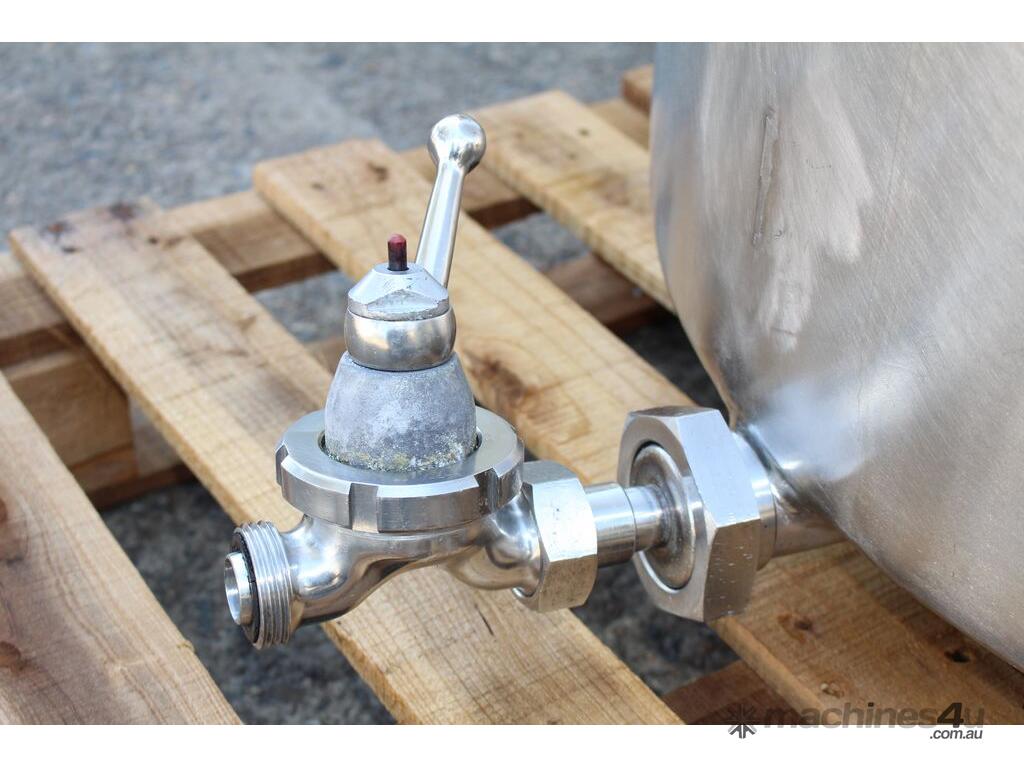 Stainless Steel Tank, capacity 500L, internal dimensions: 850mm dia x 860mm deep, open top, sloping bottom to a 20mm dia side bottom outlet with valve, overall height 1040mm, three welded tubular legs