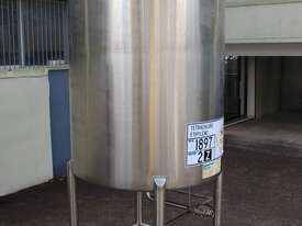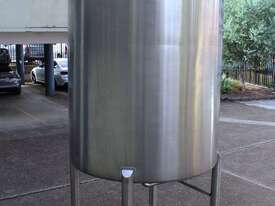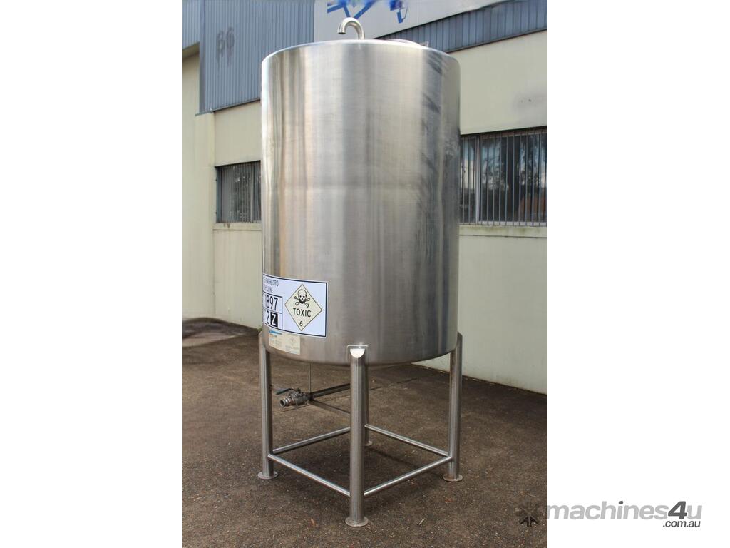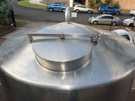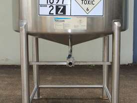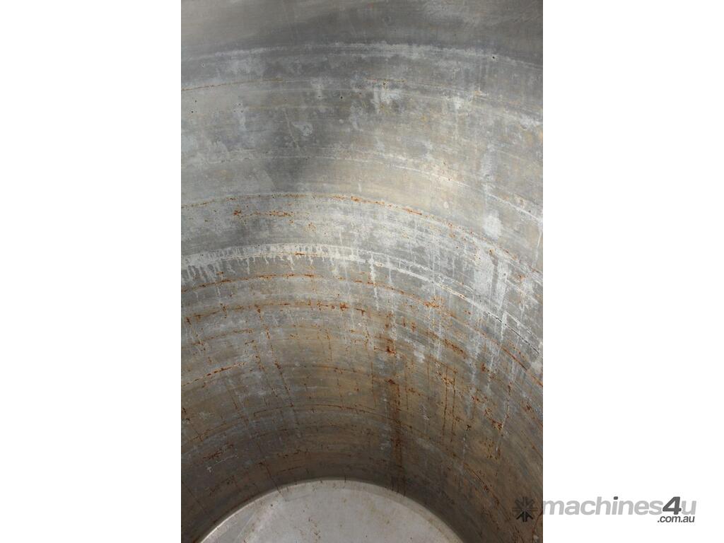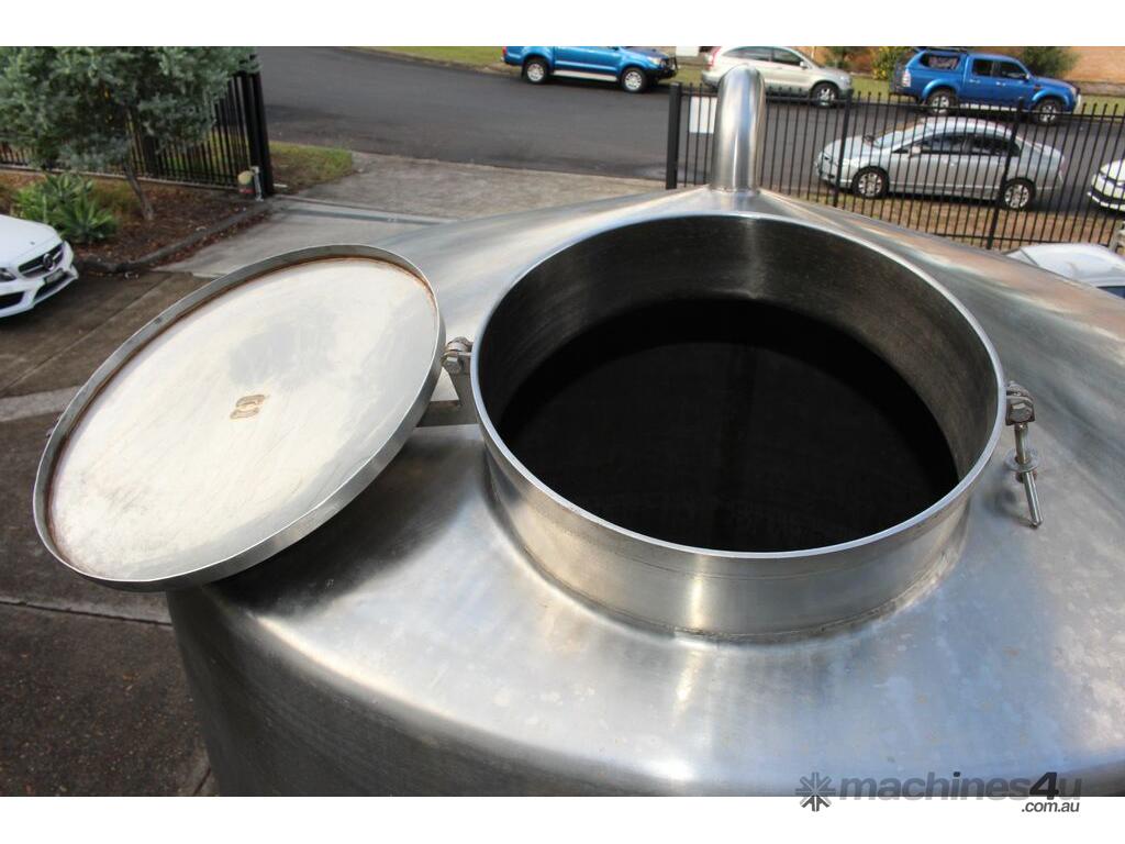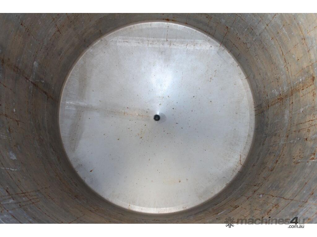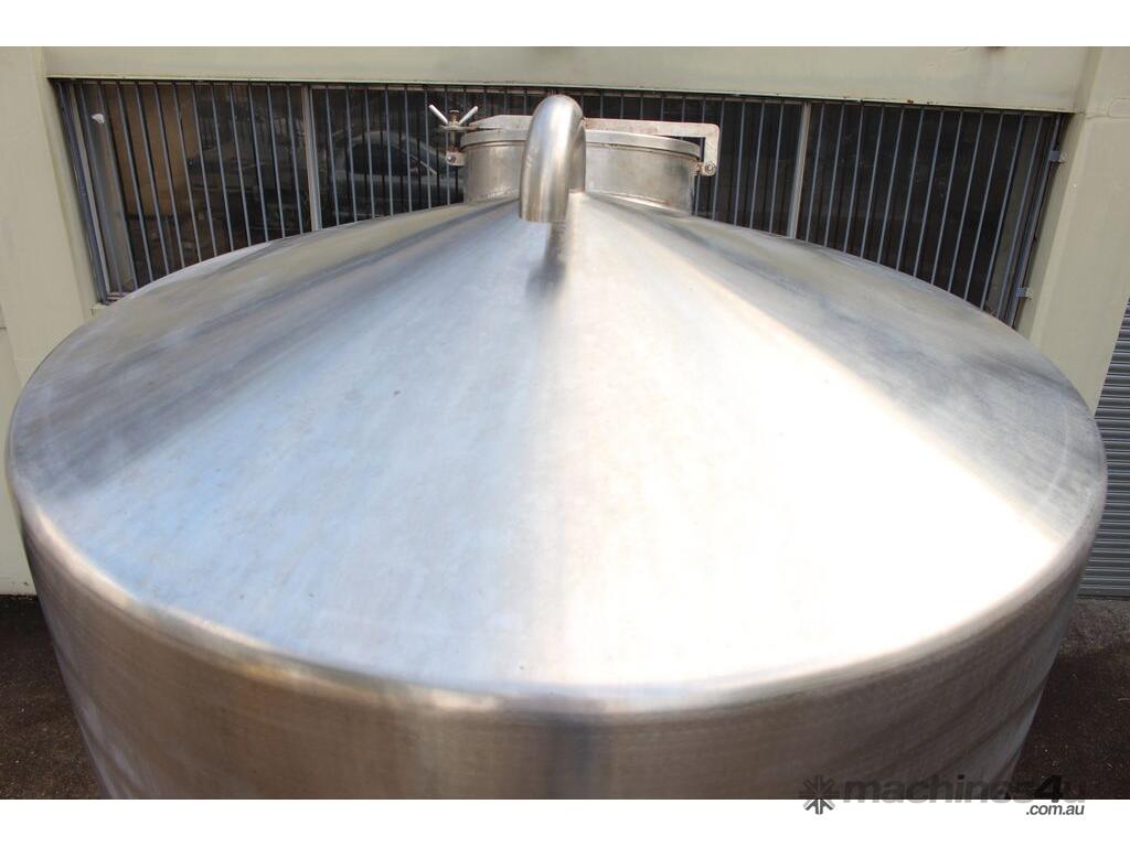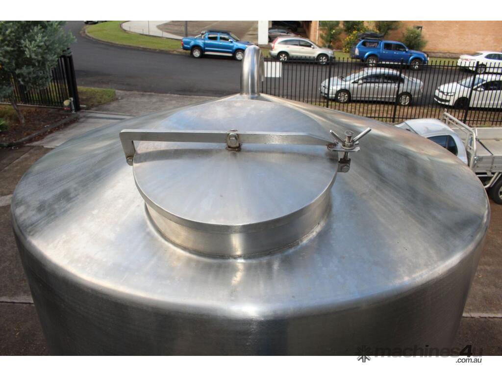 Stainless Steel Tank, capacity 4500L, internal dimensions: 1600mm dia x 2200mm deep, totally enclosed with 450mm dia manway, conical bottom leading to a 50mm diameter side outlet with a stainless steel valve positioned at 820mm from the bottom, 4 x stainless steel tubular legs, overall tank height 3800mm
