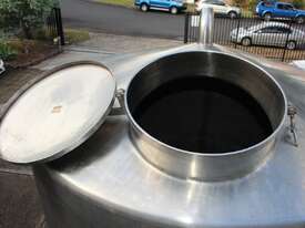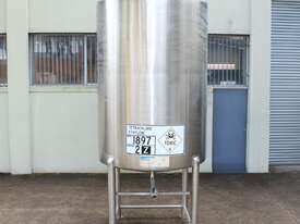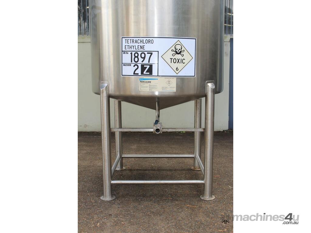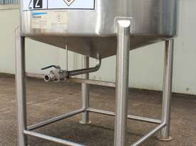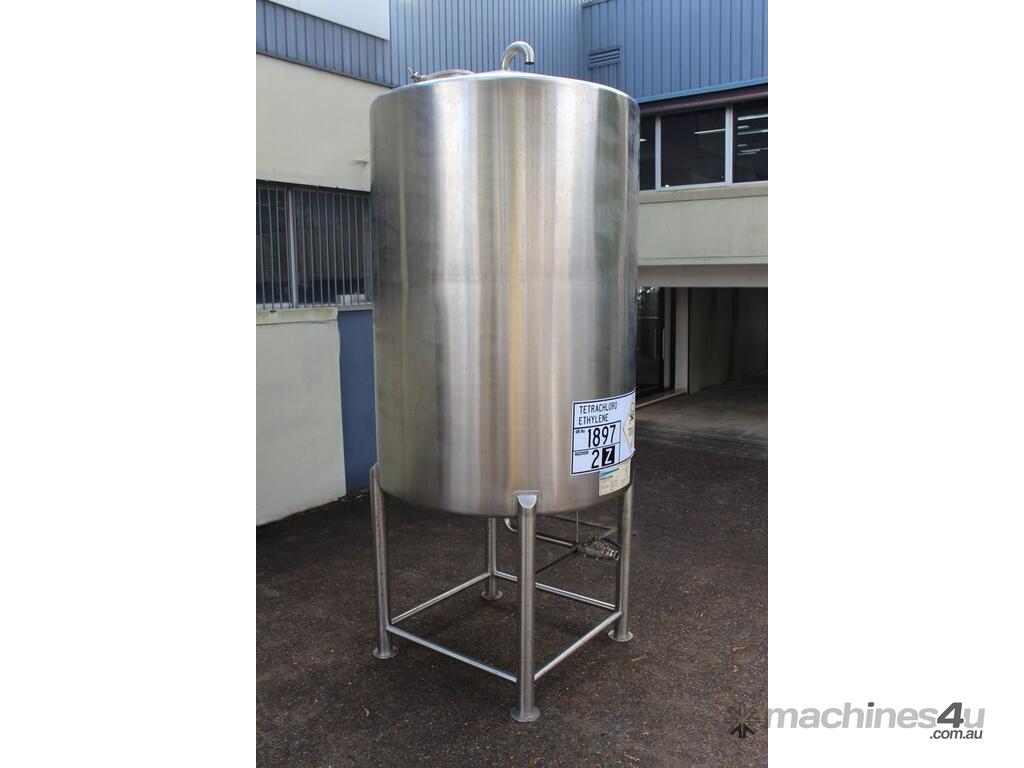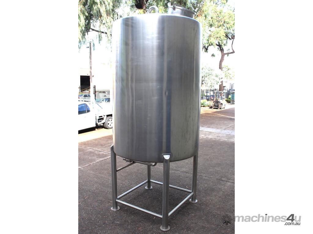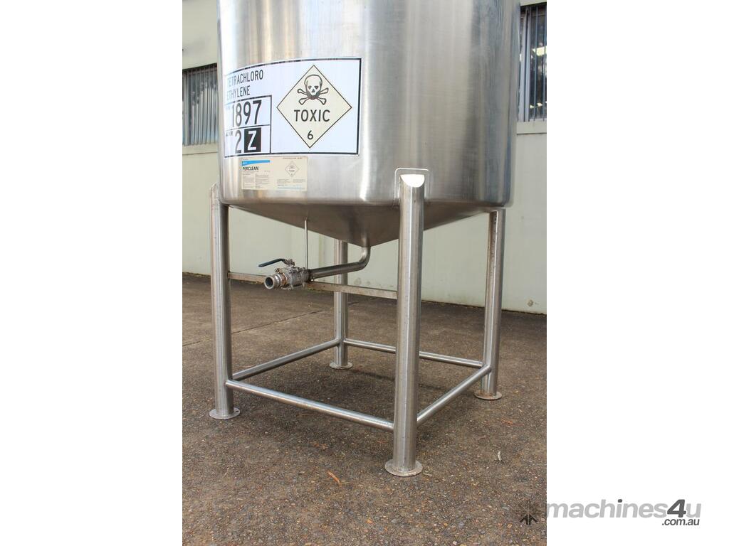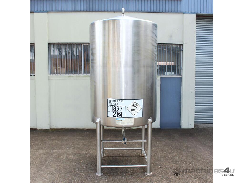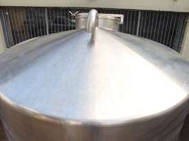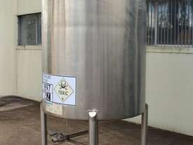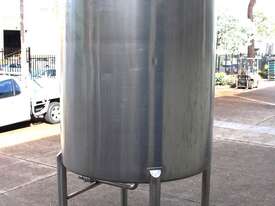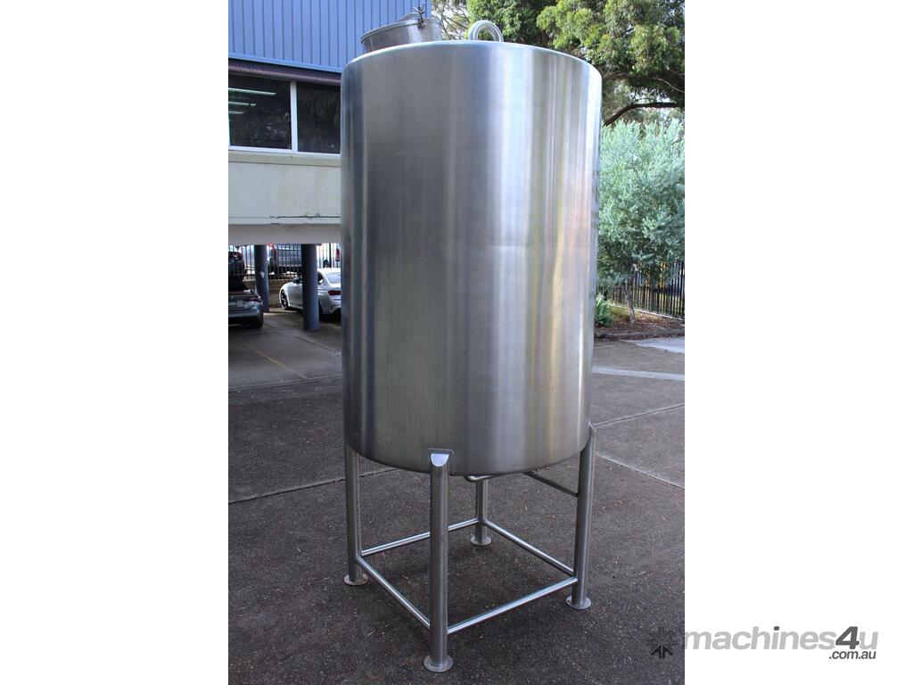 Stainless Steel Tank, capacity 4500L, internal dimensions: 1600mm dia x 2200mm deep, totally enclosed with 450mm dia manway, conical bottom leading to a 50mm diameter side outlet with a stainless steel valve positioned at 820mm from the bottom, 4 x stainless steel tubular legs, overall tank height 3800mm