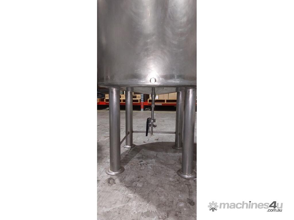 Stainless Steel Storage Vertical New, Capacity 500Lt, Dimension 850mm Dia x 1000mm H Tank has an open top with split hinged fixed lid. Tank is fitted with compensated mixing bracket to suit a clamp on liquid agitator. 15 degree conical bottom with 40mm centre discharge with BSP male fitting. Stainless steel polished legs with crossbracing on compensation pads. Legs have adjustable feet, locakable castor wheels can be fitted as an option. Material Grade Stainless Steel 304, 2B finish. Material Thickness 2mm walls cone. Overall Height 1520mm....